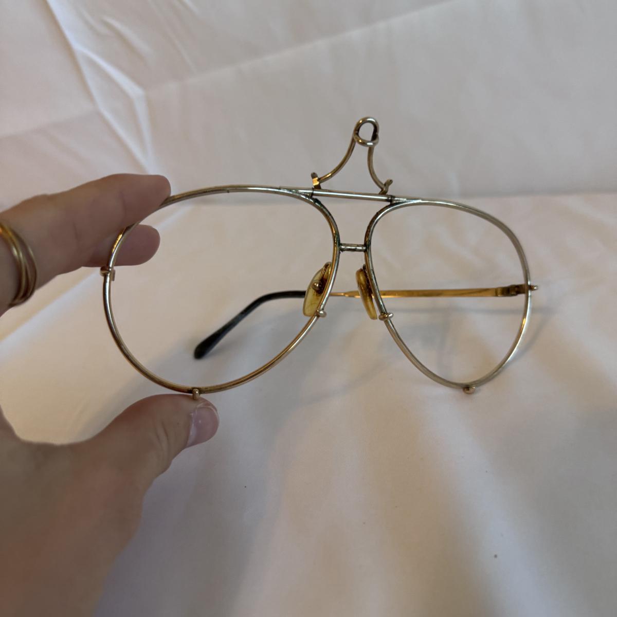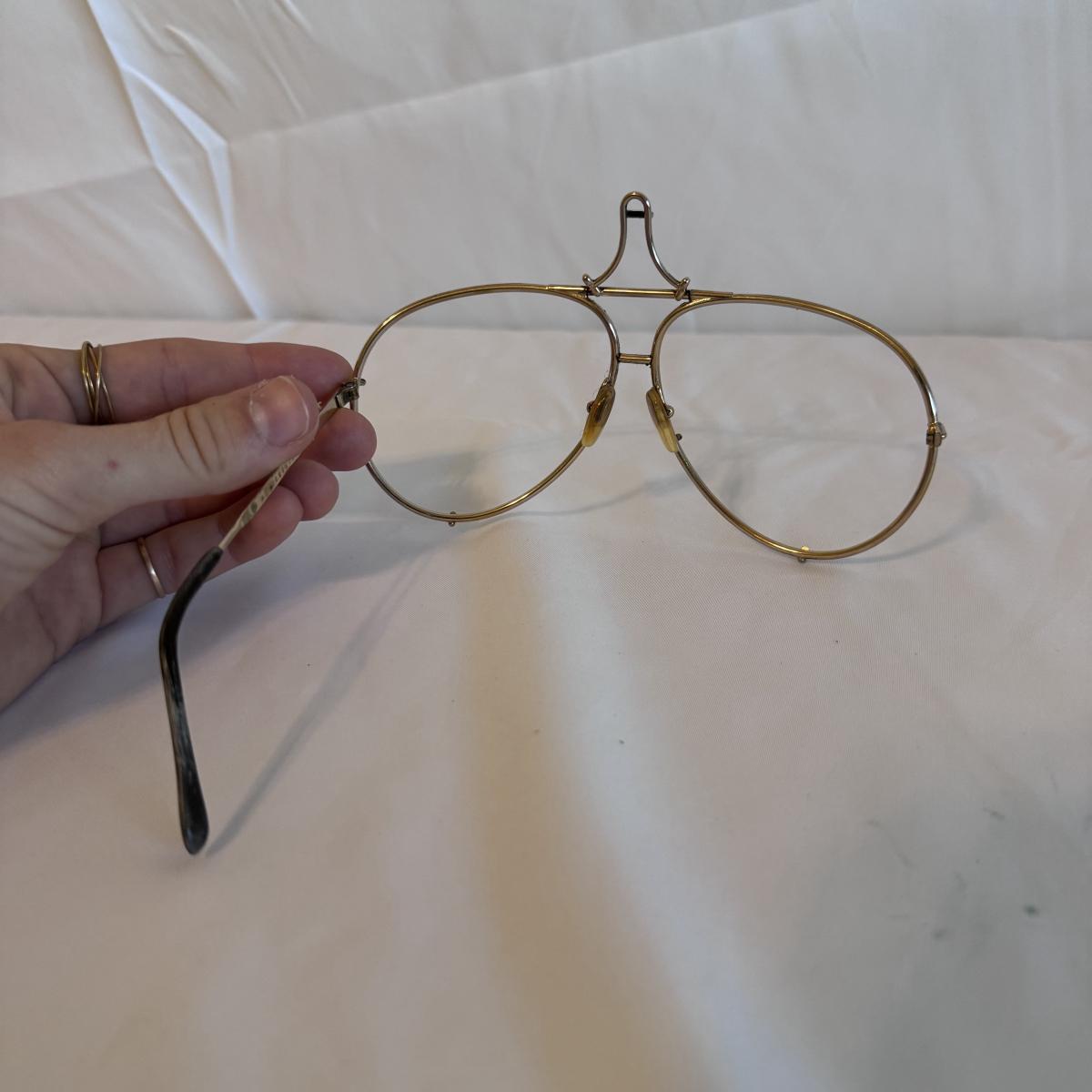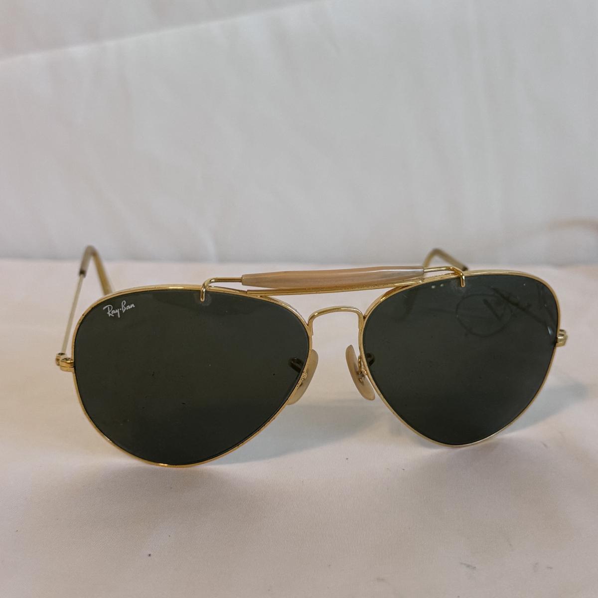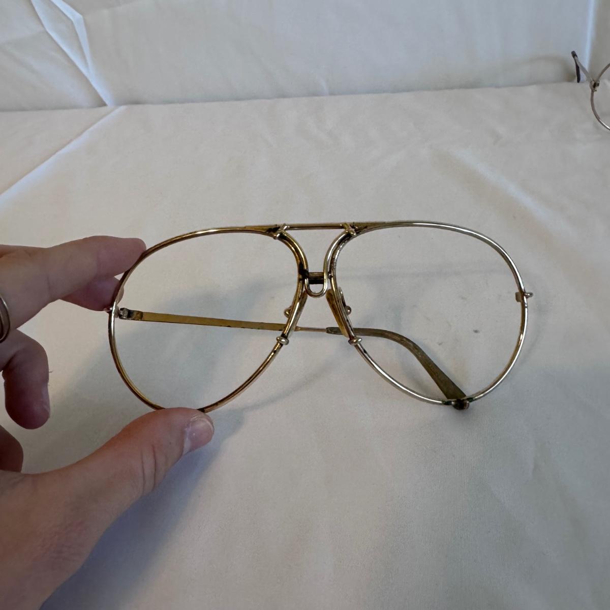 Lot includes one pair of Ray-Ban aviators, along with three gold-colored aviators. The three gold-colored aviators do not have markings and are missing their lenses. Two out of the three are missing one of their arms. Shipping available.