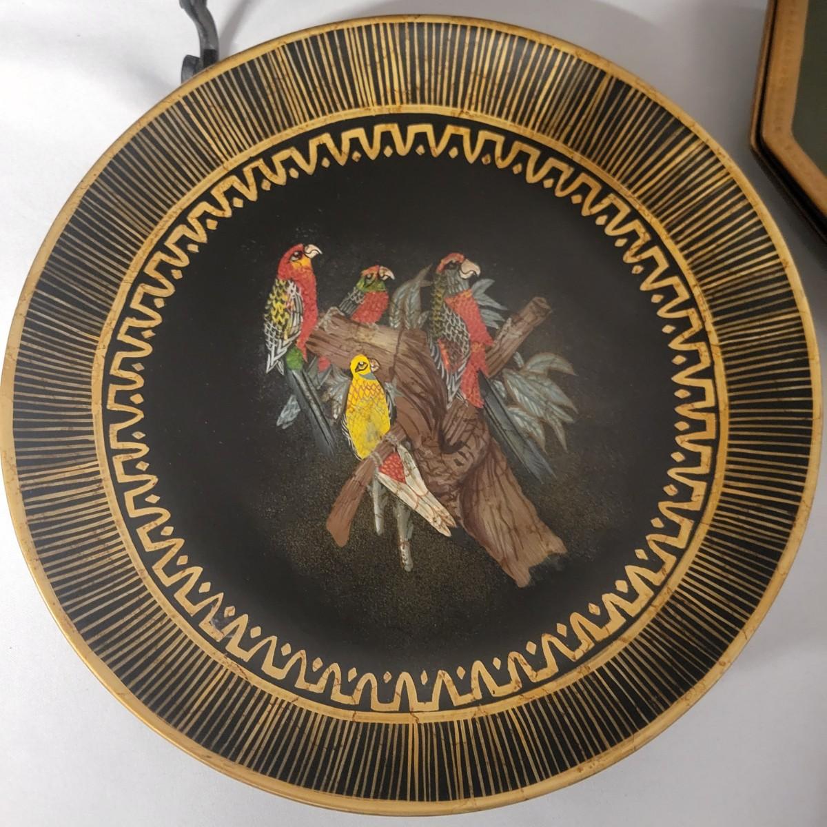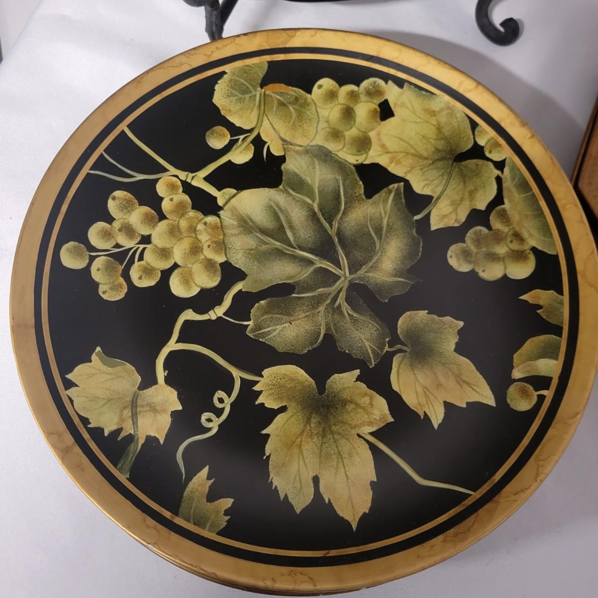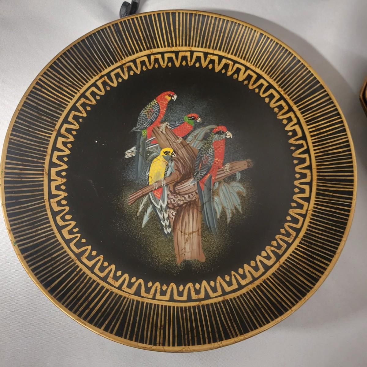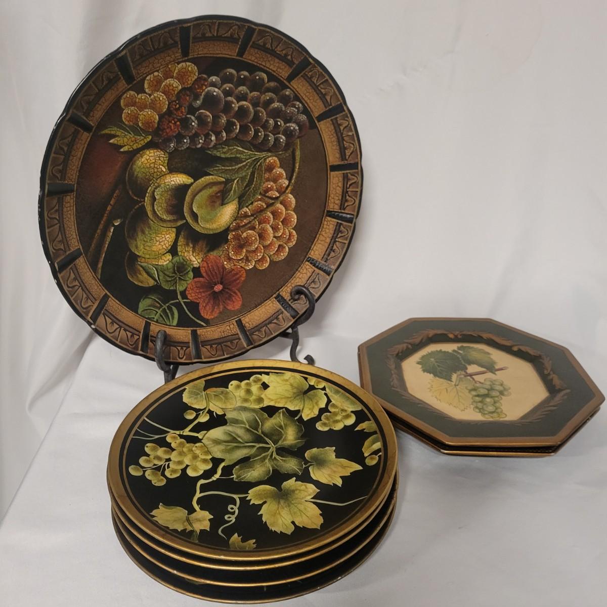 An assortment of Raymond Waites decorative plates that depict grapes, parrots and fruit. All plates have a matte finish and the largest plate measures approximately 14.5"D x 2 5"H and includes an iron plate stand. There are some minor chips on the side of the largest plate. Shipping available