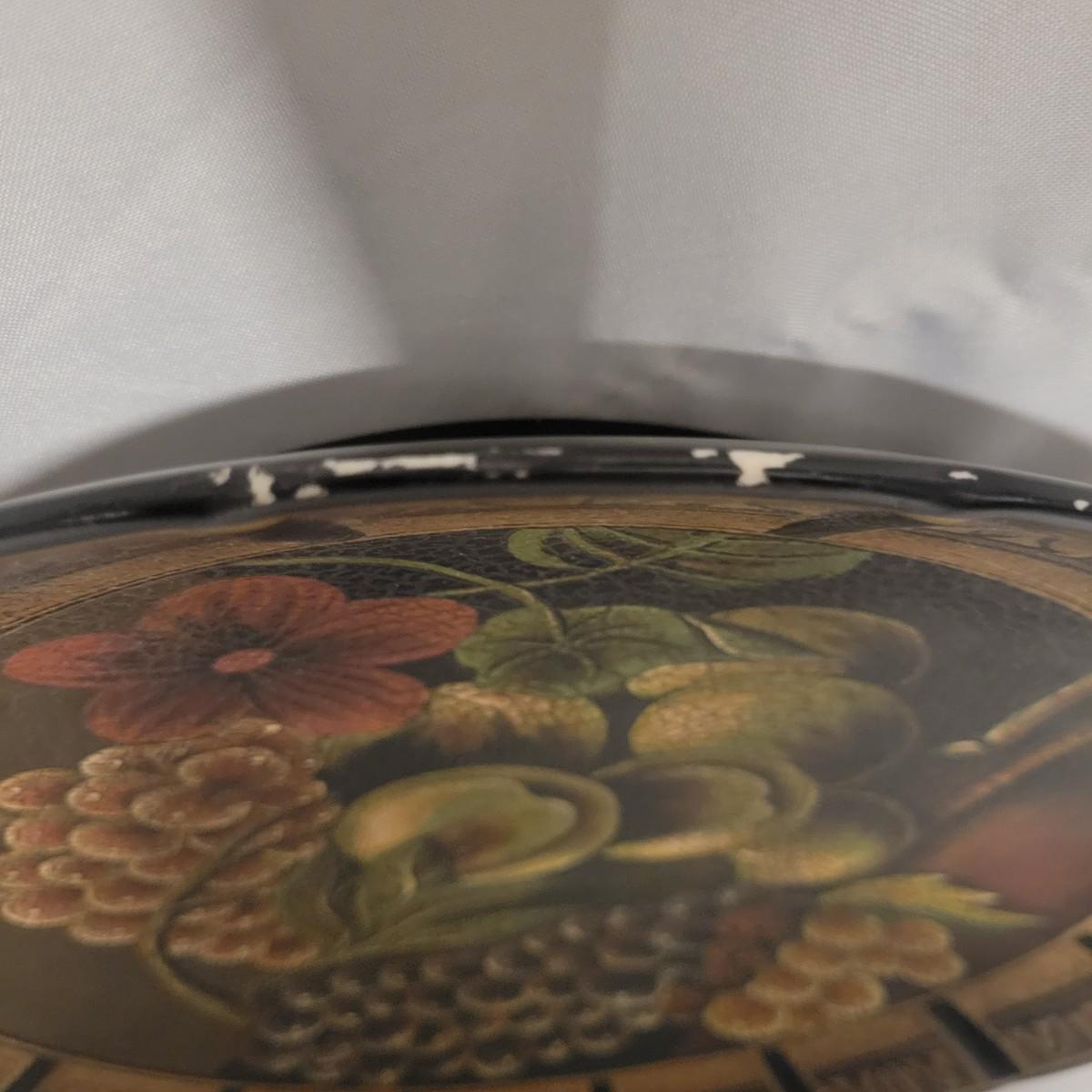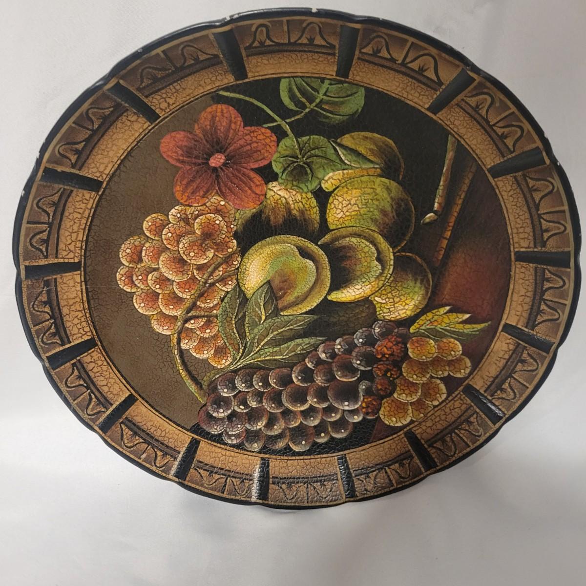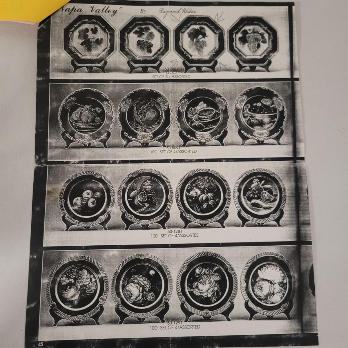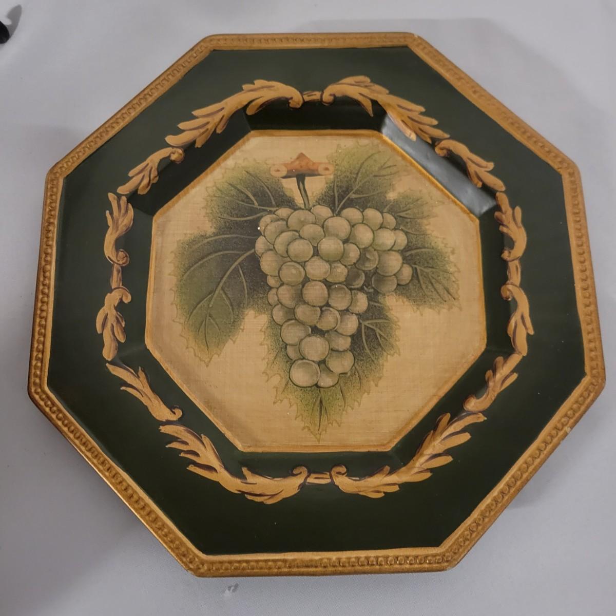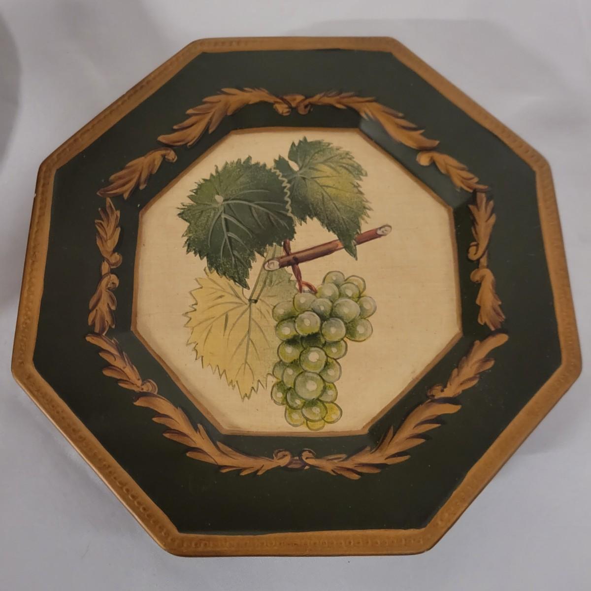 An assortment of Raymond Waites decorative plates that depict grapes, parrots and fruit. All plates have a matte finish and the largest plate measures approximately 14.5"D x 2 5"H and includes an iron plate stand. There are some minor chips on the side of the largest plate. Shipping available