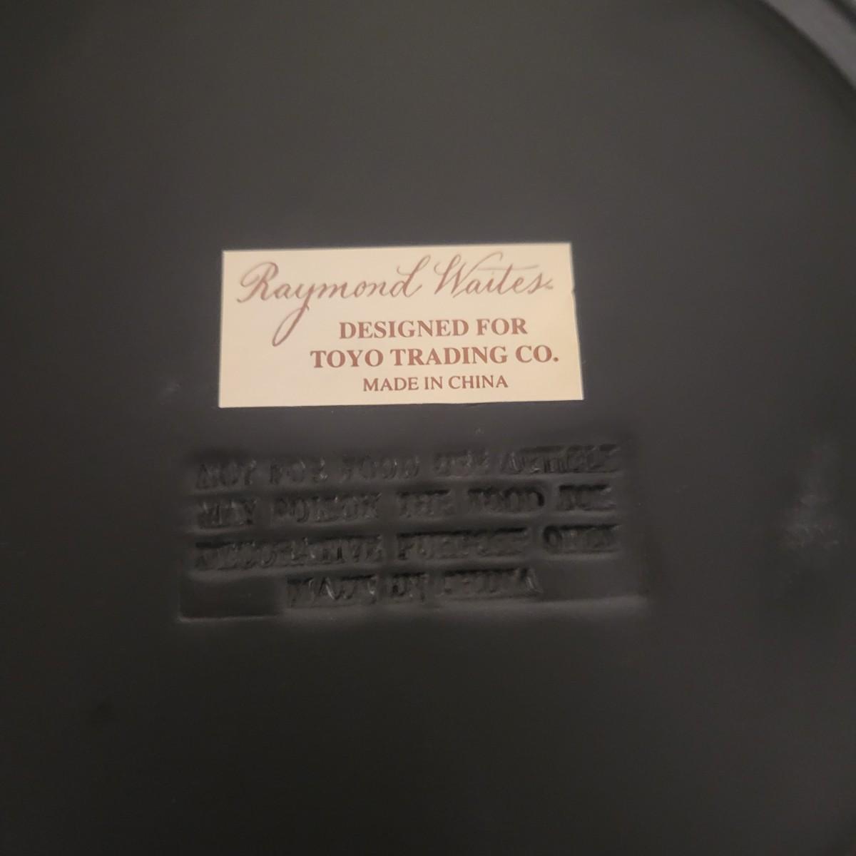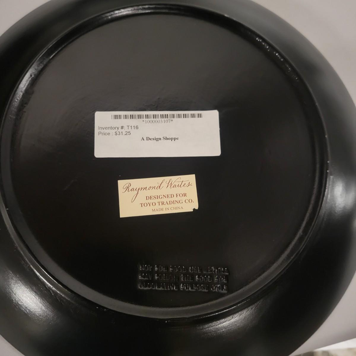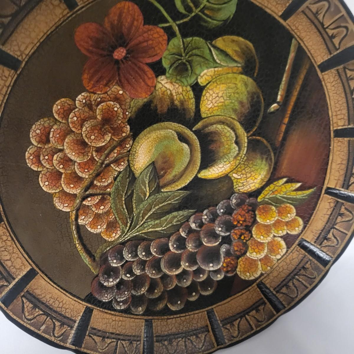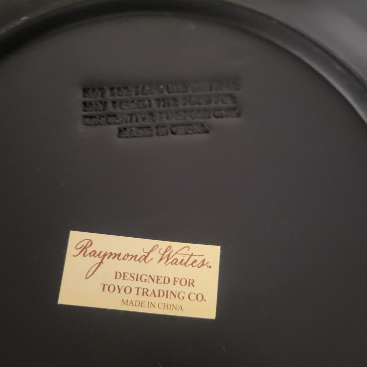 An assortment of Raymond Waites decorative plates that depict grapes, parrots and fruit. All plates have a matte finish and the largest plate measures approximately 14.5"D x 2 5"H and includes an iron plate stand. There are some minor chips on the side of the largest plate. Shipping available