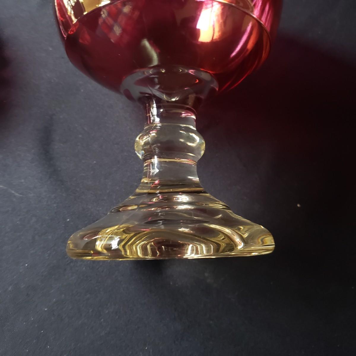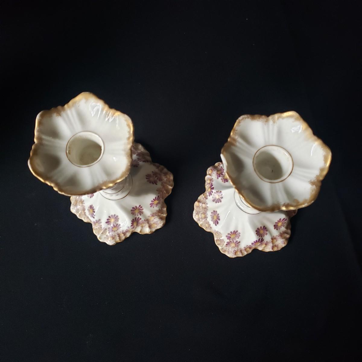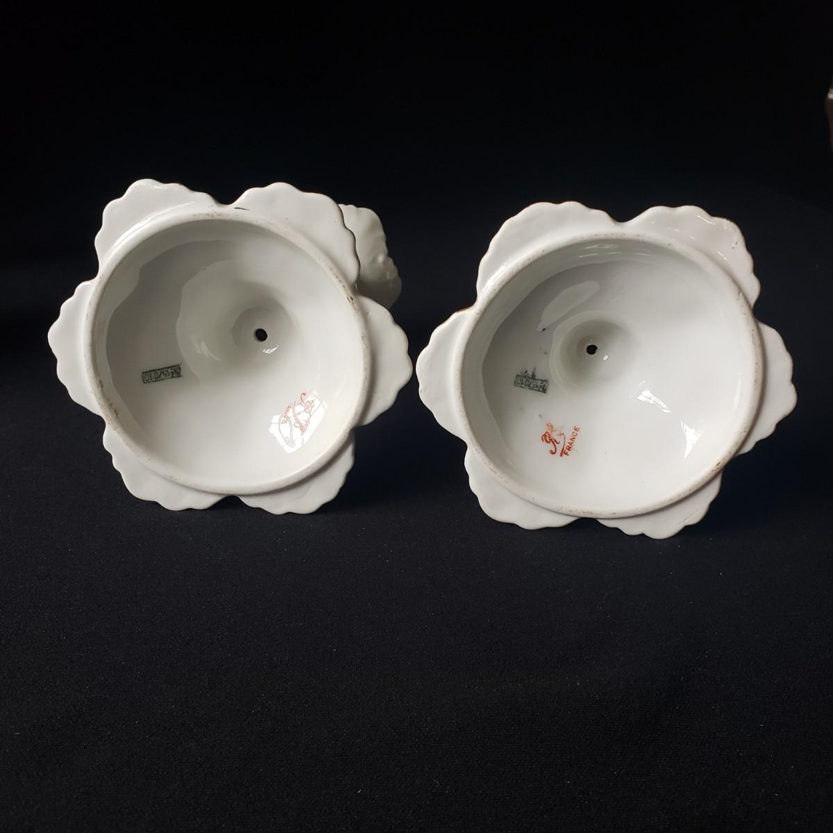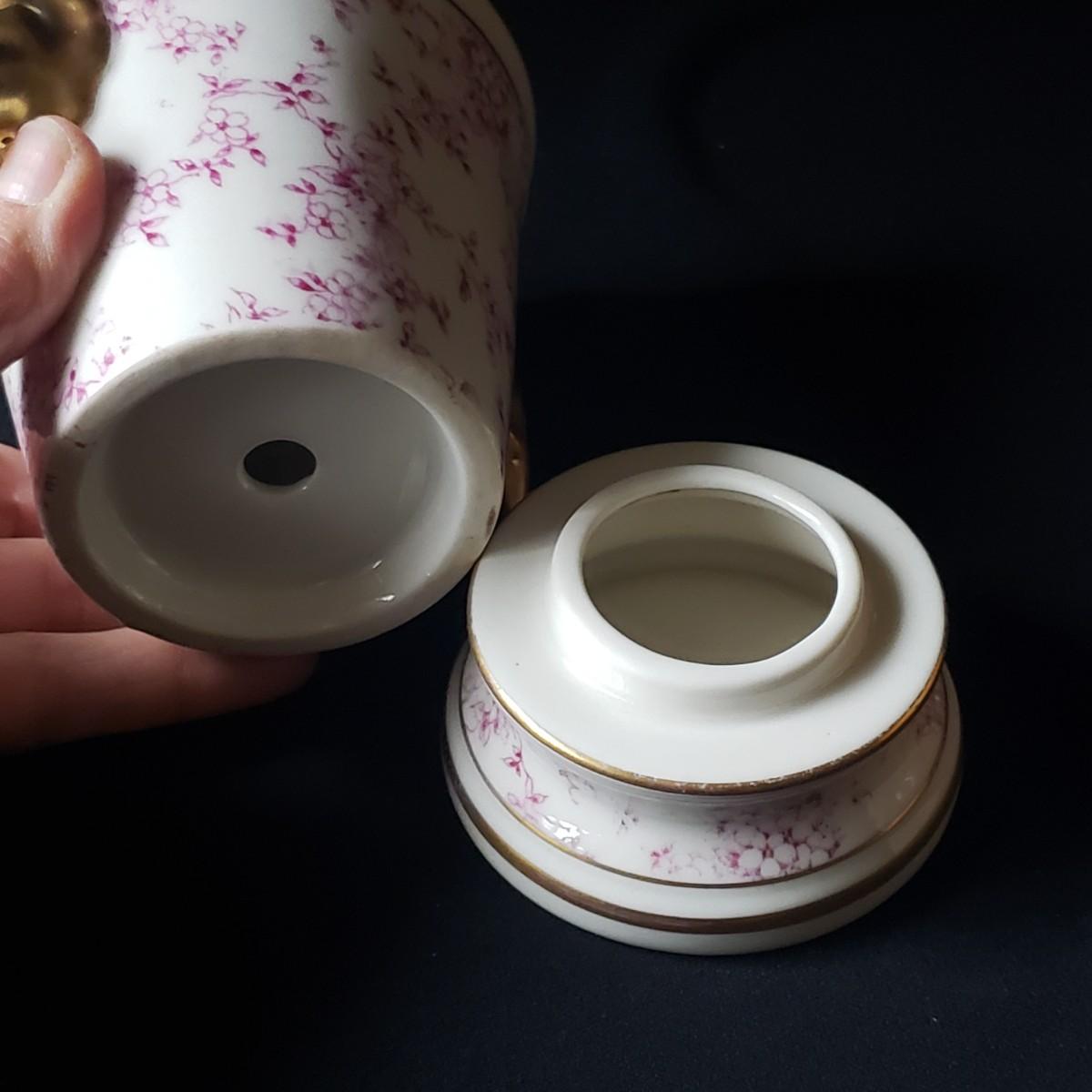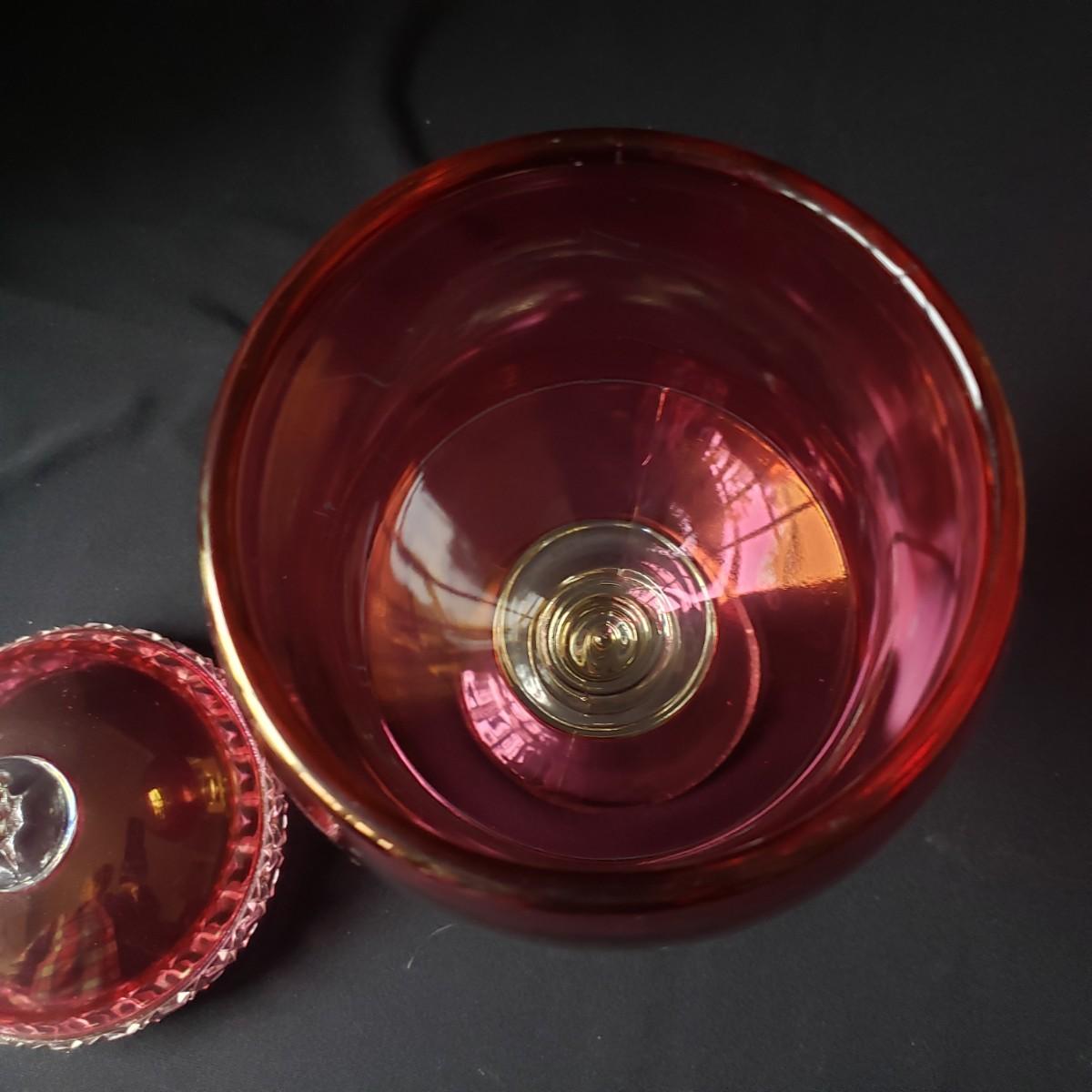 This gorgeous lot features a pair of R&B France porcelain floral candlesticks. The floral print is soft and feminine. There is a small chip in one and gold paint fading. The St. Regis flowerpot has a beautiful floral print accompanied with gold features. The pot and stand measure 3" x 6"H. The bottom of the pot needs a washing. The vintage cranberry colored footed apothecary jar measures 5"D x 11.5"H, has clear cut pattern on lid.