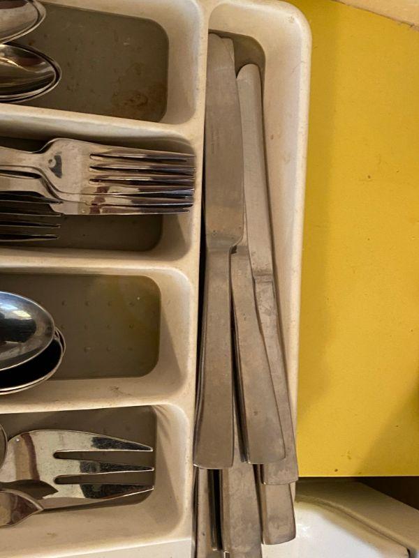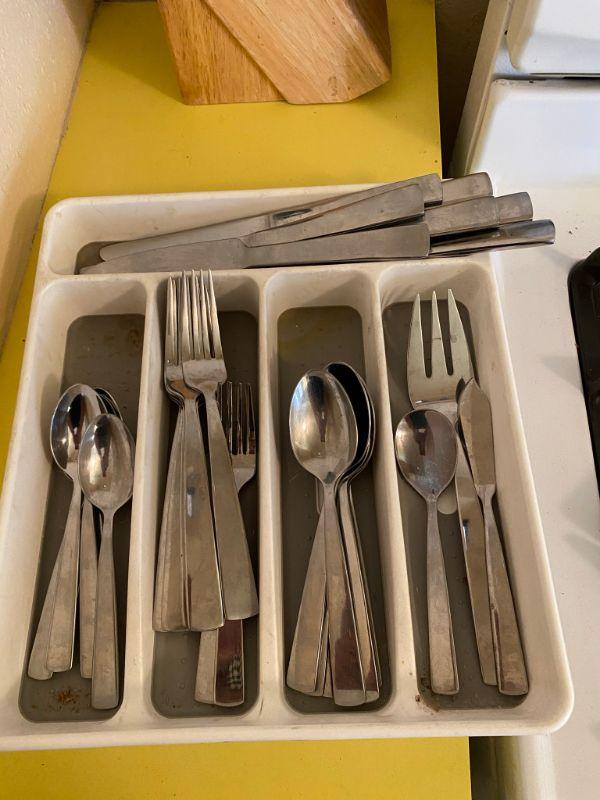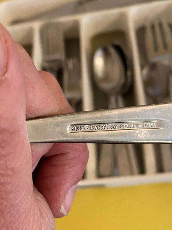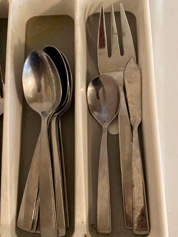 R&B Everyday Stainless flatware. Good size set. Knives, dinner forks, table spoons, teaspoons, and some extra pieces. Come in the drawer divider. Heavy flatware.