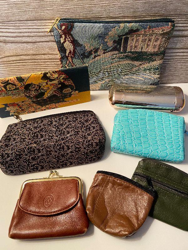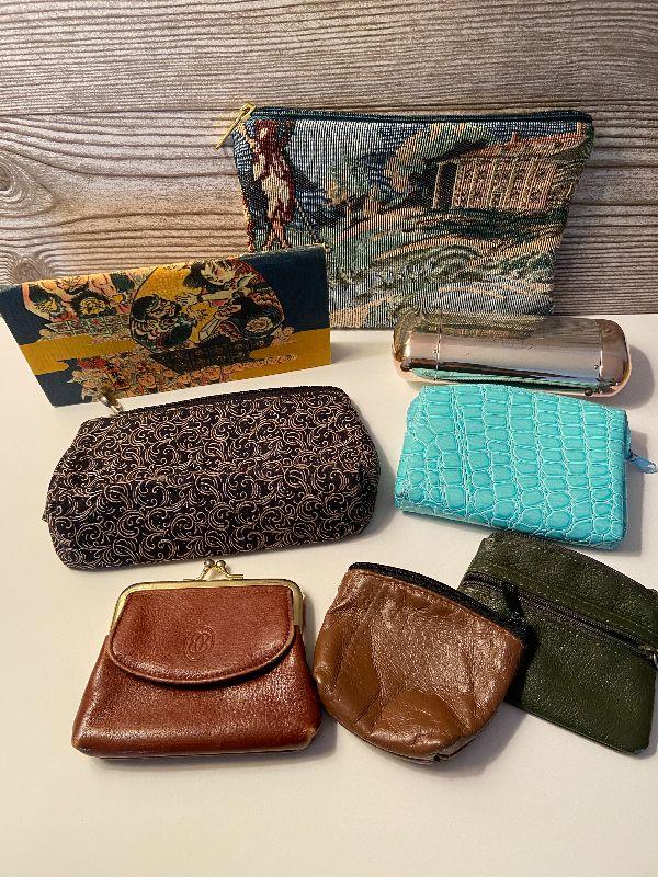 Collection of wallets and change purses and more. Please see all pictures for contents in this listing, the condition of items in the listing, and the size if measurements were taken. Thank you for looking and have fun bidding.