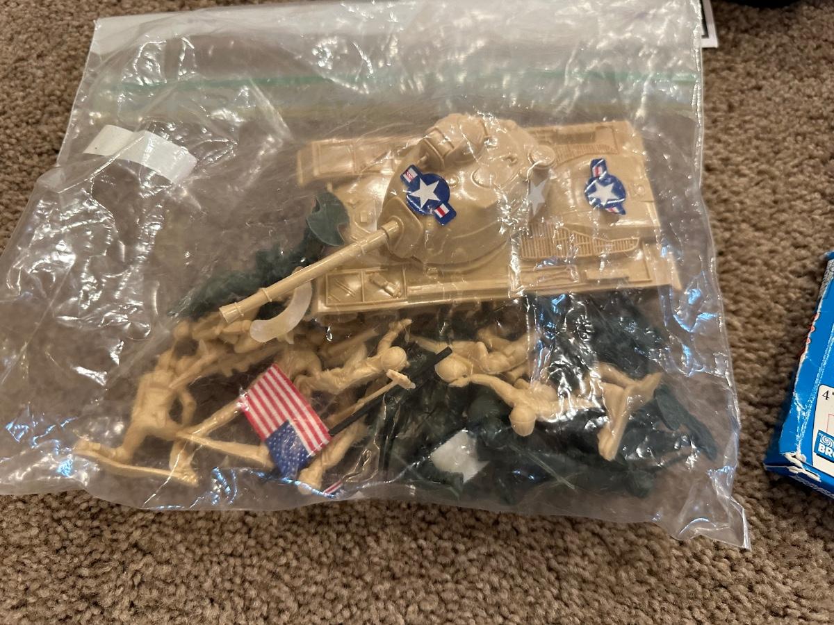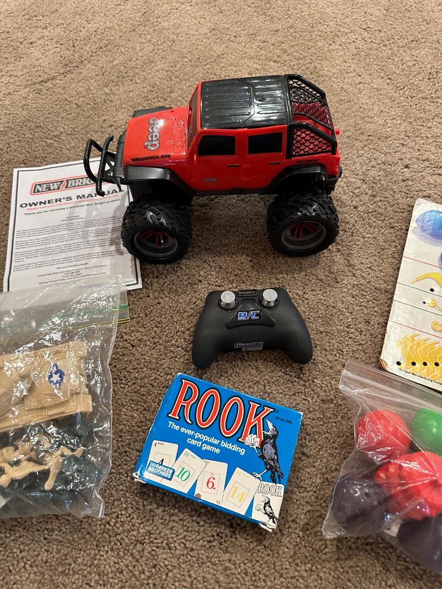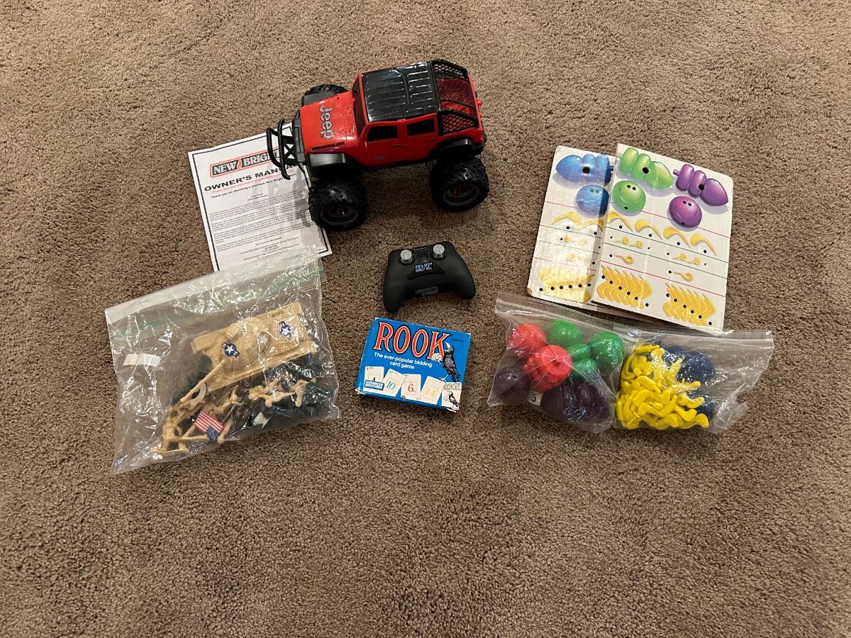 RC JEEP, TANK W/ARMY MEN, ROOK AND COOTIES