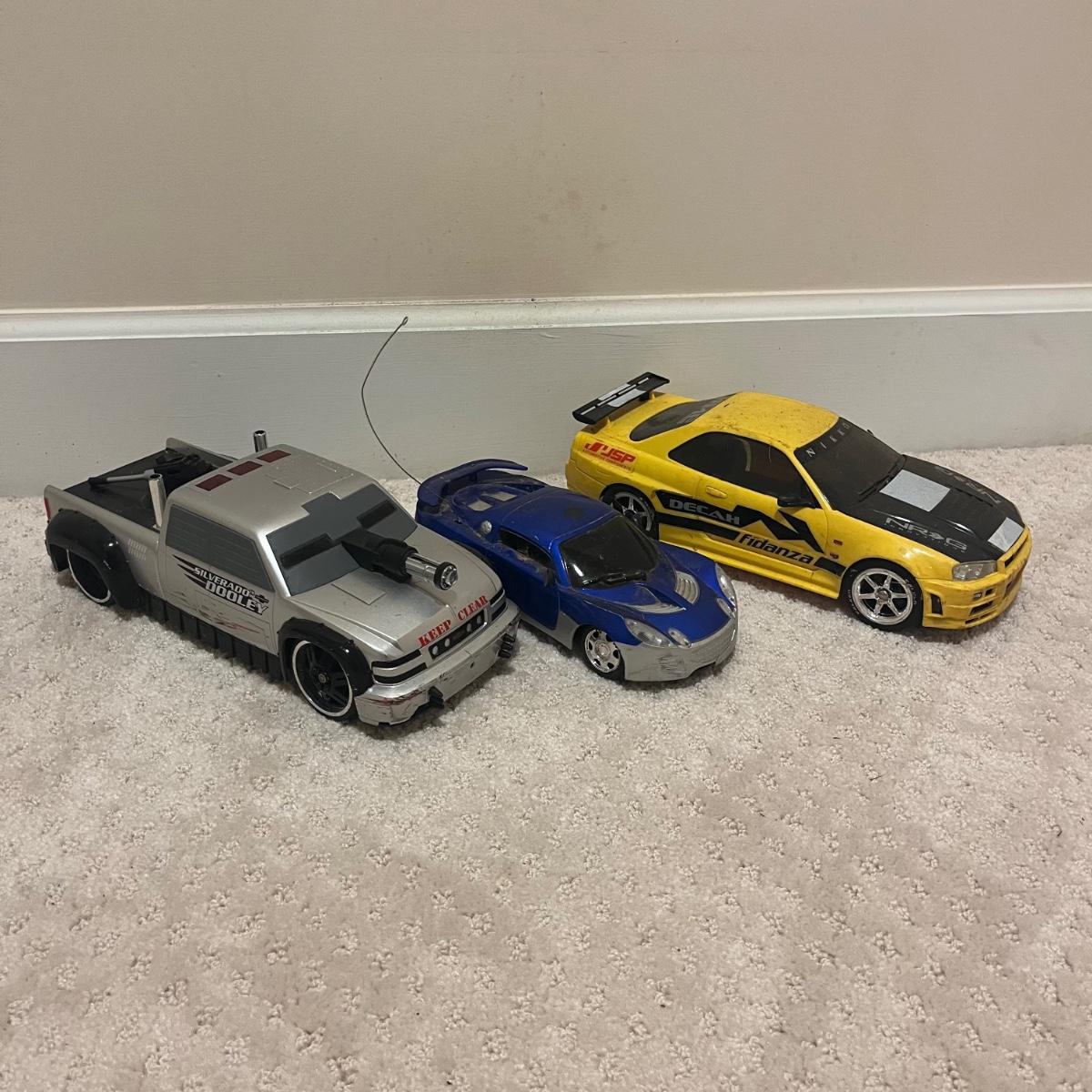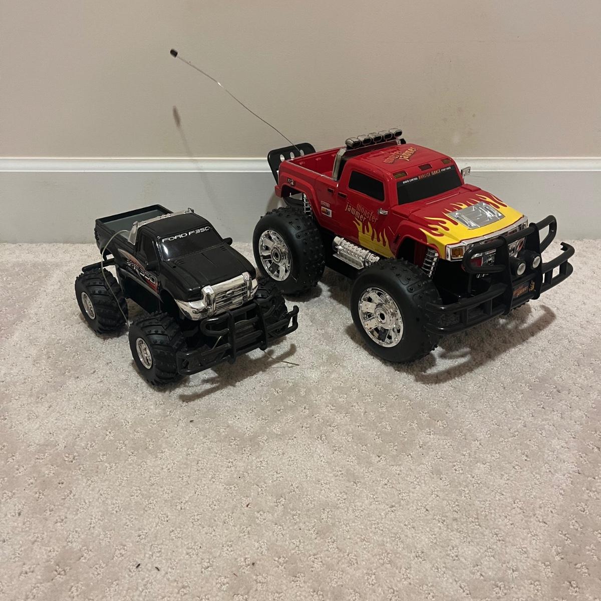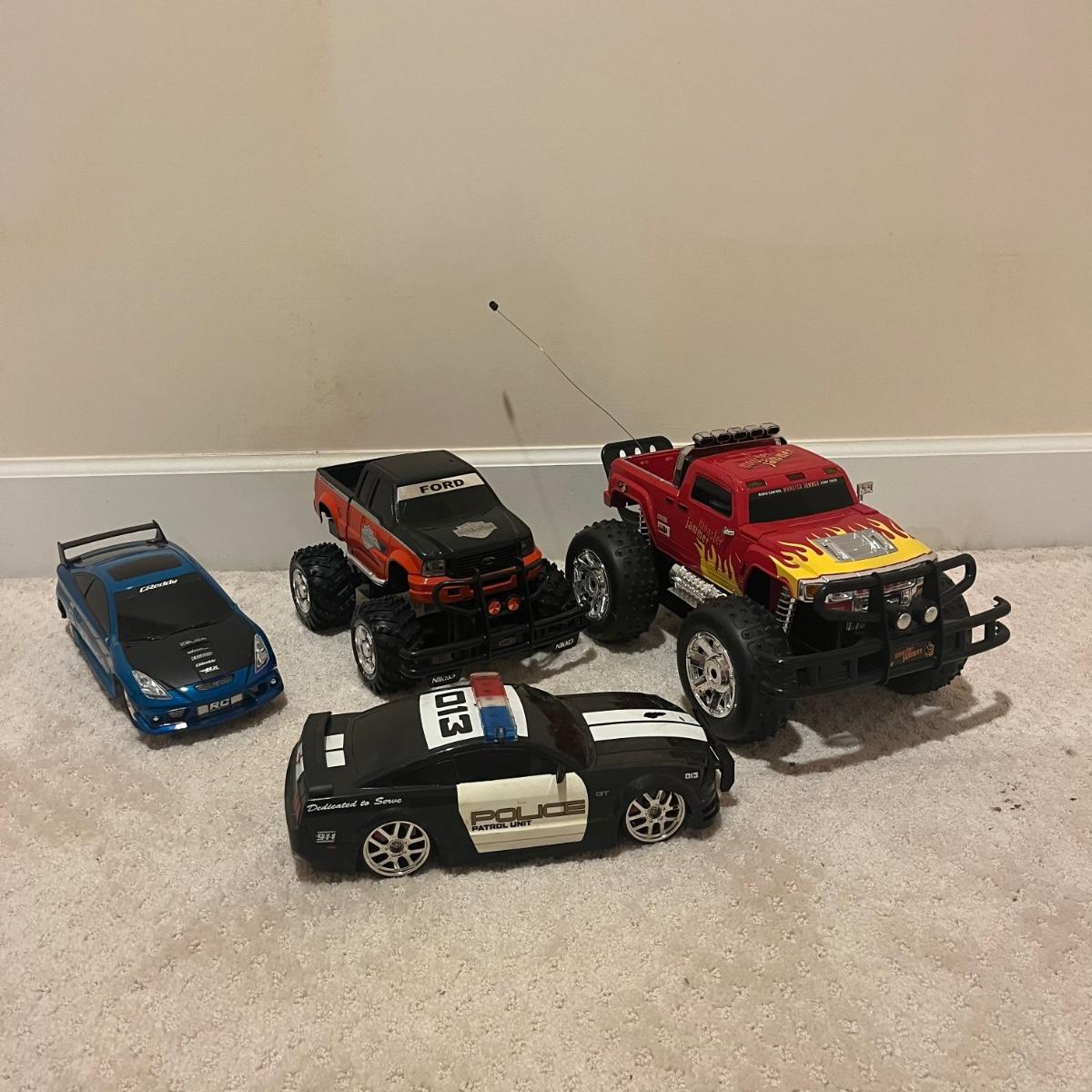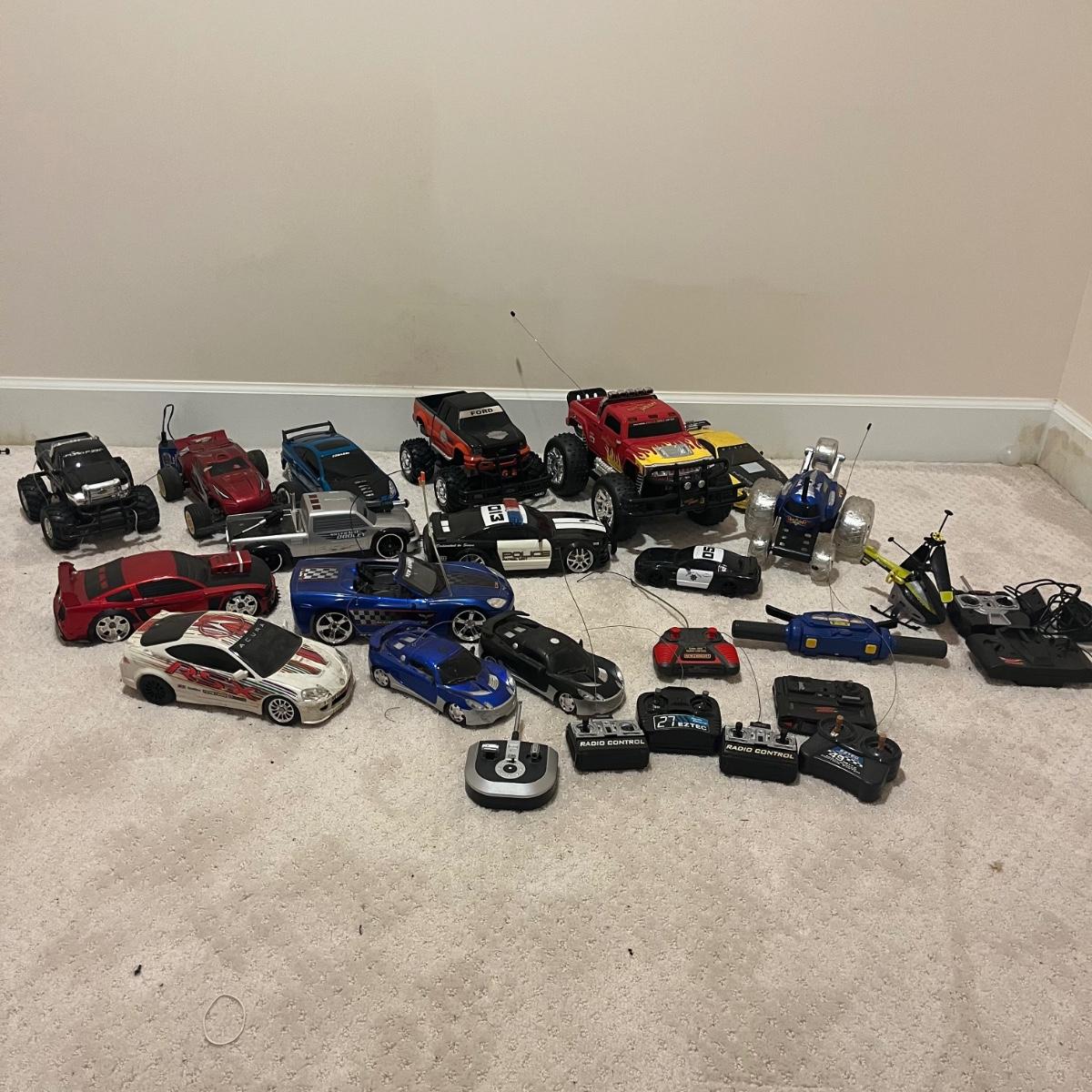 Lot contains over fourteen R/C vehicles including trucks, cars and a helicopter. Lot includes ten remote controllers. No item were tested as they all appear to need batteries or charging. Monster Jammer truck measures 9” x 13” x 8”.