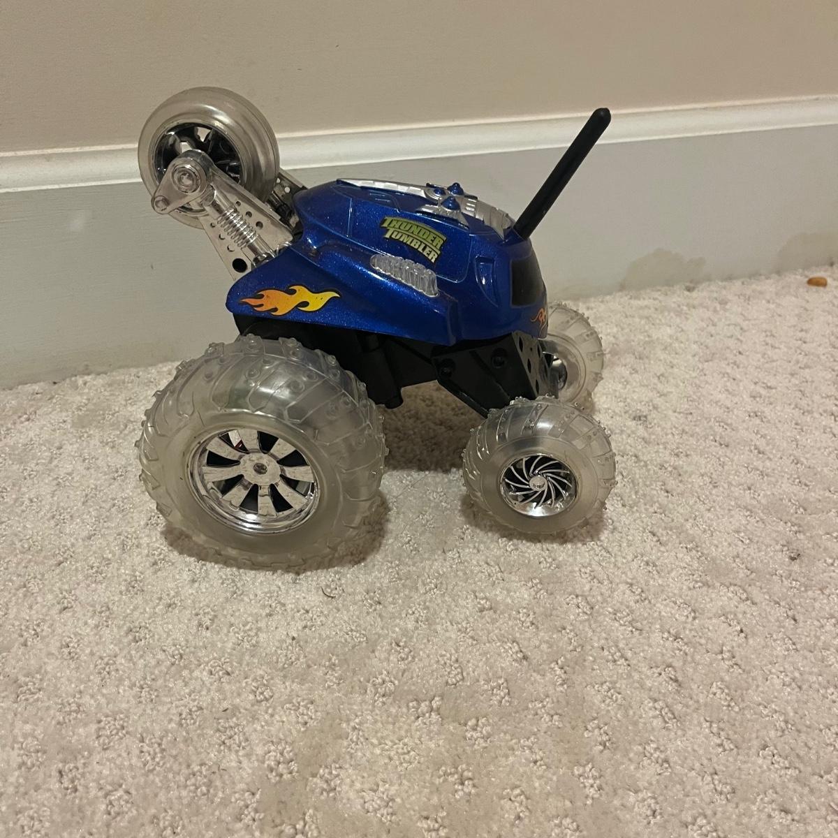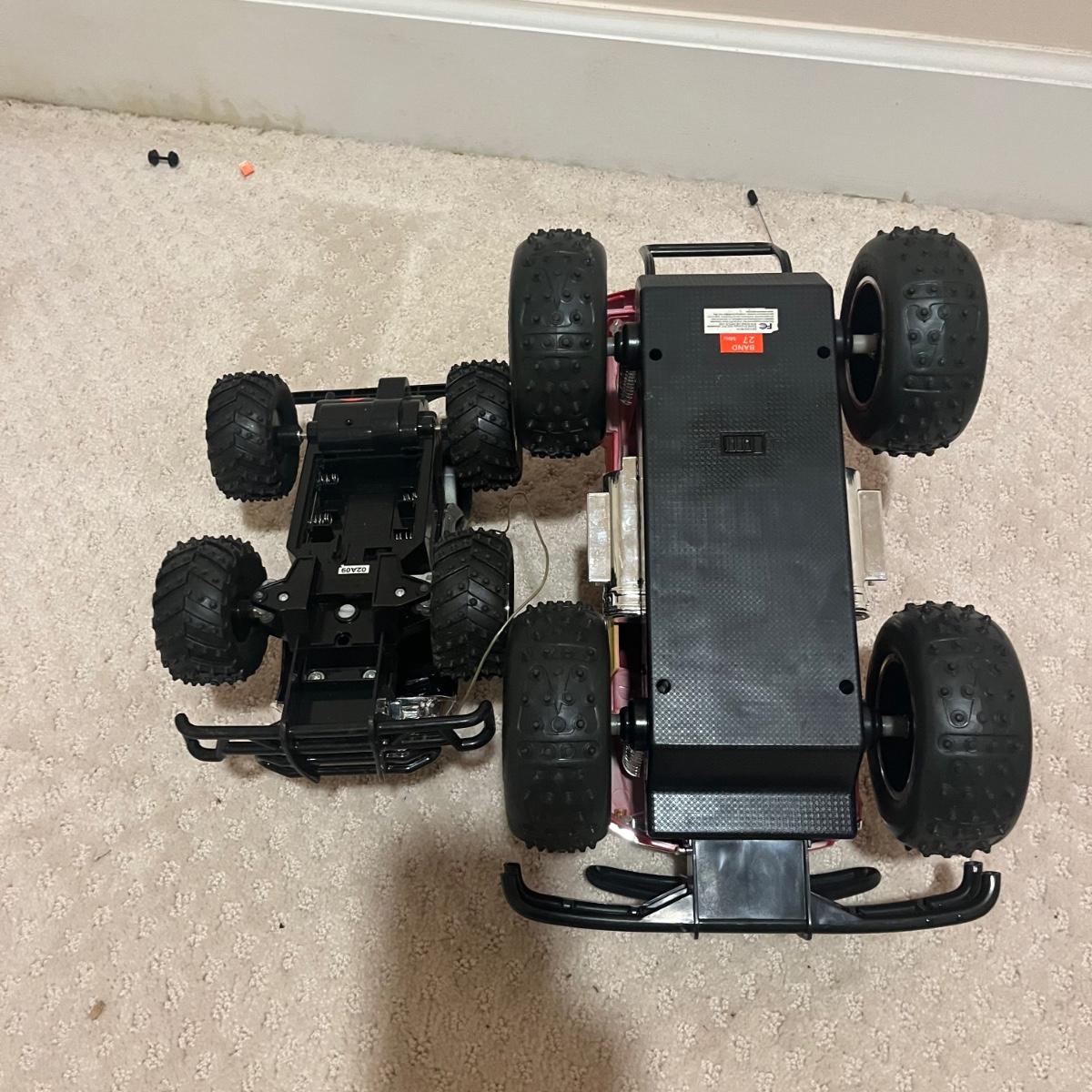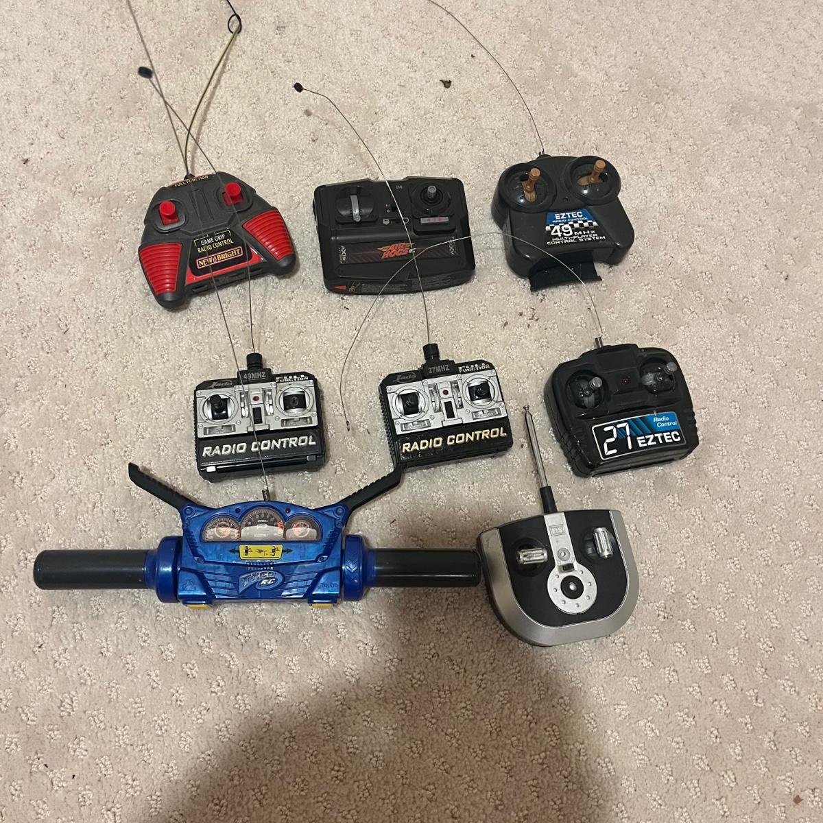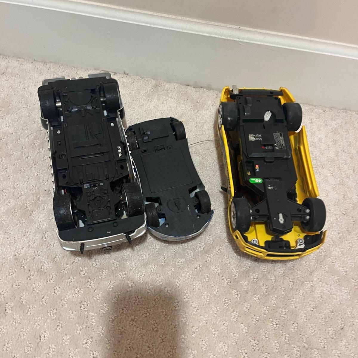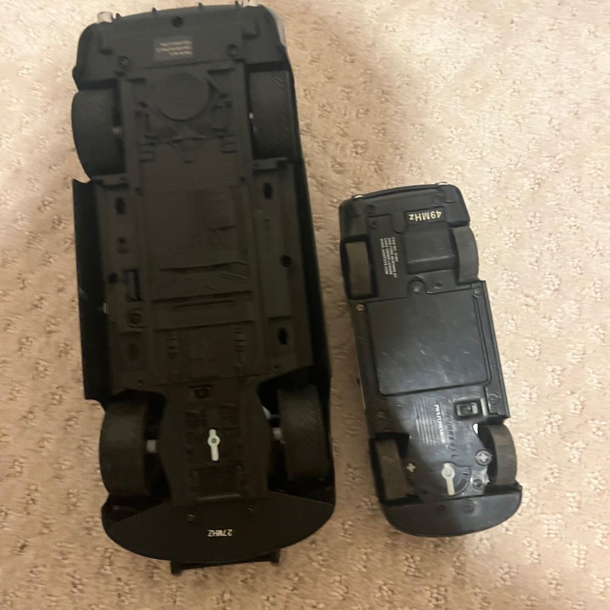 Lot contains over fourteen R/C vehicles including trucks, cars and a helicopter. Lot includes ten remote controllers. No item were tested as they all appear to need batteries or charging. Monster Jammer truck measures 9” x 13” x 8”.