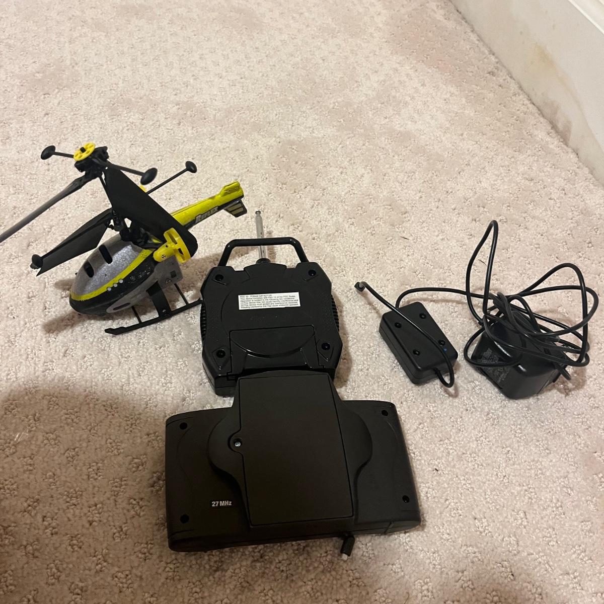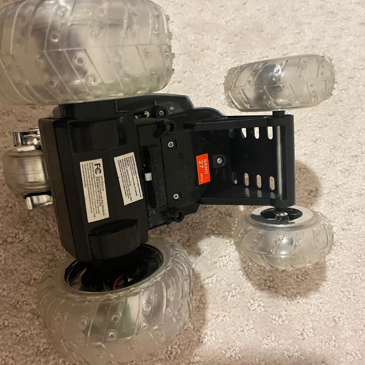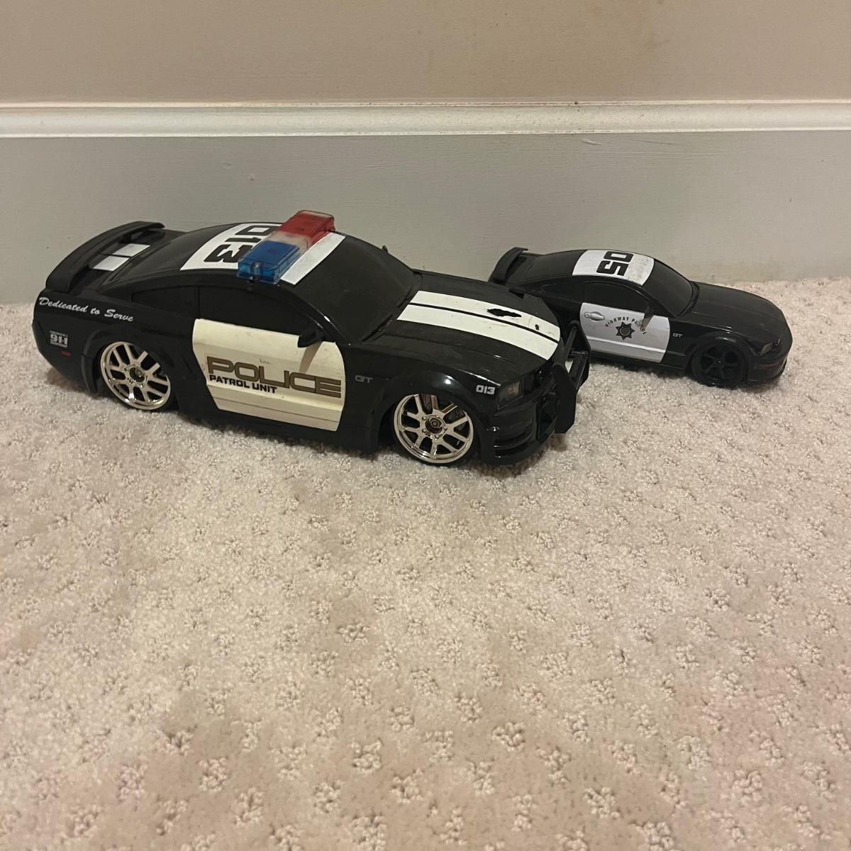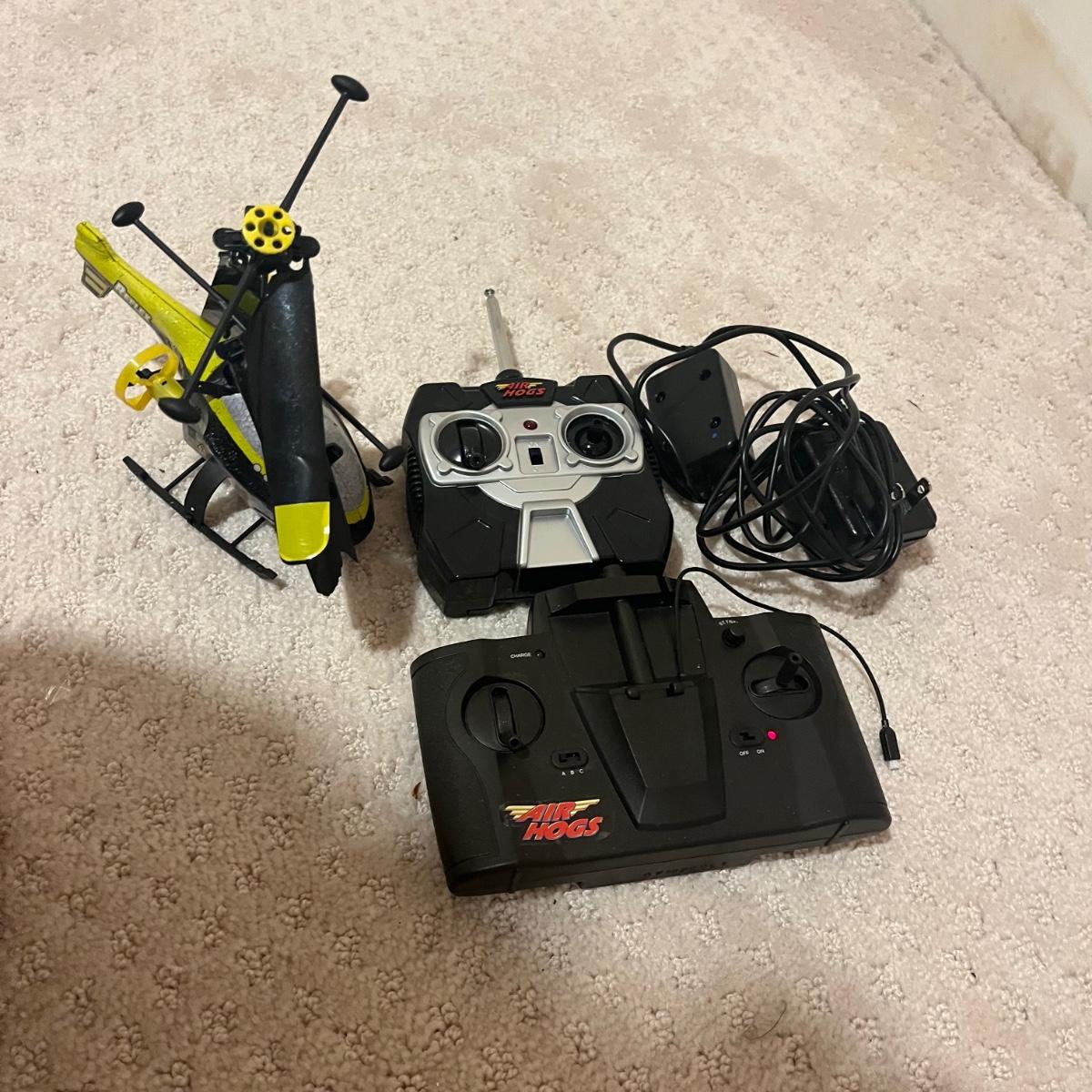 Lot contains over fourteen R/C vehicles including trucks, cars and a helicopter. Lot includes ten remote controllers. No item were tested as they all appear to need batteries or charging. Monster Jammer truck measures 9” x 13” x 8”.
