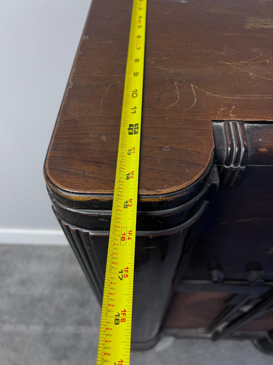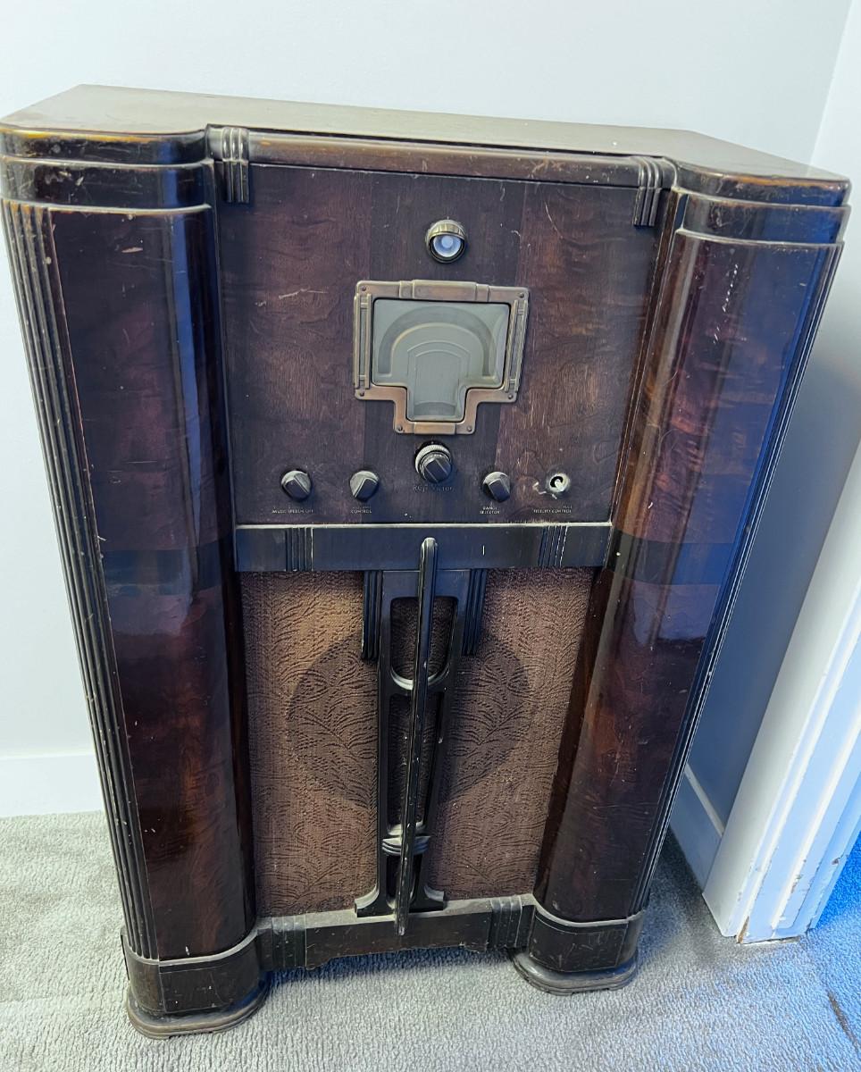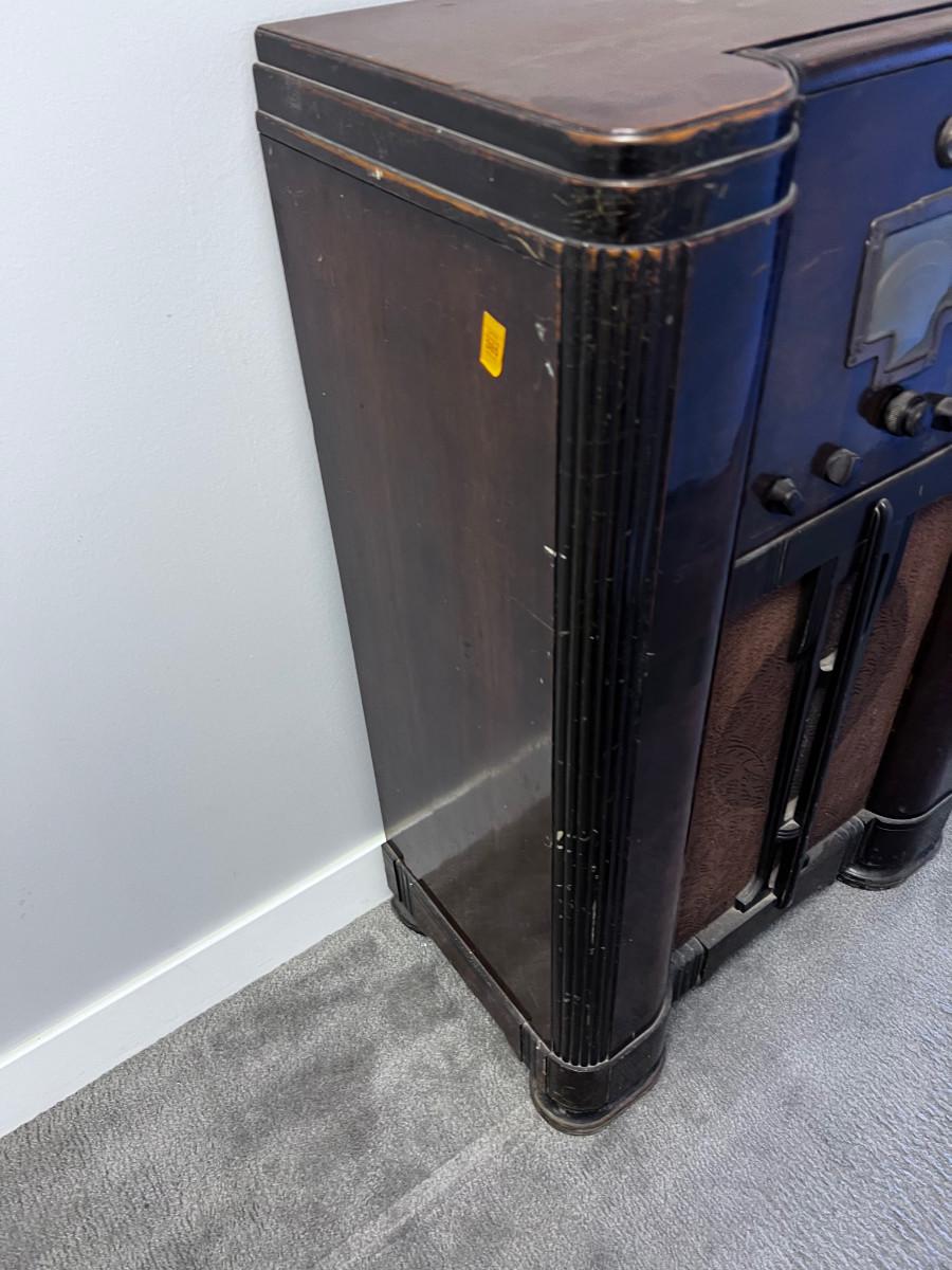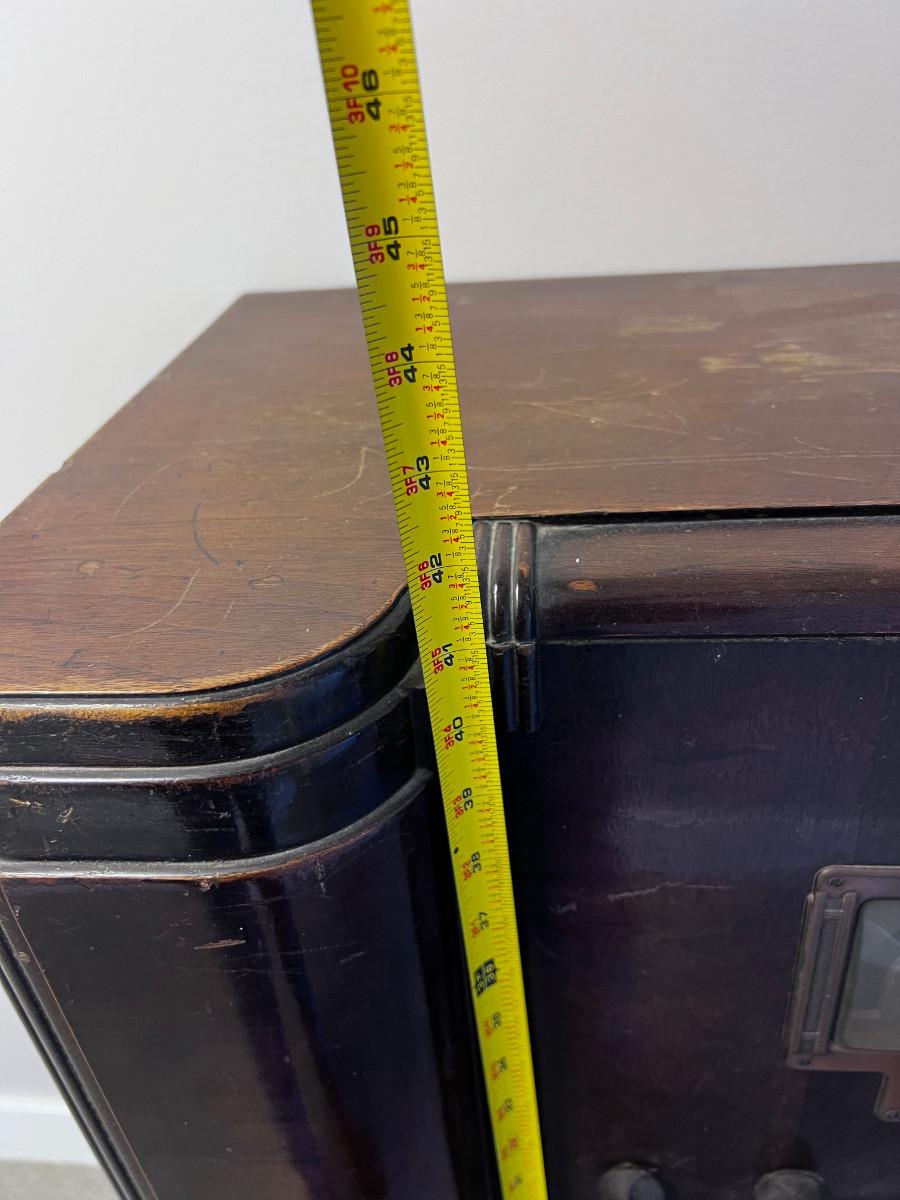 No plug, not tested but for parts or repair. Old Walnut Cabinet tube radio, 27x15x42"