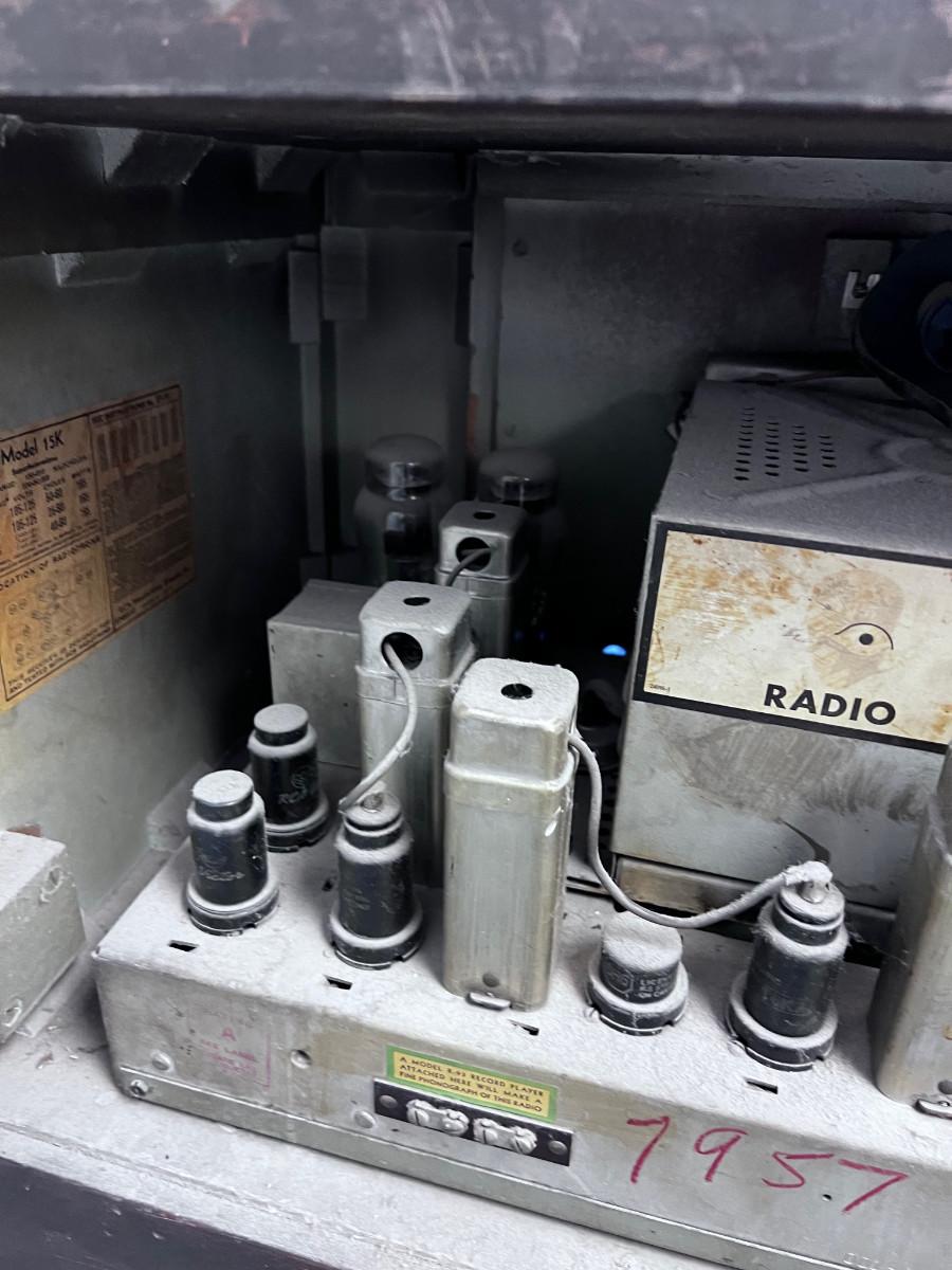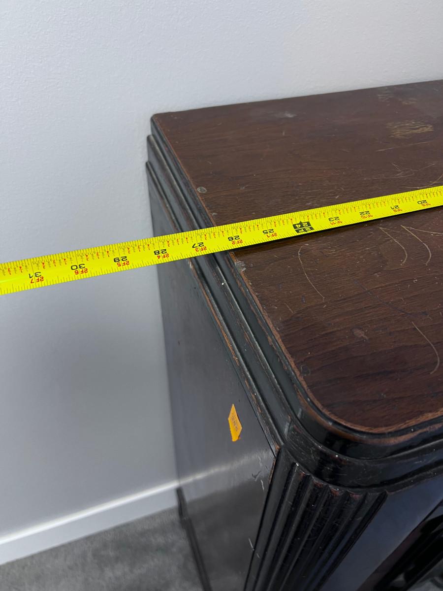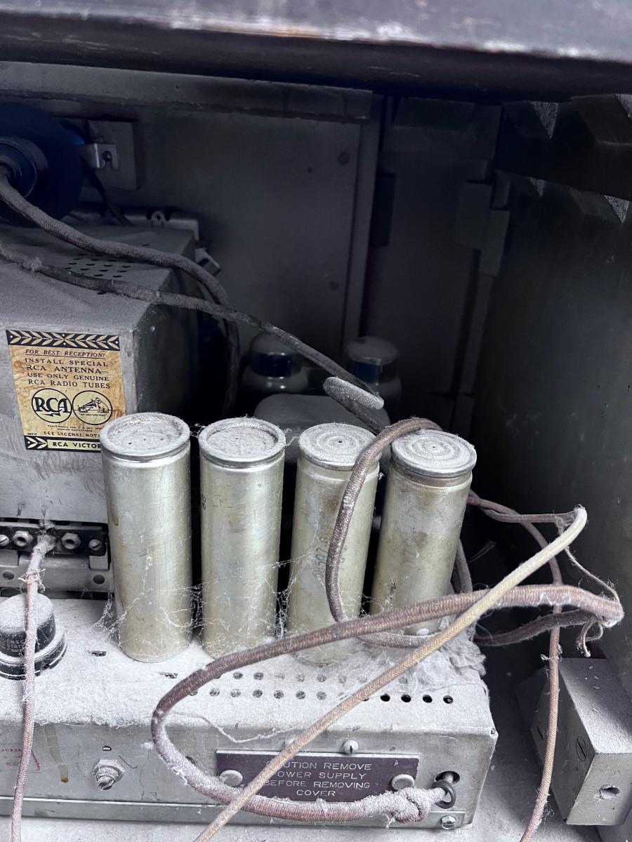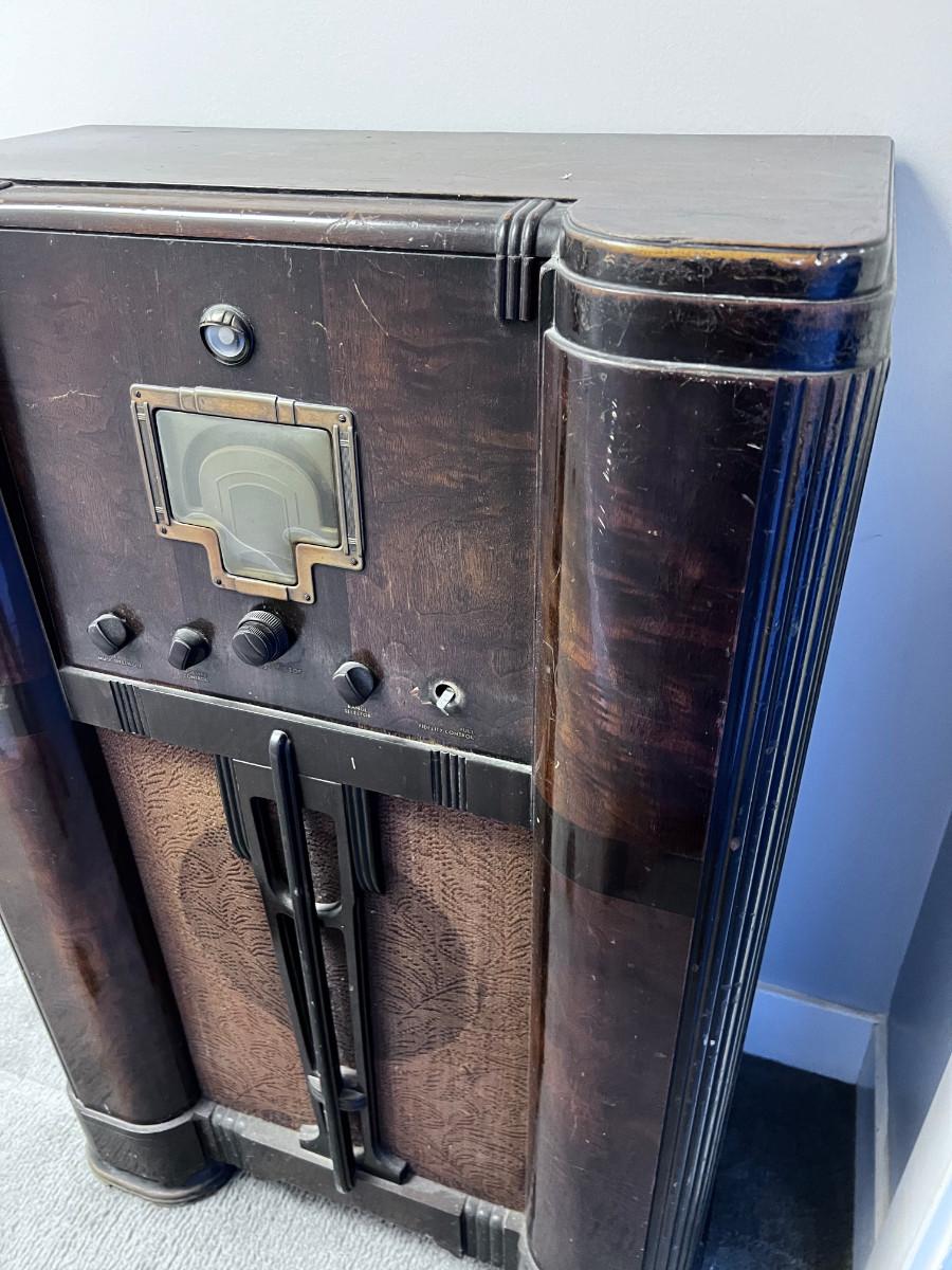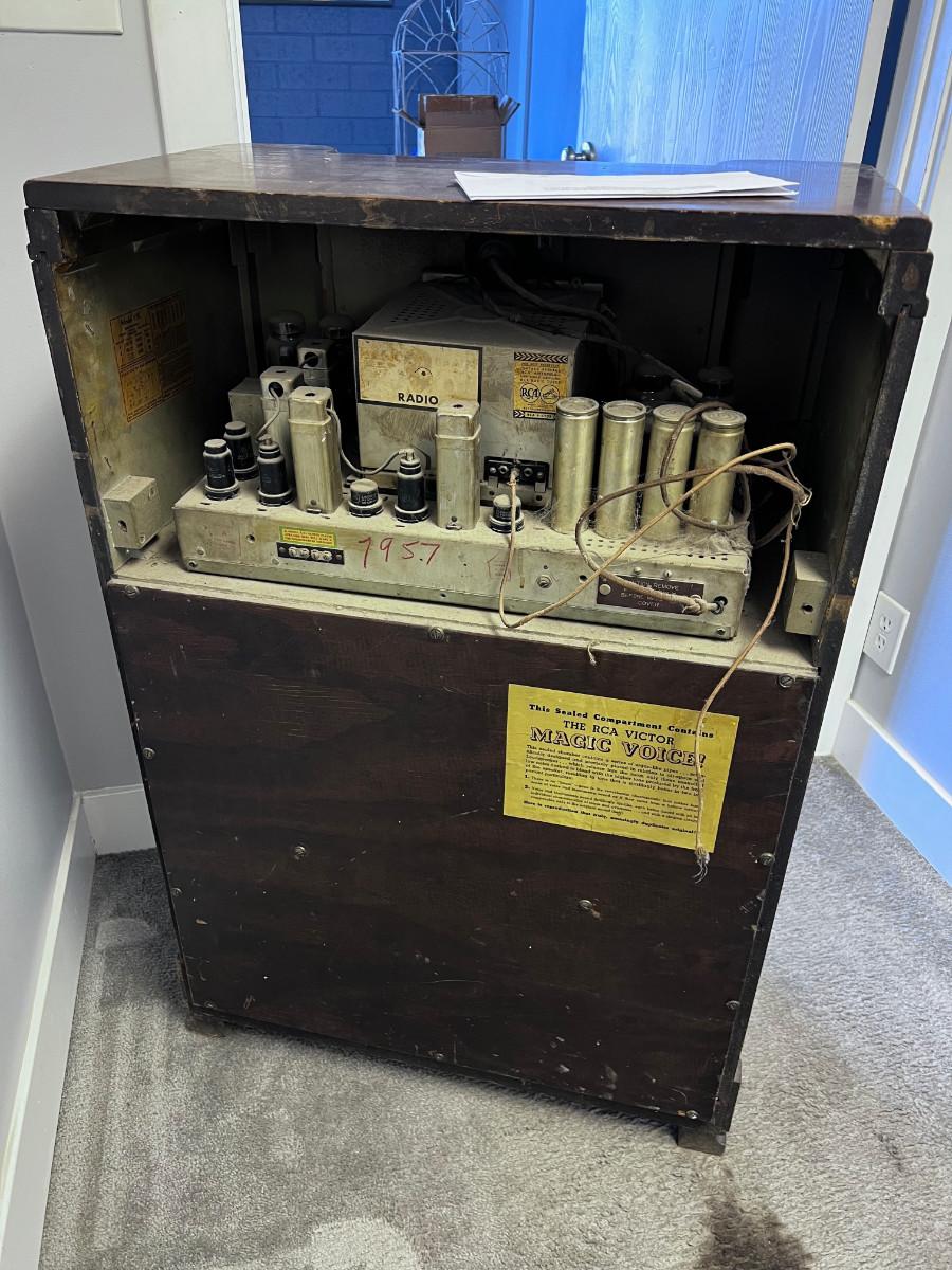 No plug, not tested but for parts or repair. Old Walnut Cabinet tube radio, 27x15x42"