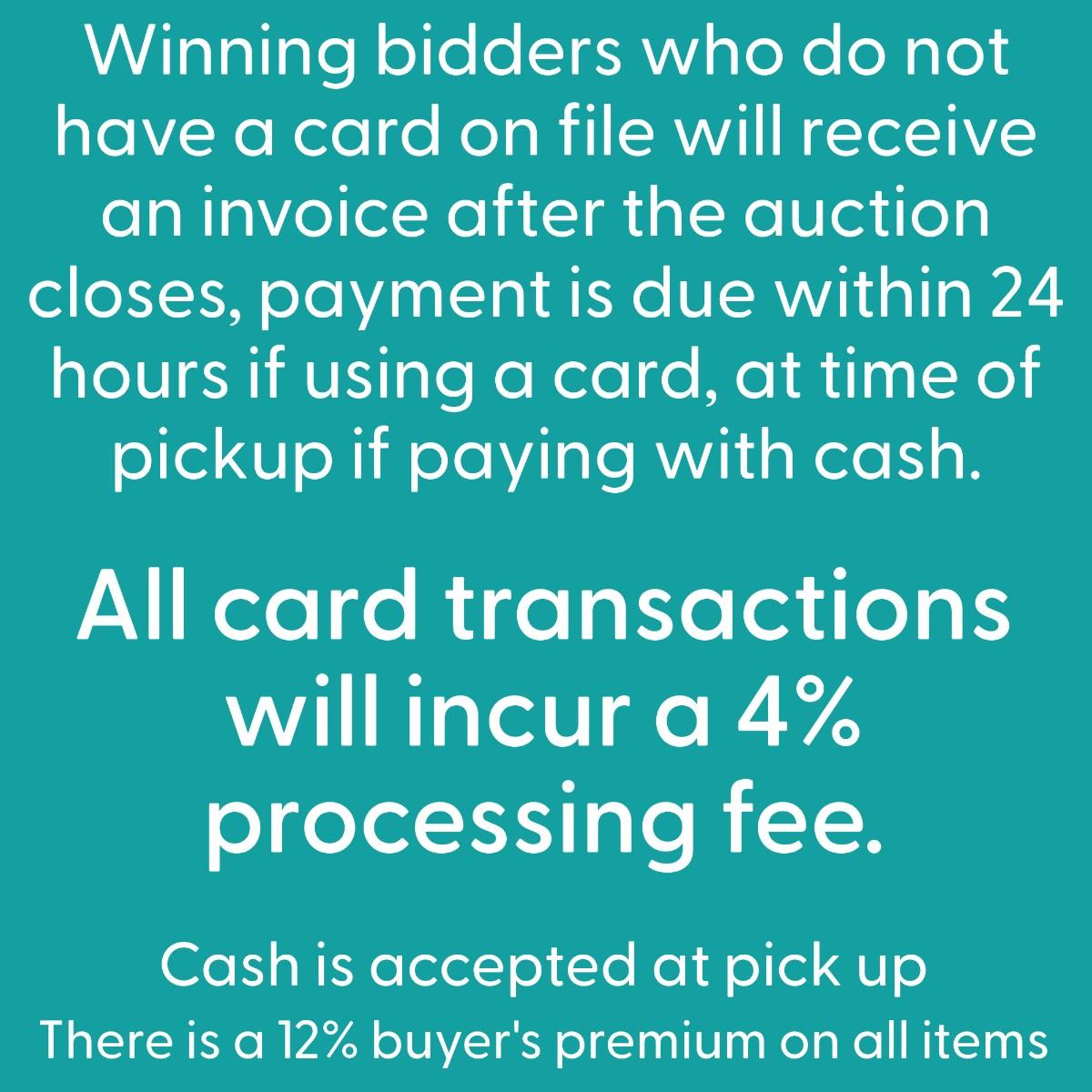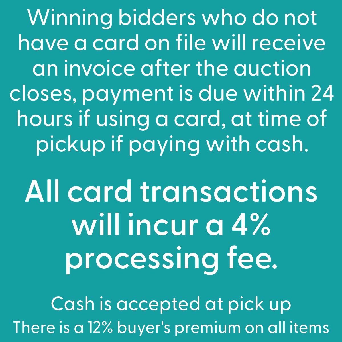 All items must be picked up during the listed date and times. Failure to pickup items during pickup times will result in forfeiture of items, the highest bidder will be charged the full amount.