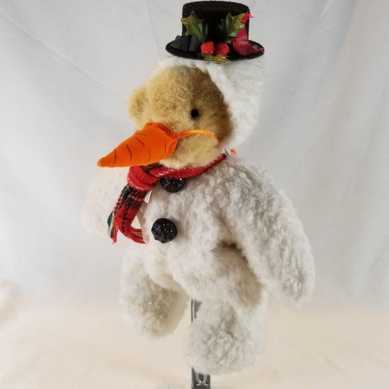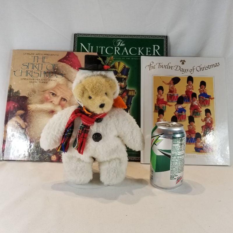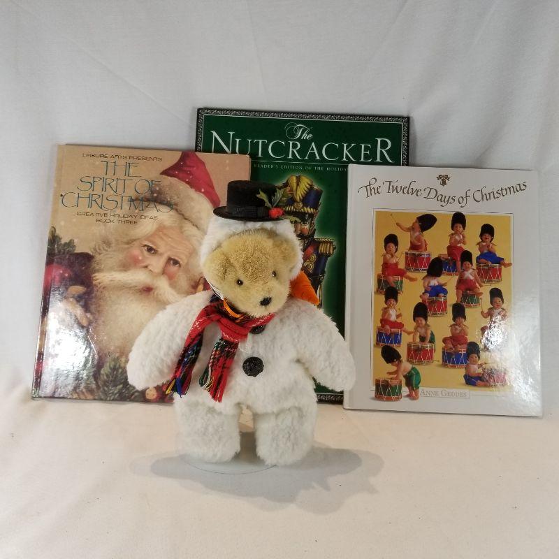 A very cute teddy bear in a snowman suit with three very nice holiday books. The snowman suit shows some wear, books are in very good condition. Doll stand is included.
