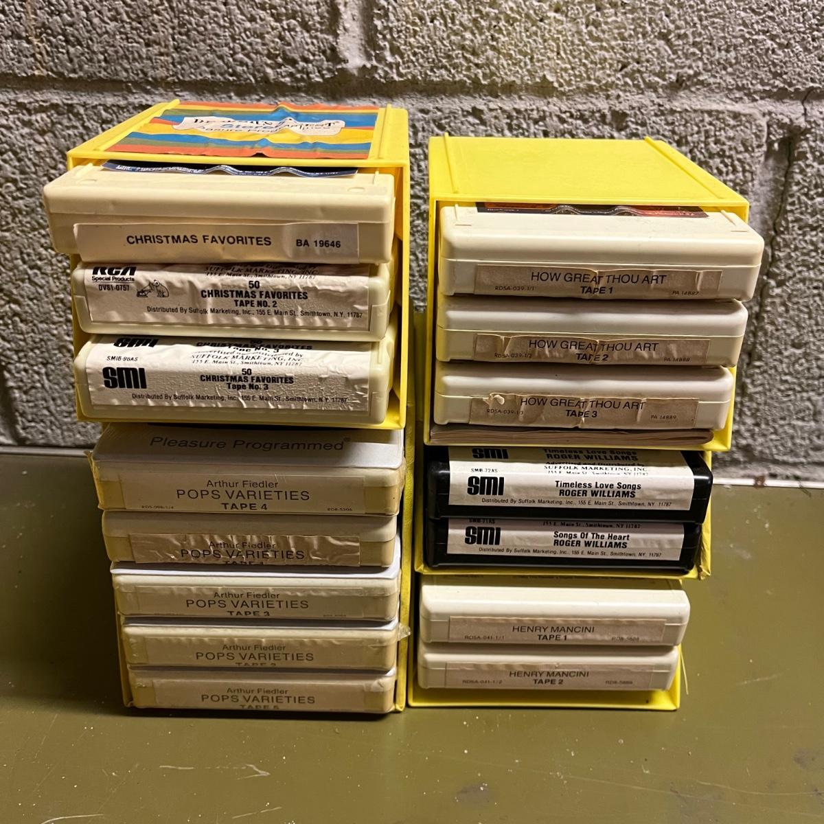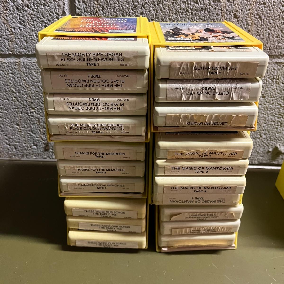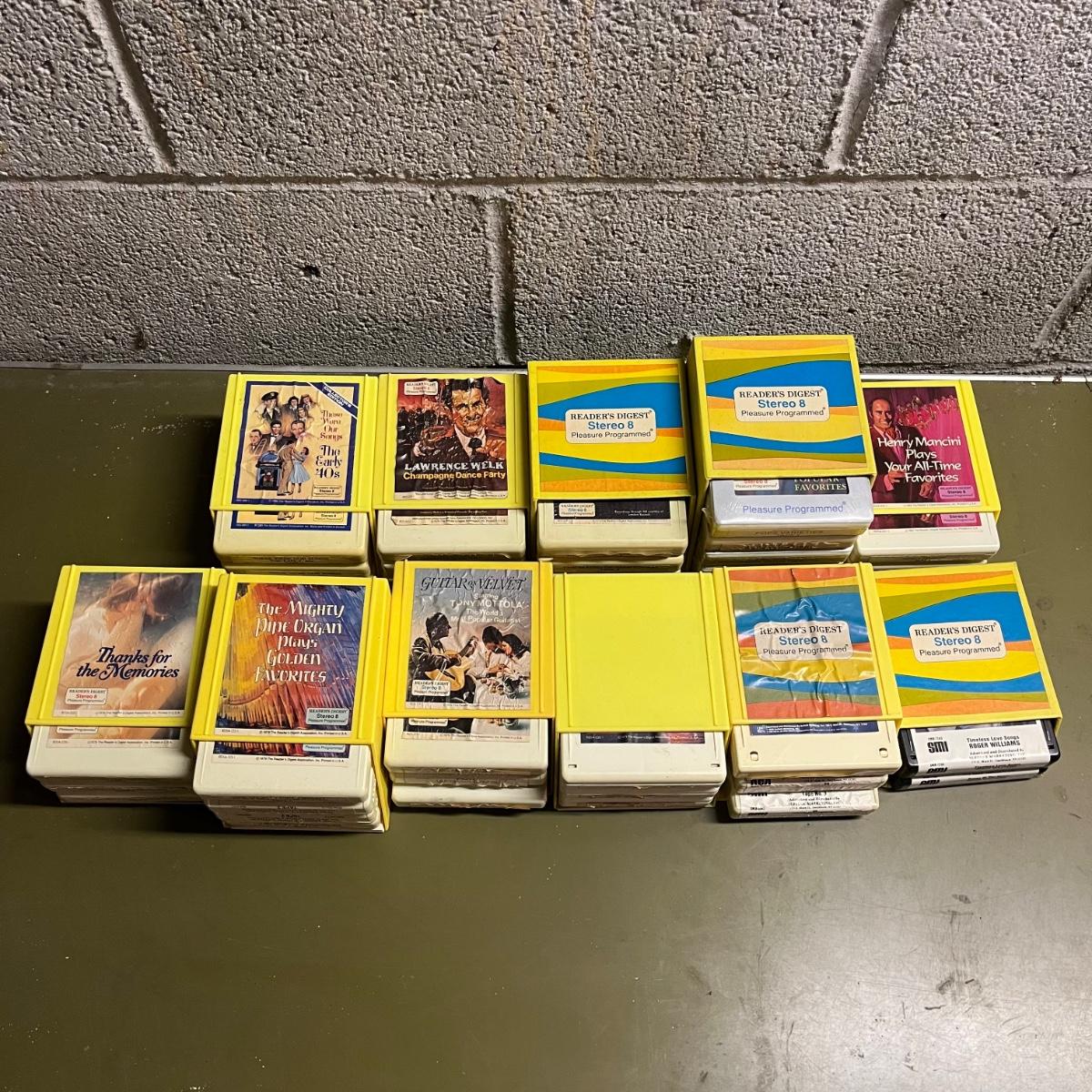Lot contains a selection of Readers Digest eight track tape collections including Christmas Favorites, Guitar on Velvet, How Great Thou Are, Henry Mancini and more. Also includes tapes by Tennessee Ernie Ford, Tom Jones, Guy Lombardo, Nat King Cole and more.