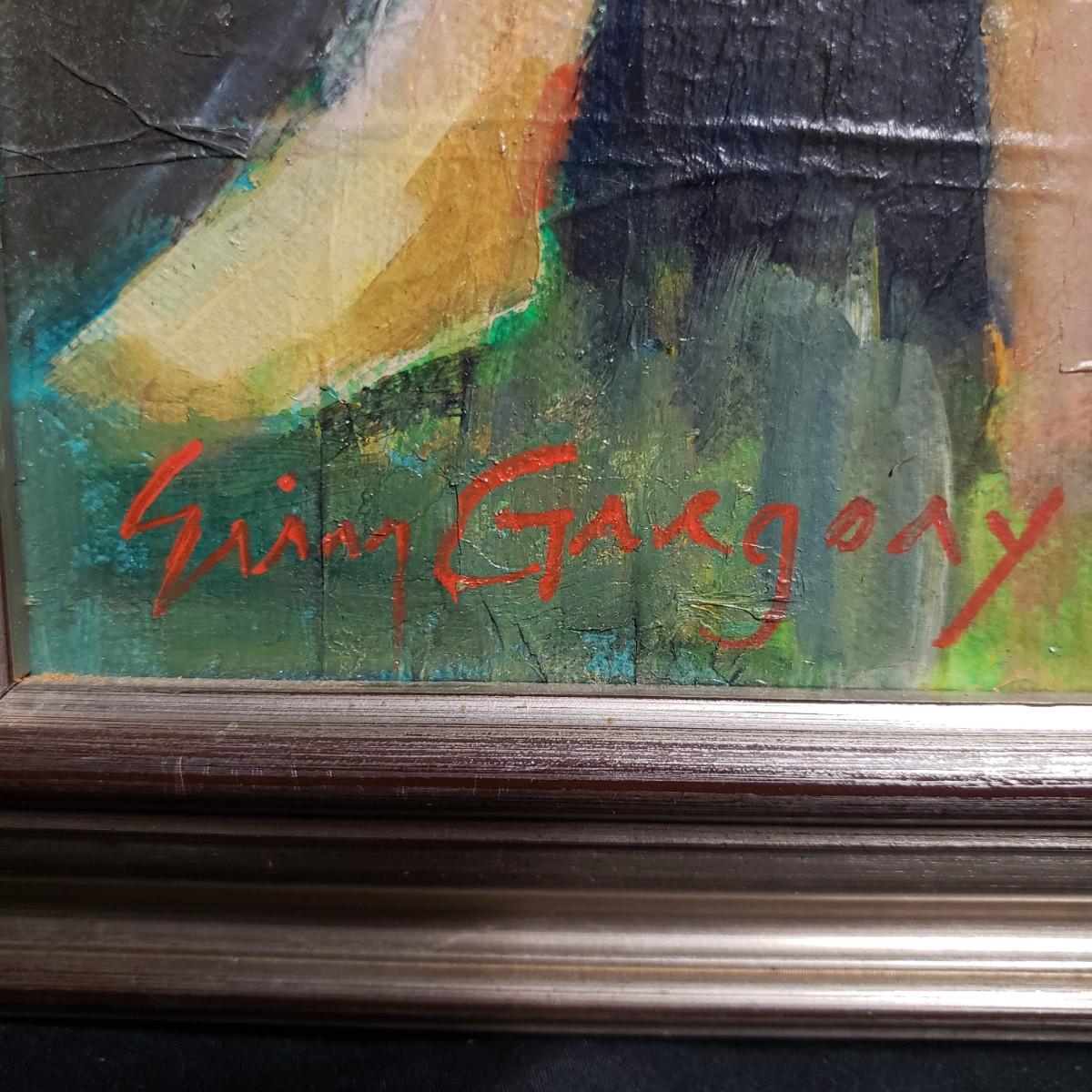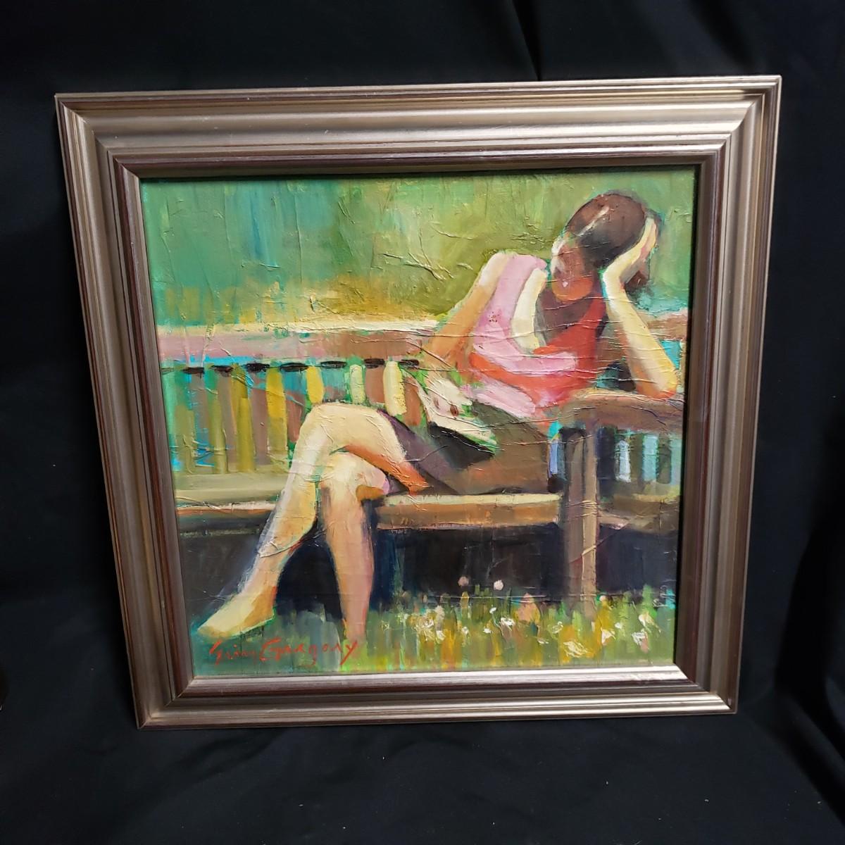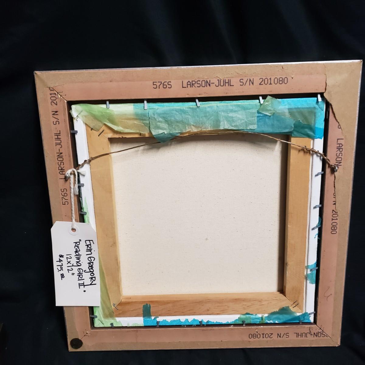 This 12" x 12" appears to be an oil painting signed by Erin Gregory is framed in a silver-metallic finished. The frame is wood without glass.