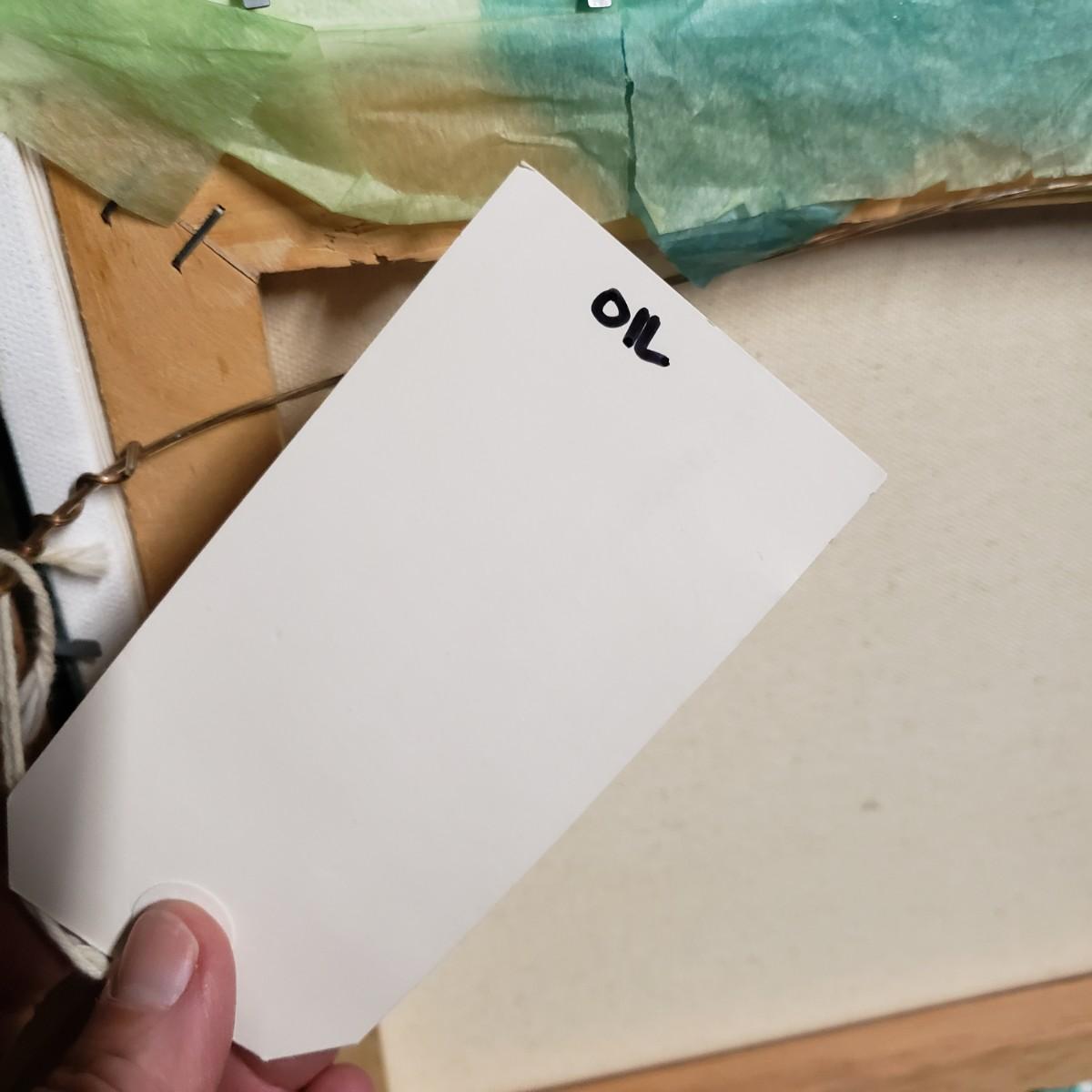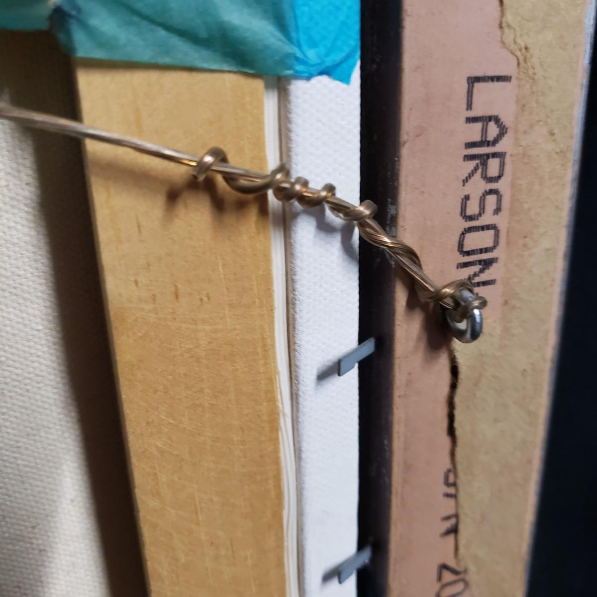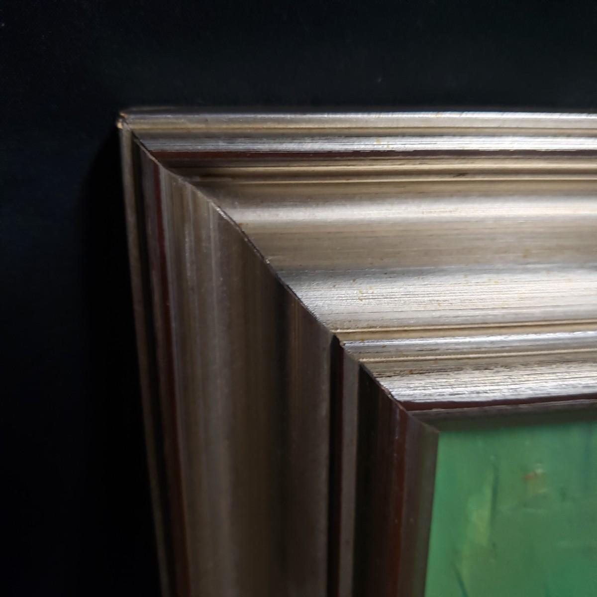 This 12" x 12" appears to be an oil painting signed by Erin Gregory is framed in a silver-metallic finished. The frame is wood without glass.