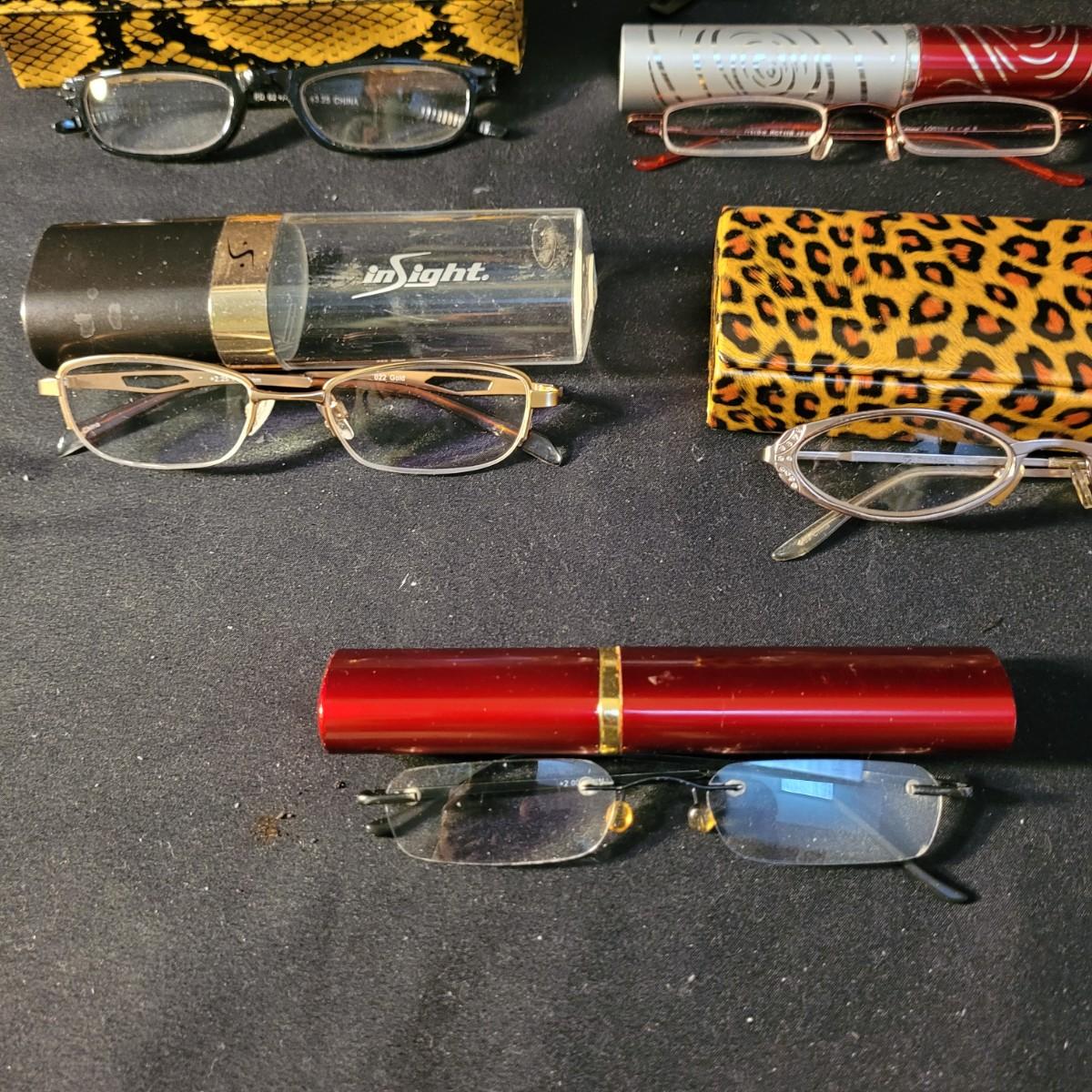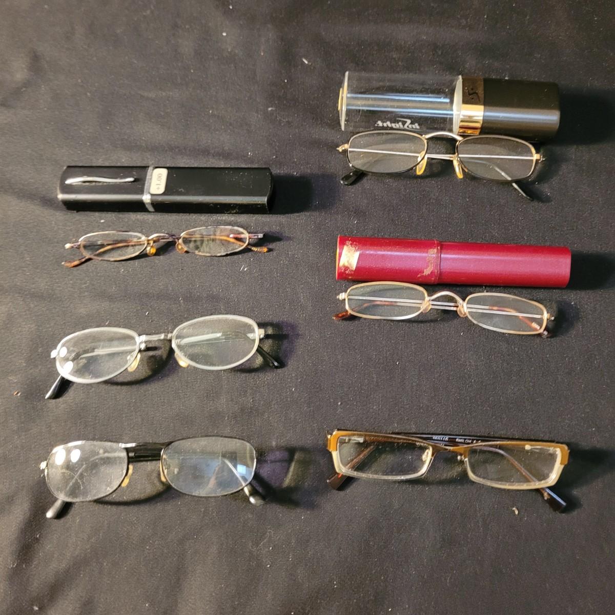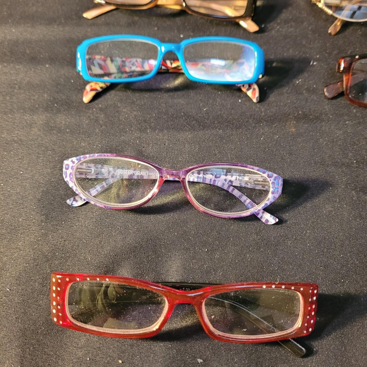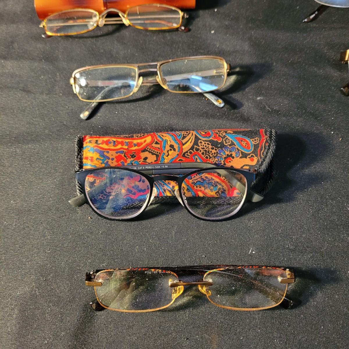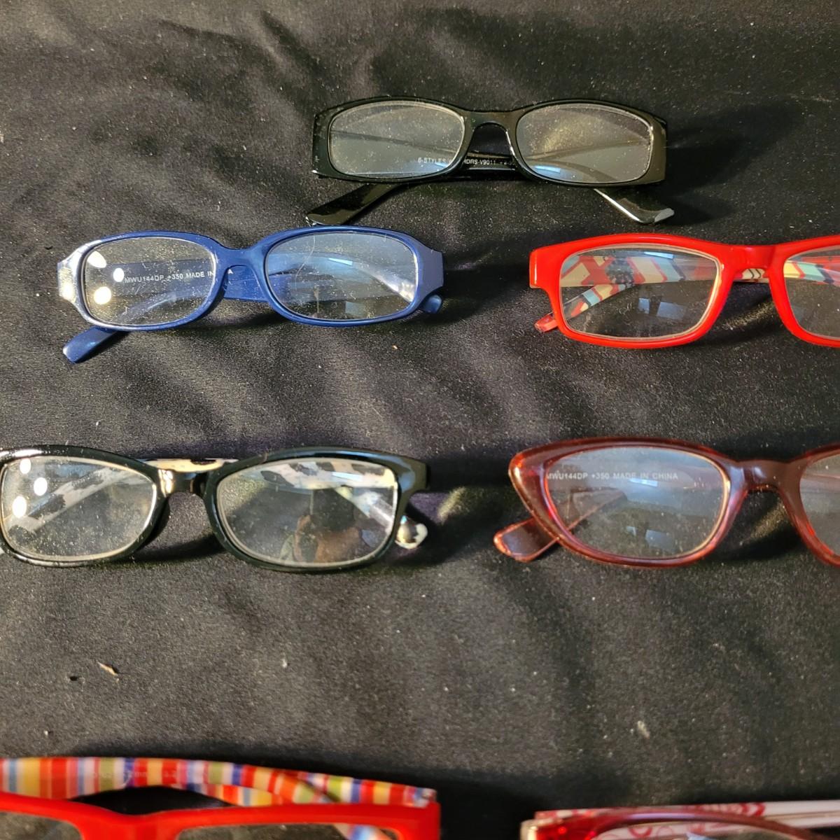 A huge variety of wire and plastic frame reading glasses in many styles. Most glasses are 3.25-3.50 with some 2.50 strength. Accompanied by a wide variety of cases as well. Shipping available.