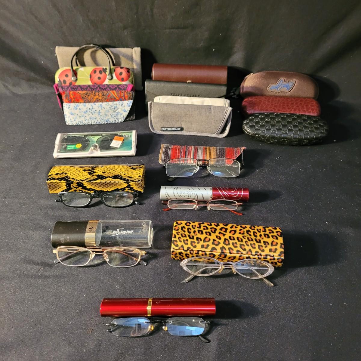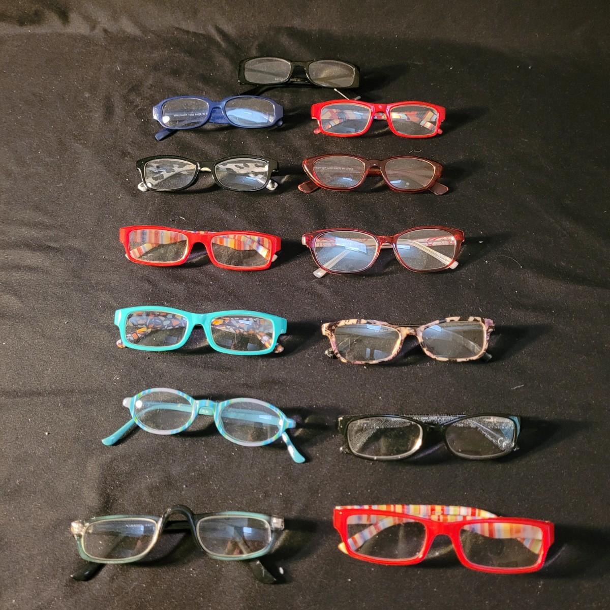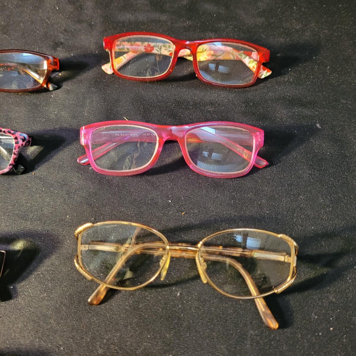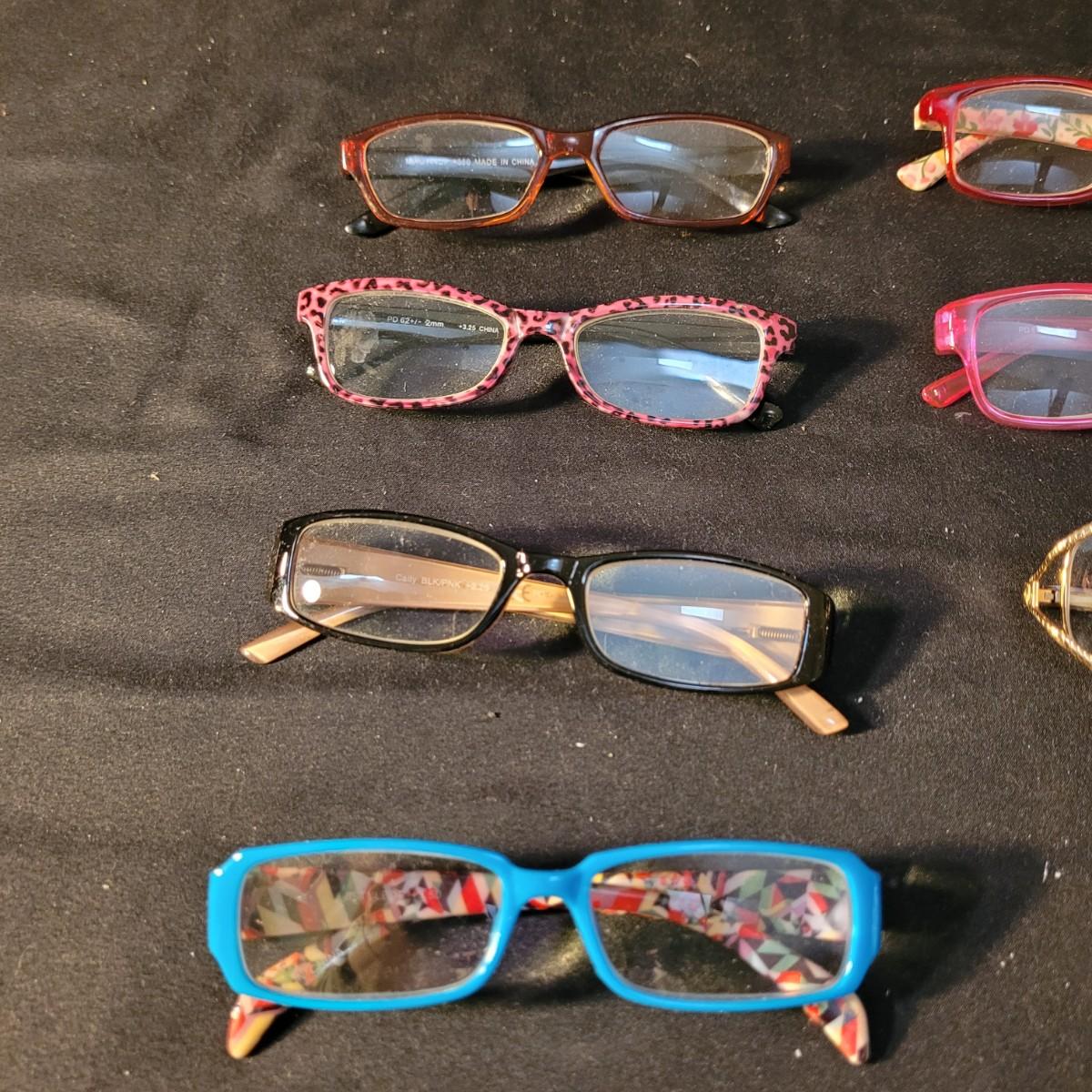 A huge variety of wire and plastic frame reading glasses in many styles. Most glasses are 3.25-3.50 with some 2.50 strength. Accompanied by a wide variety of cases as well. Shipping available.