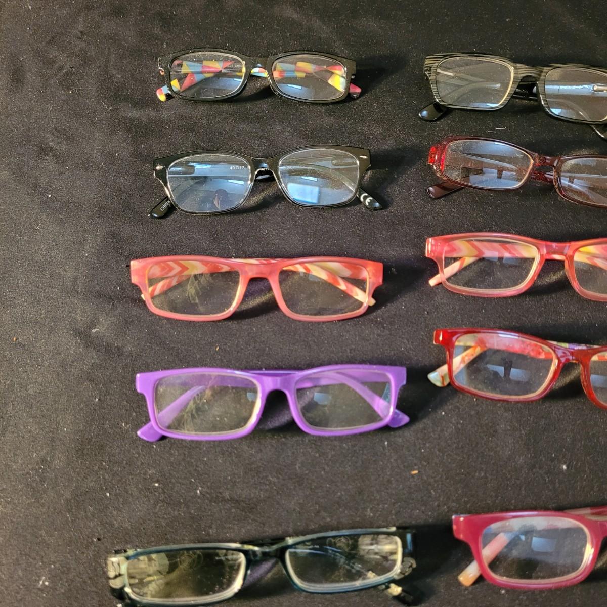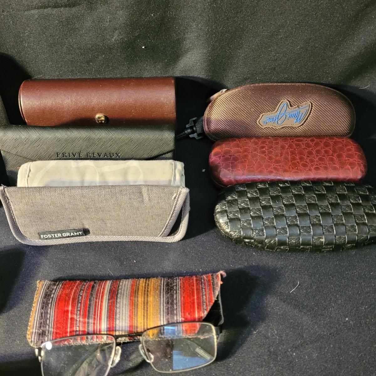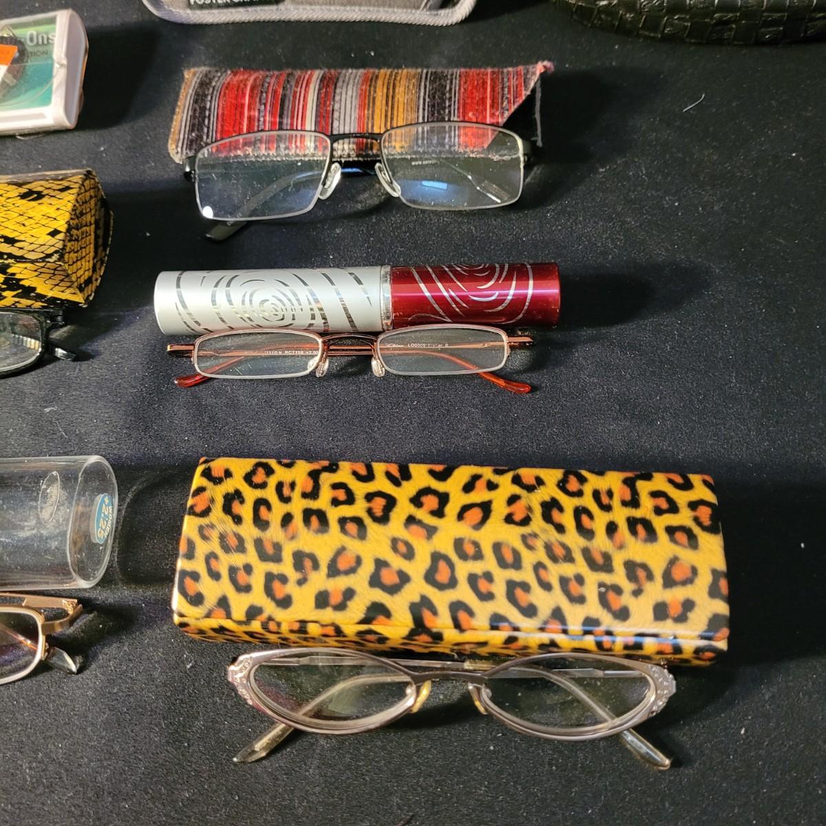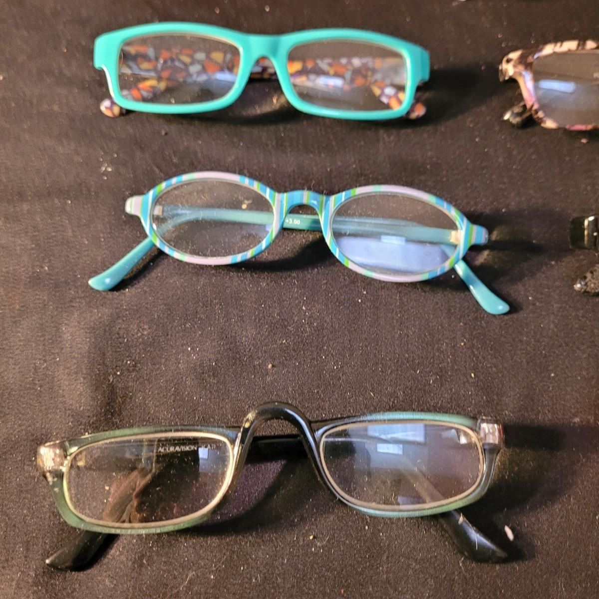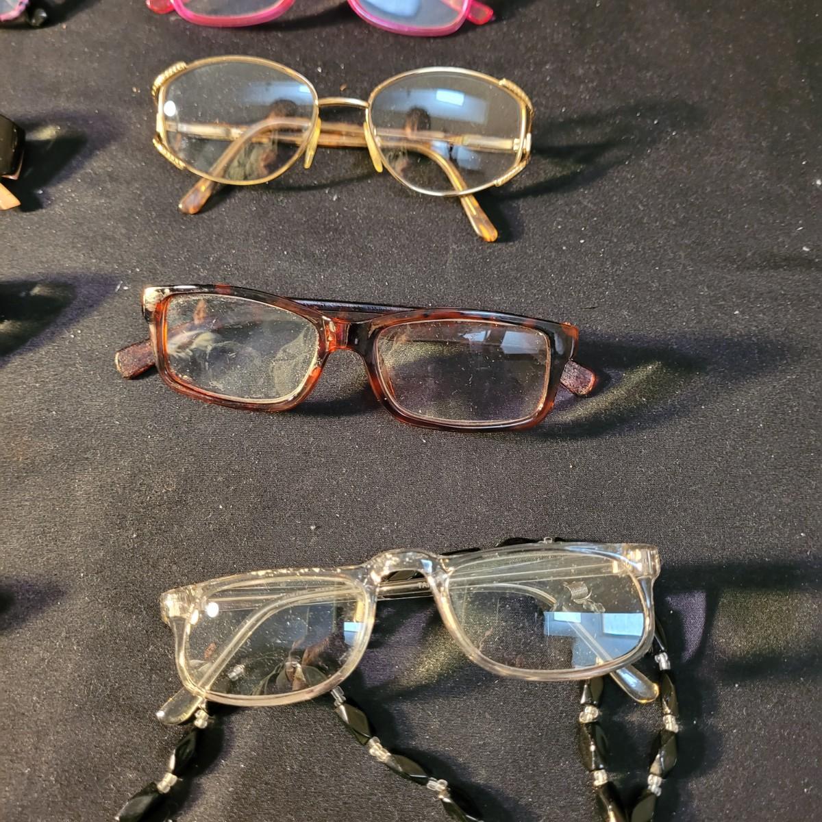 A huge variety of wire and plastic frame reading glasses in many styles. Most glasses are 3.25-3.50 with some 2.50 strength. Accompanied by a wide variety of cases as well. Shipping available.