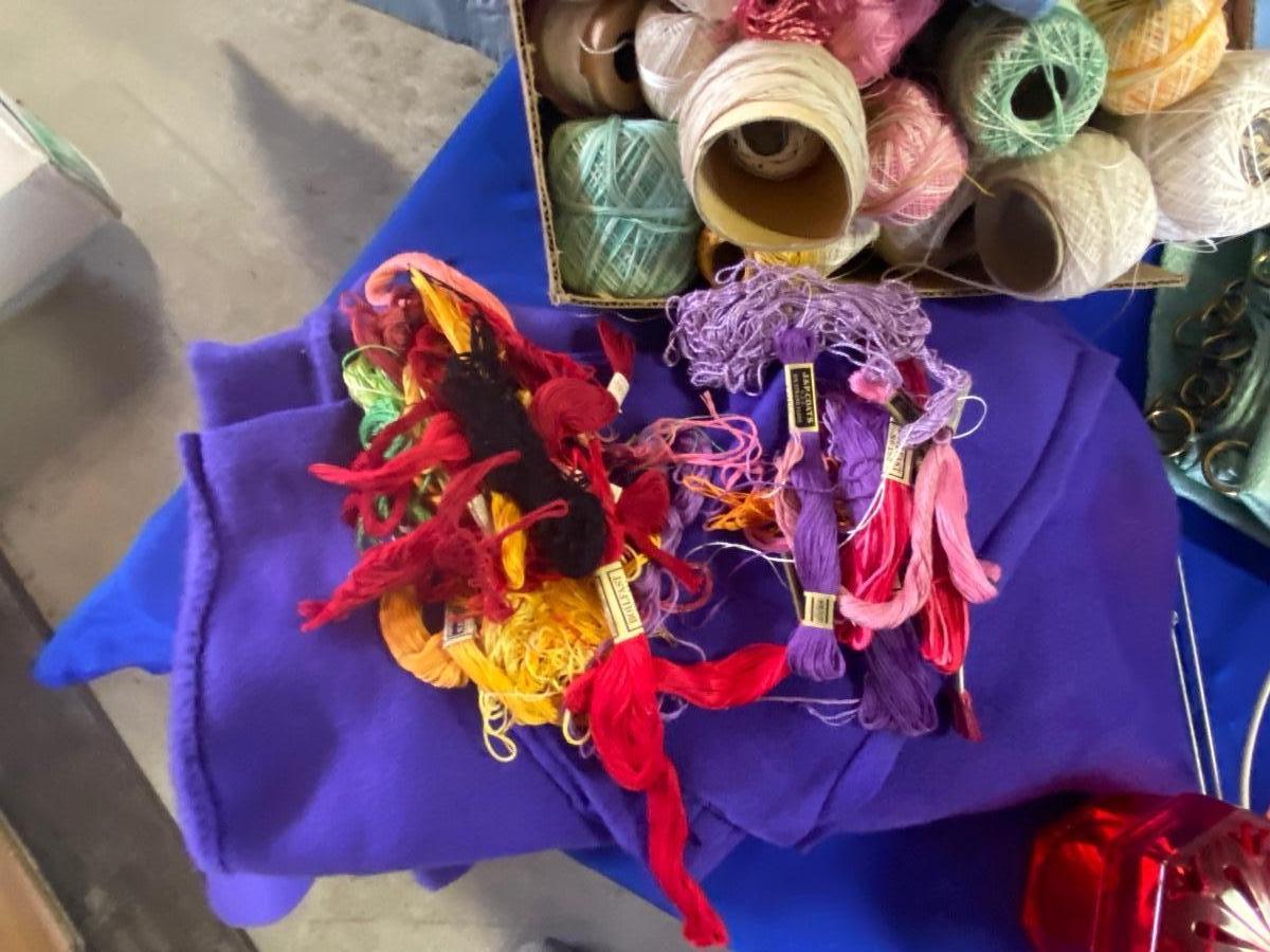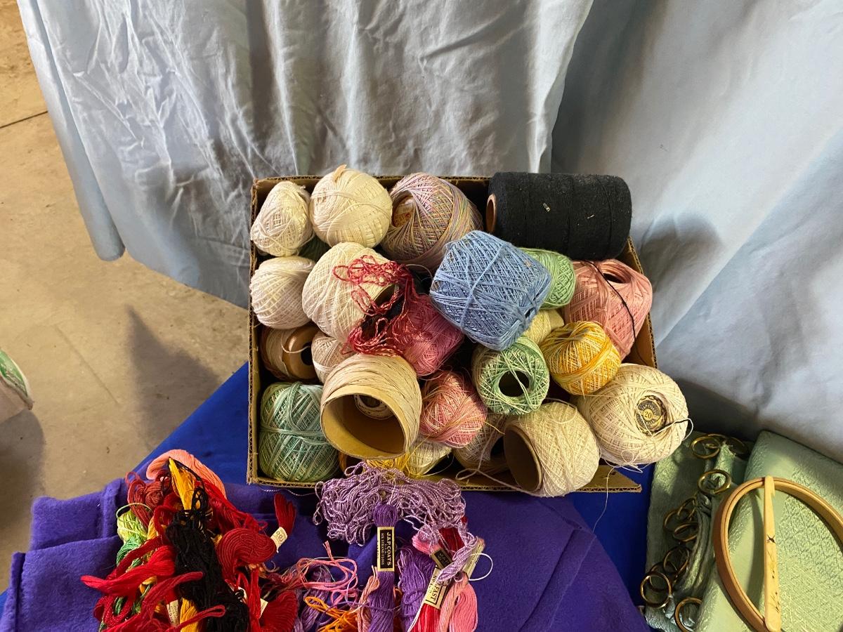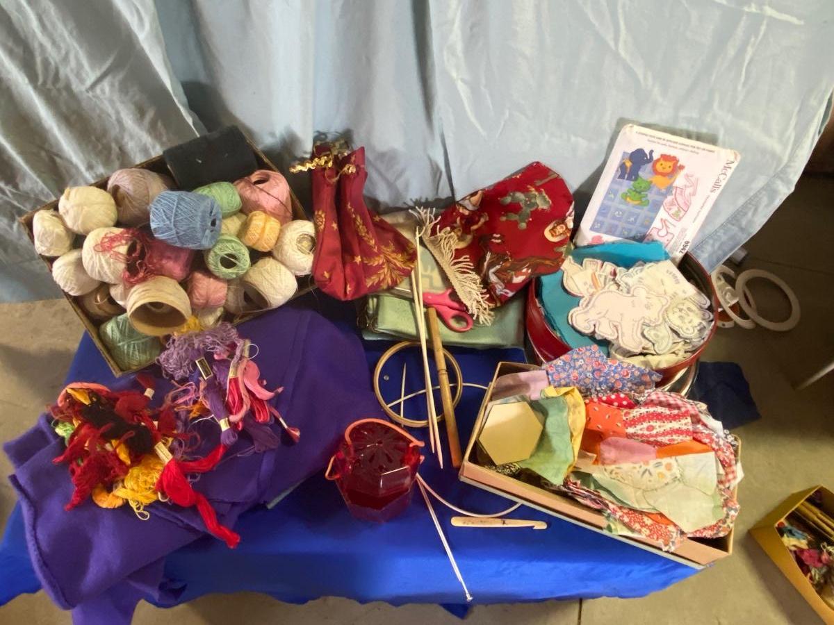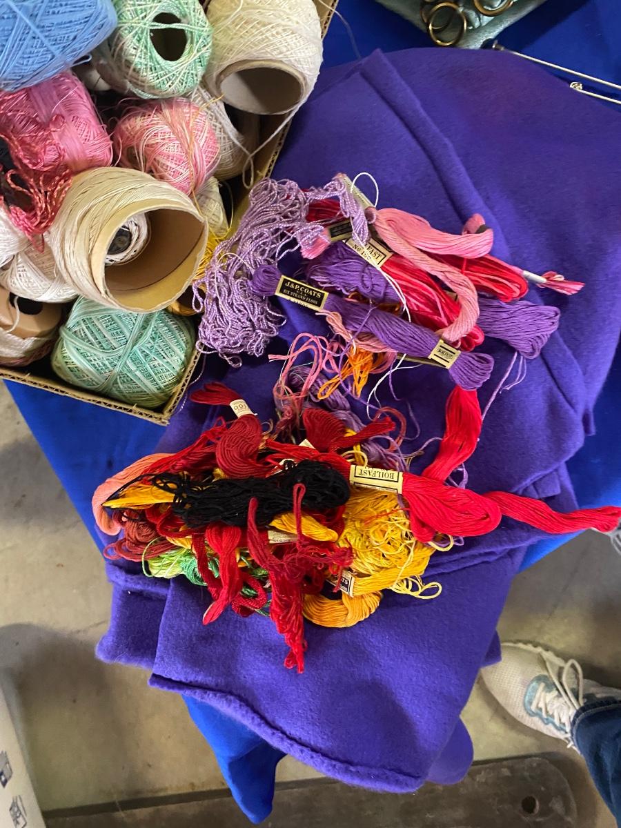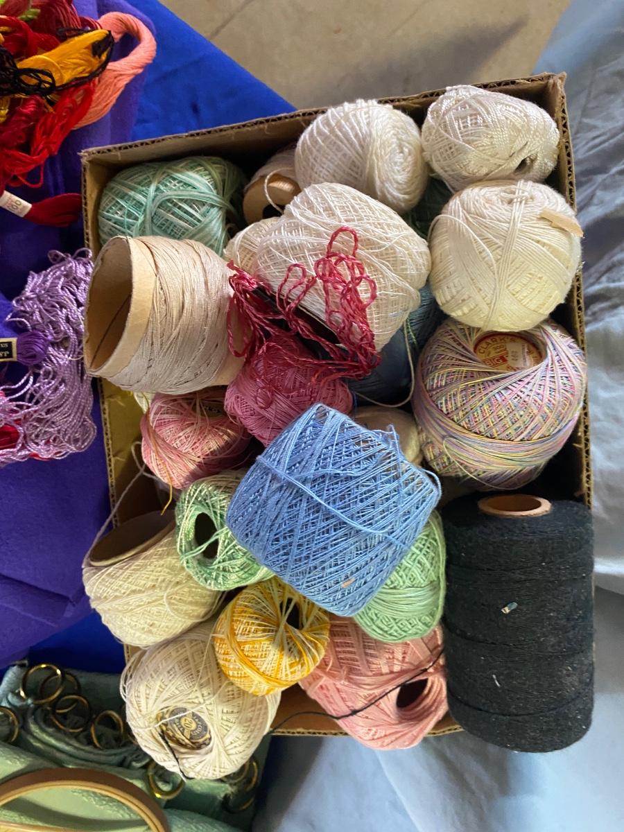 READY TO GO QUILT CUT OUTS, EMBROIDERY THREAT, A HUGE BOX OF CROQUET OR KNITTING THREAD AND MORE!