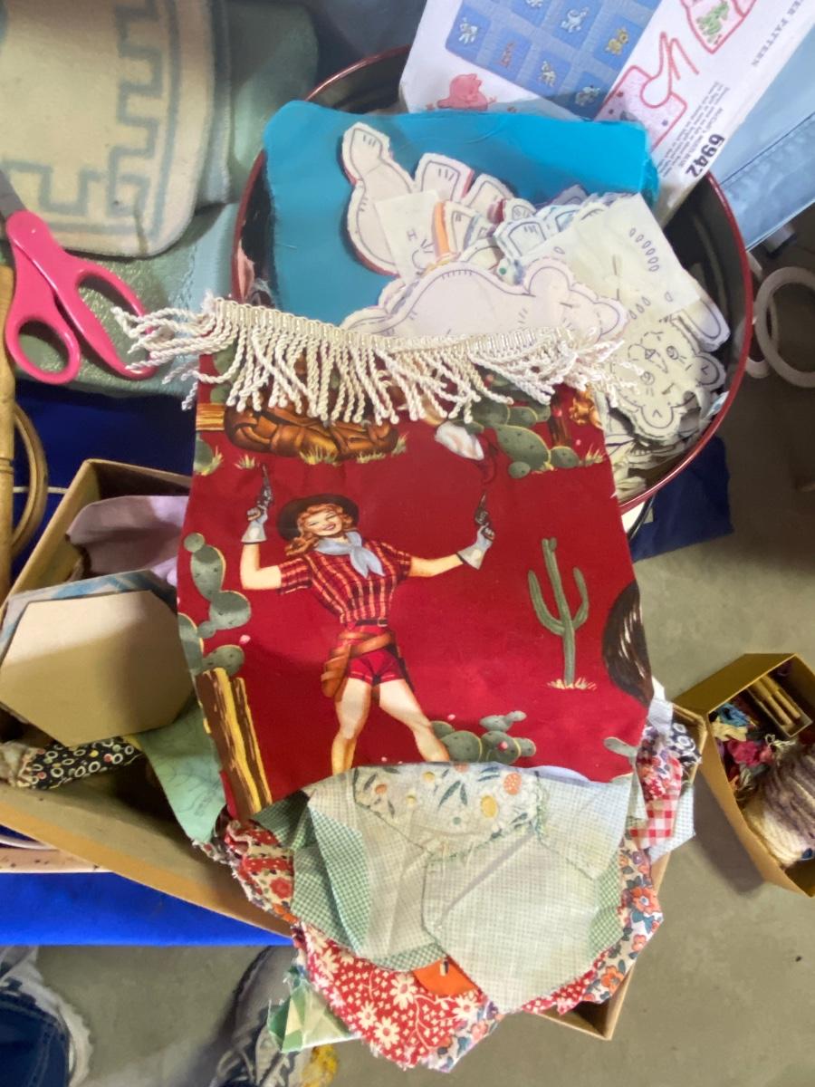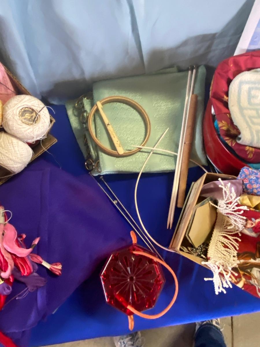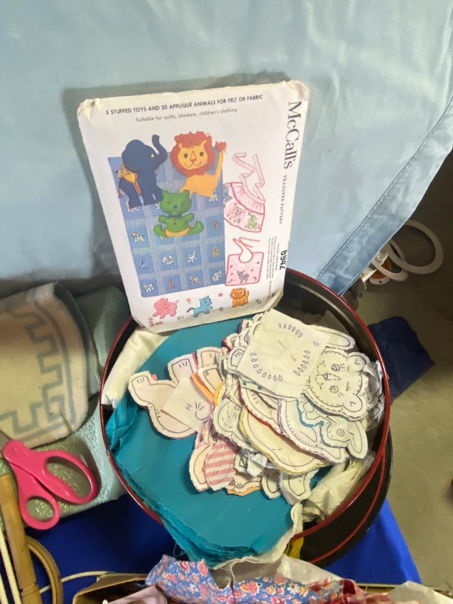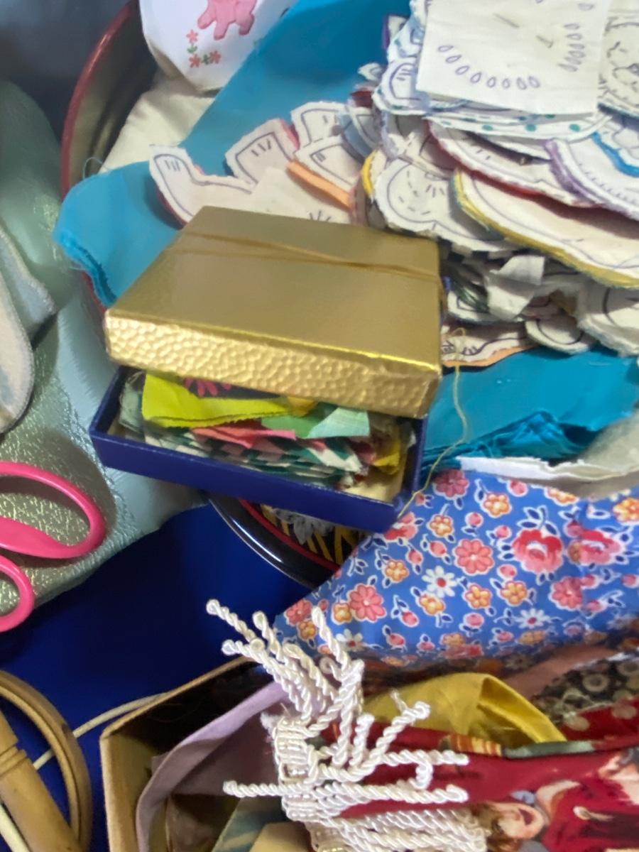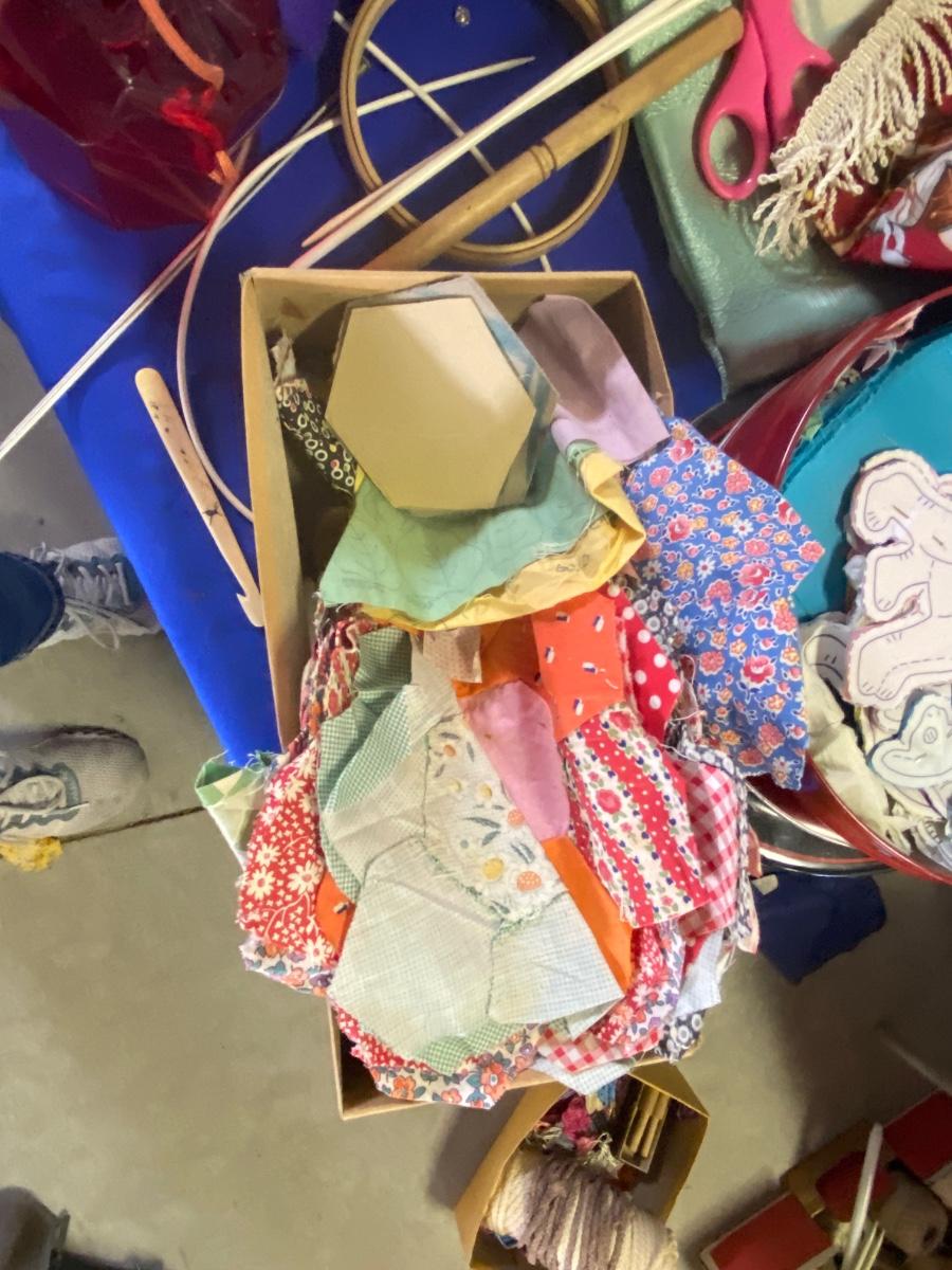 READY TO GO QUILT CUT OUTS, EMBROIDERY THREAT, A HUGE BOX OF CROQUET OR KNITTING THREAD AND MORE!