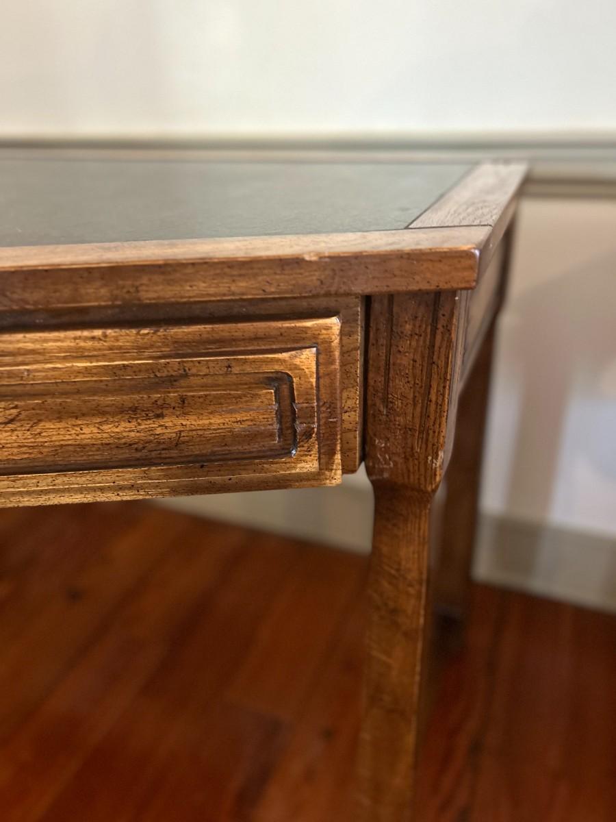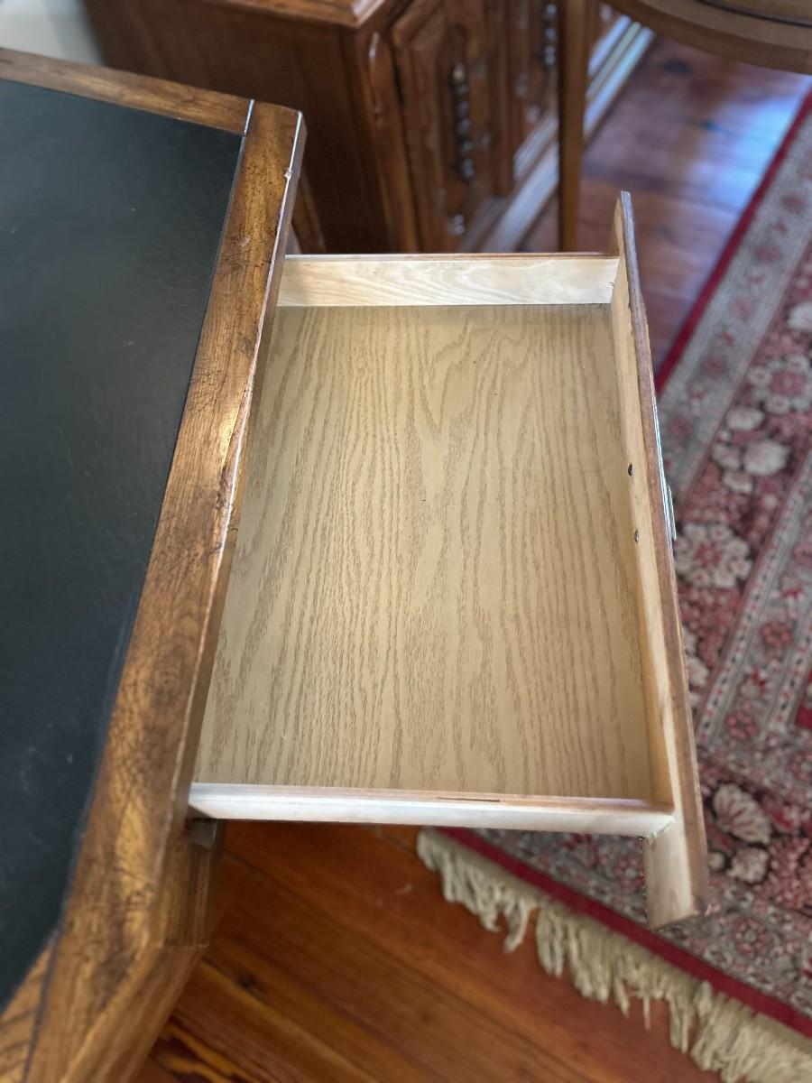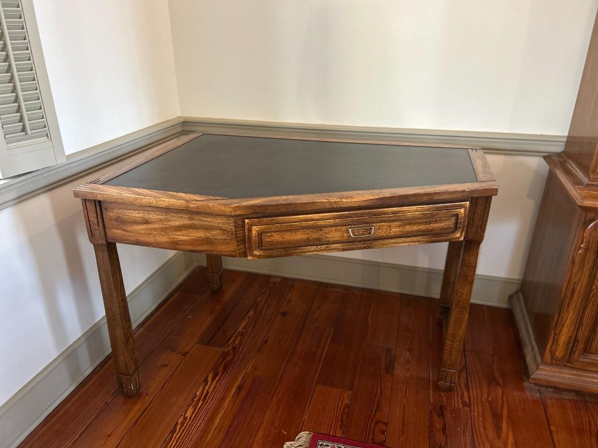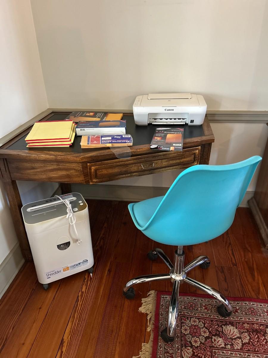 Leather top desk, fun rolling chair, printer and paper shredder and you're ready to start! Desk measures 30hx44wx30d
