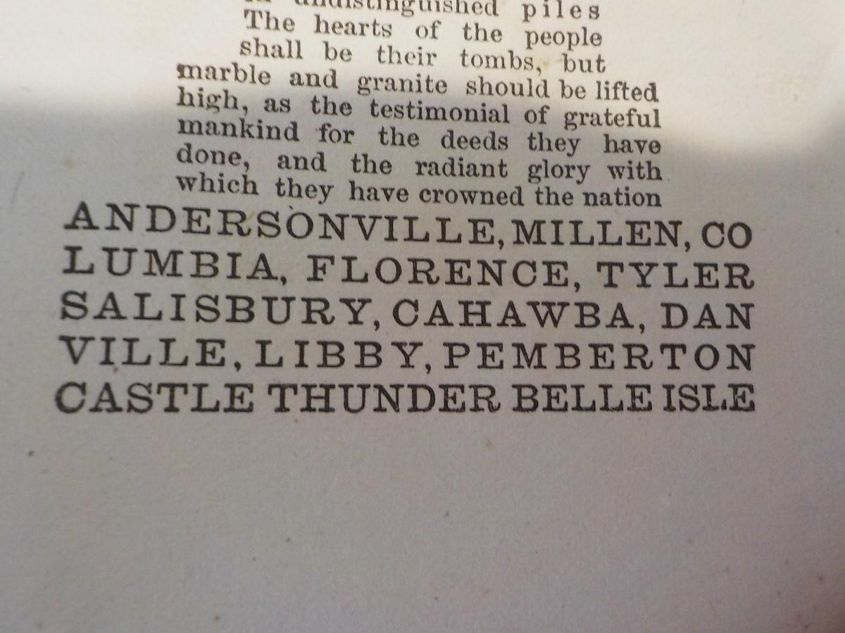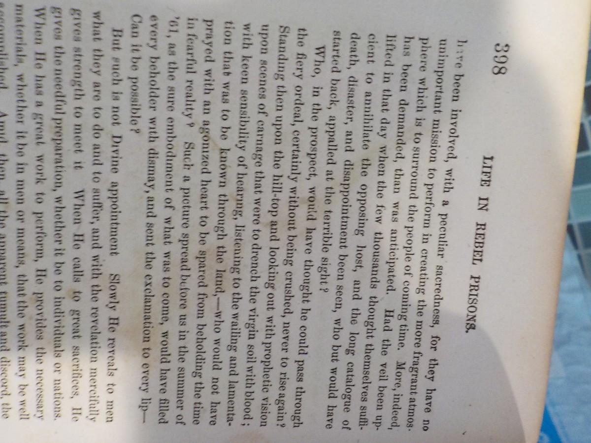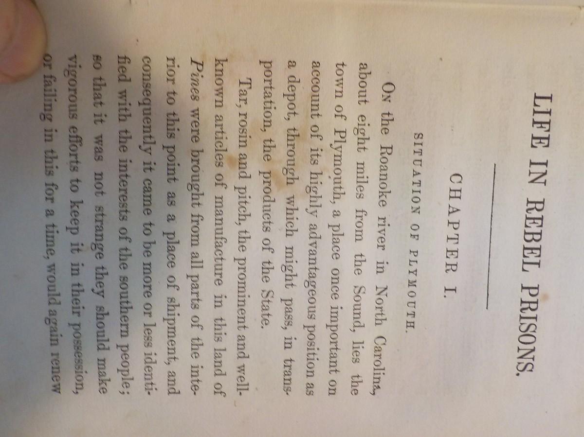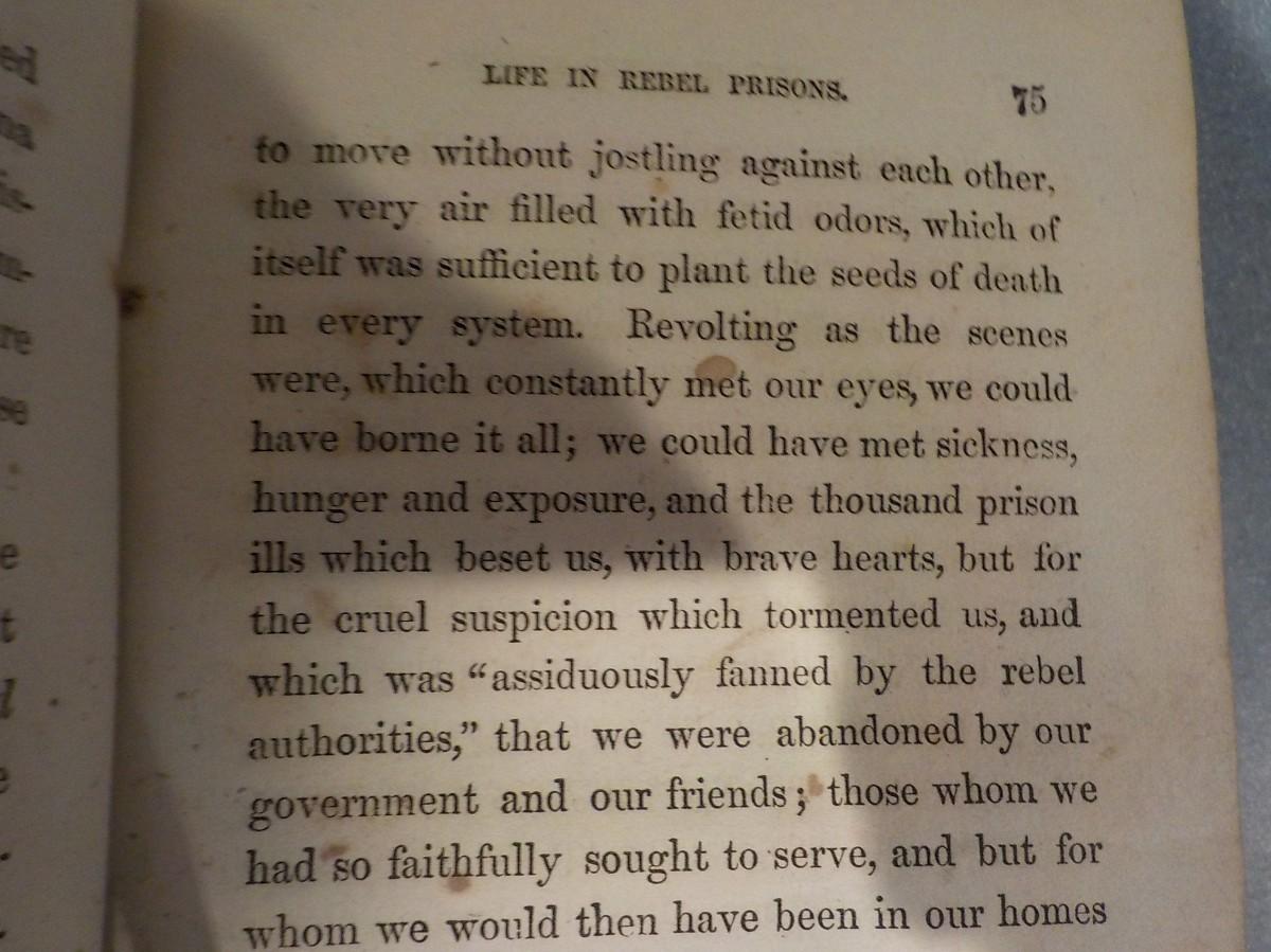 This book was very limited written, needed special permits. Hands on view how Union Soldiers were treated and killed in confederate prisons..Book in fair shape all pages are there approx. 430, binding is together but must be handled with care, .after all it is ONLY 157 YEARS OLD.....hAT IS COOL BUT A NICE REPRODUCTION...