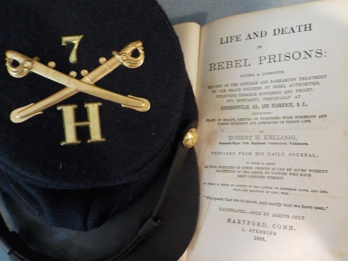 Real 1866 Civil War Book & Hat (repro) " Life and Death in Rebel Prisons". / est. $50 to $200.
