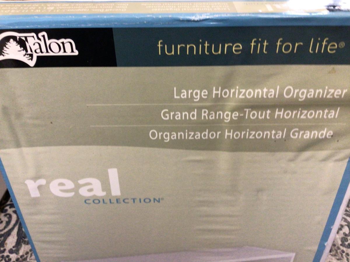 The is a large horizontal organizer with two shelves. It is brand new in the box, made in the USA. White in color.