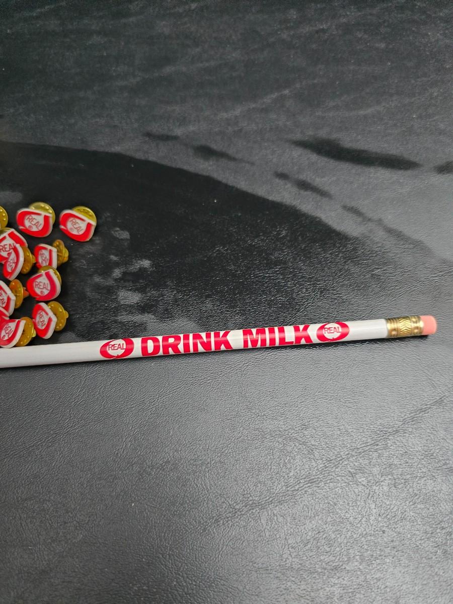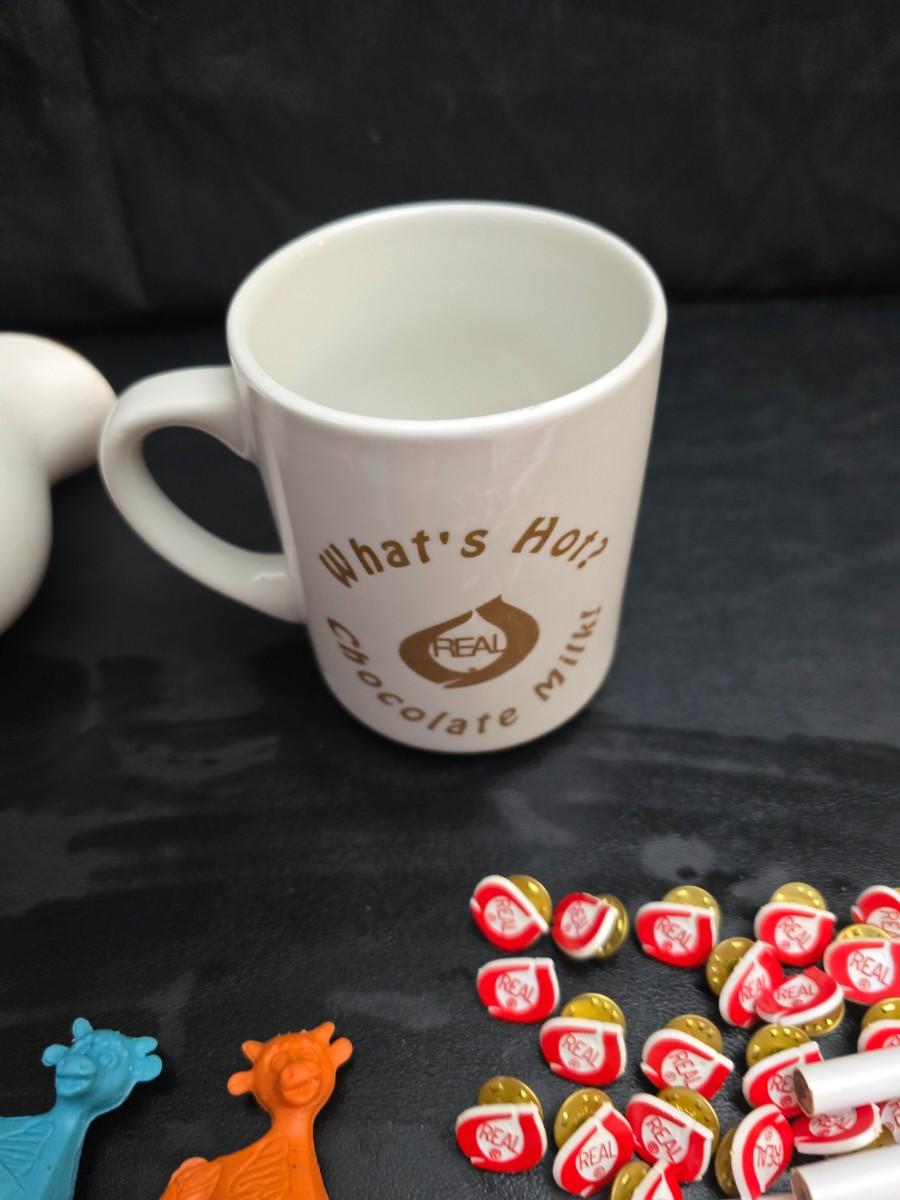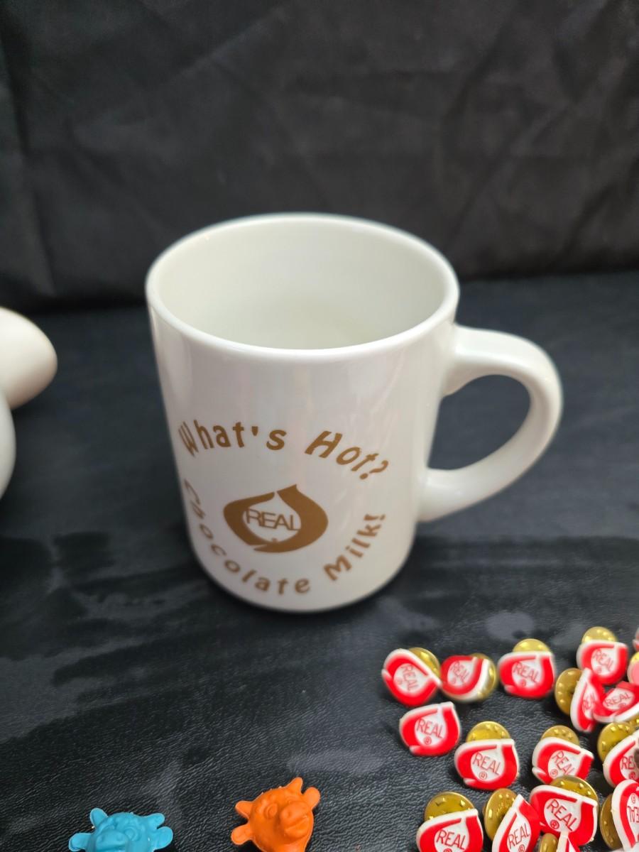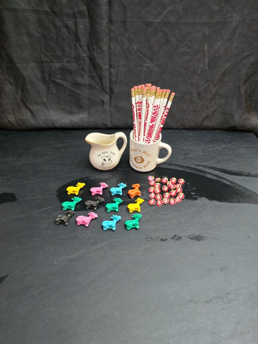 REAL Dairy collectibles -"What's Hot? Real Chocolate Milk" coffee mug. - Mcoy miniature cow creamer pitcher that says "THE REAL THING Northern Colorado Dairyettes" on the front - vintage "Real" dairy logo lapel pins, likely from the 1970s.- several wooden pencils - and collection of rubber cows