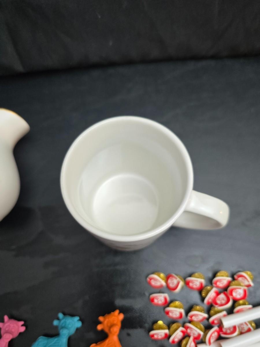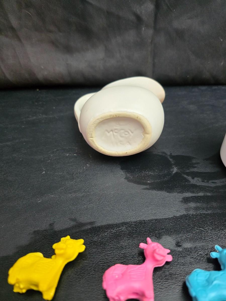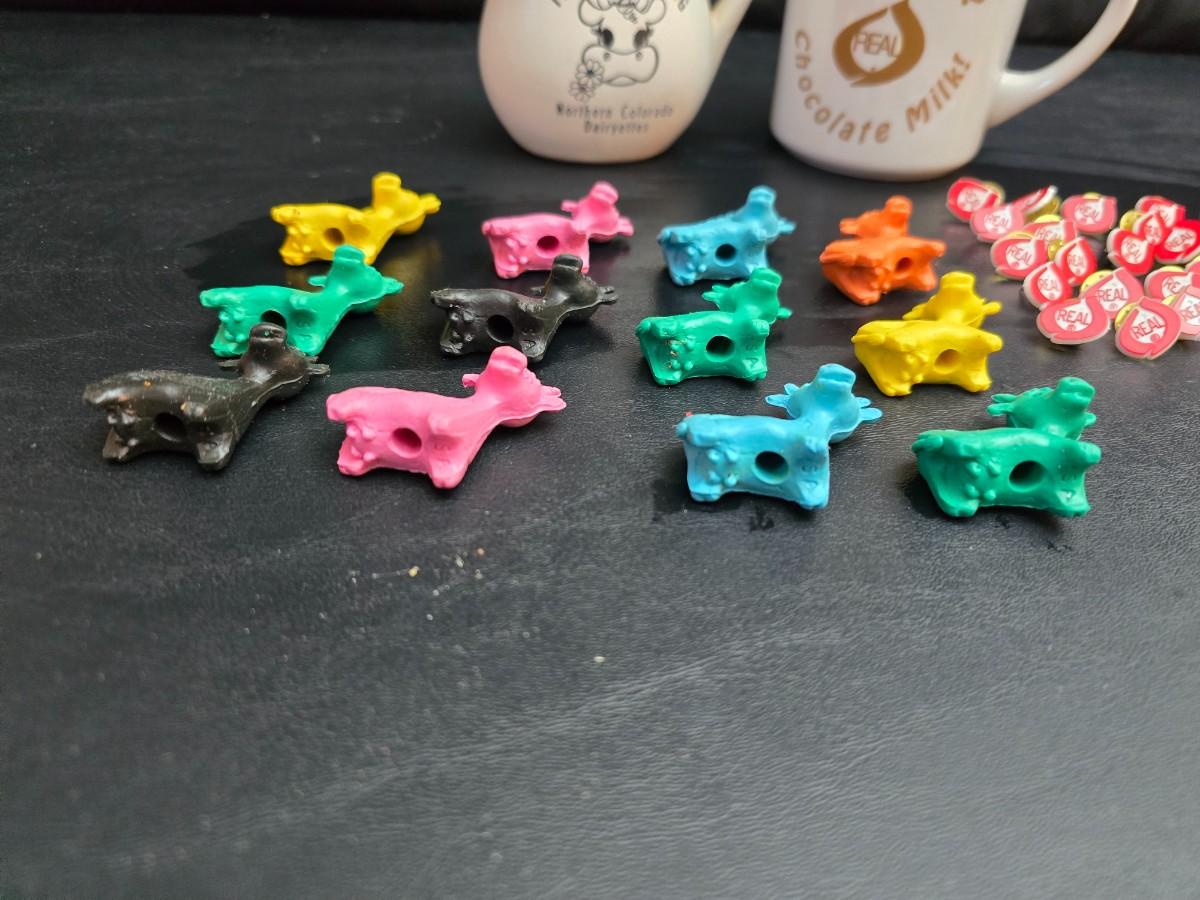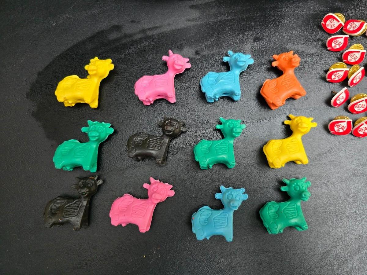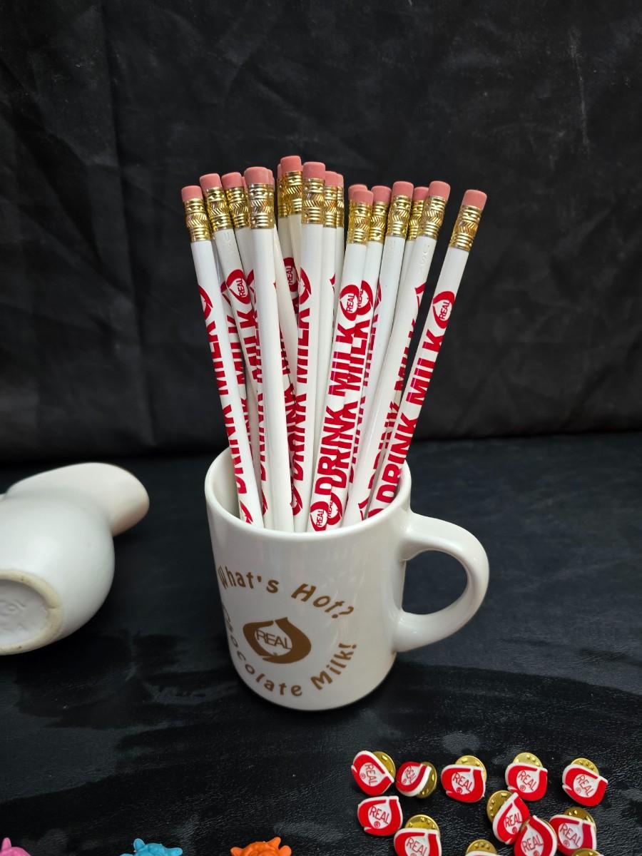 REAL Dairy collectibles -"What's Hot? Real Chocolate Milk" coffee mug. - Mcoy miniature cow creamer pitcher that says "THE REAL THING Northern Colorado Dairyettes" on the front - vintage "Real" dairy logo lapel pins, likely from the 1970s.- several wooden pencils - and collection of rubber cows