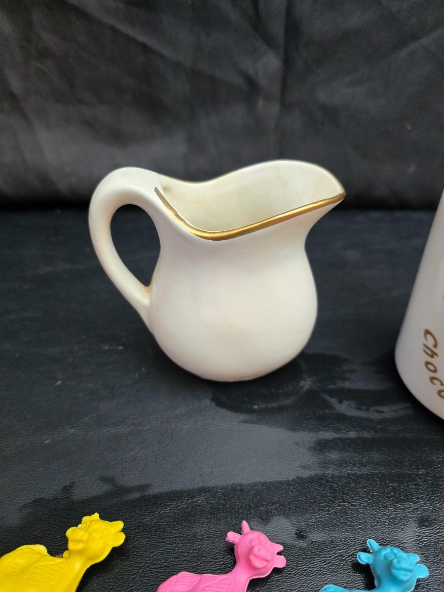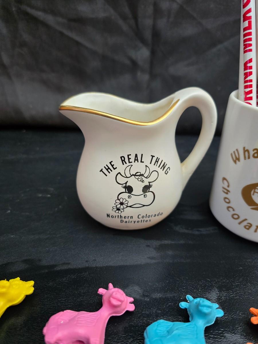 REAL Dairy collectibles -Real Chocolate Milk coffee mug. - Mcoy miniature cow creamer pitcher Northern Colorado Dairyettes" -vintage "Real" dairy logo lapel pins, AND MORE!