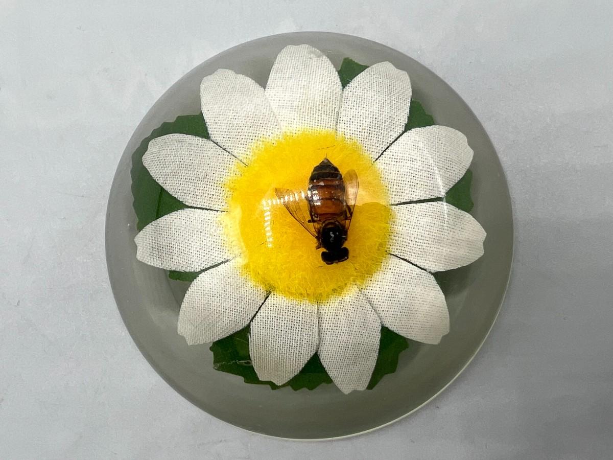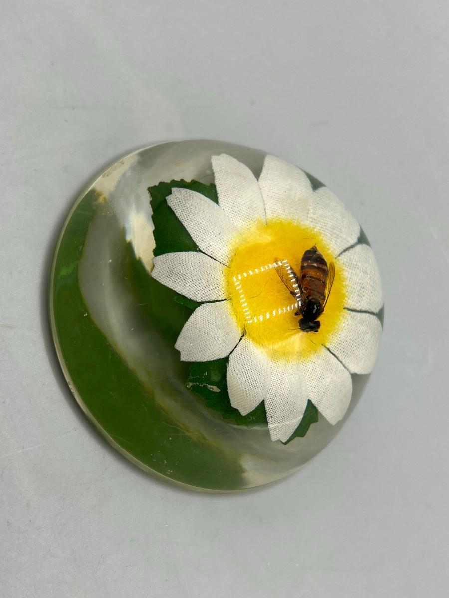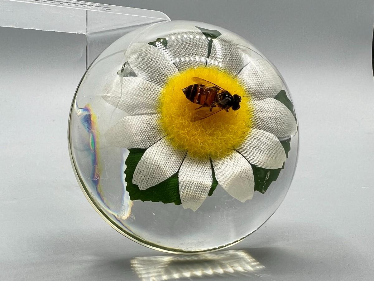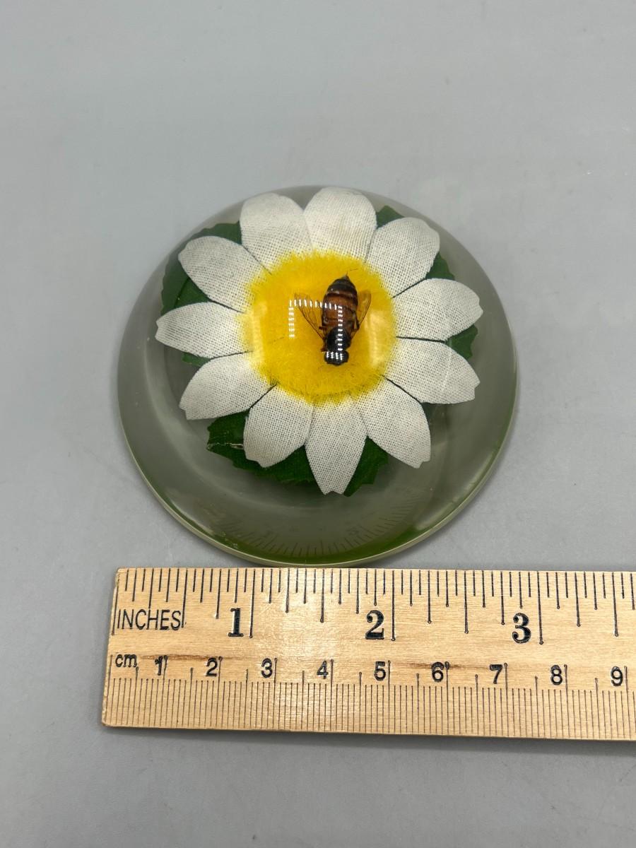 Real Honey Bee on Faux Daisy Springtime Resin Paperweight, there is no significant damage to the paperweight and is in good displayable condition. Check pictures for more details and for sizing.