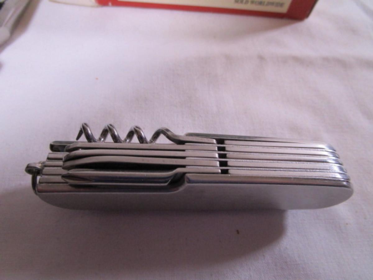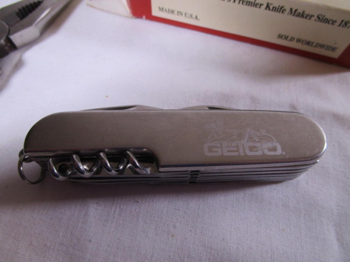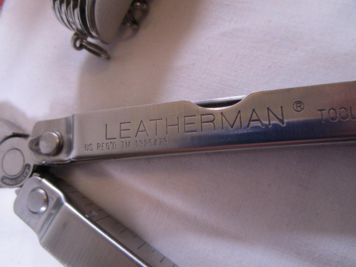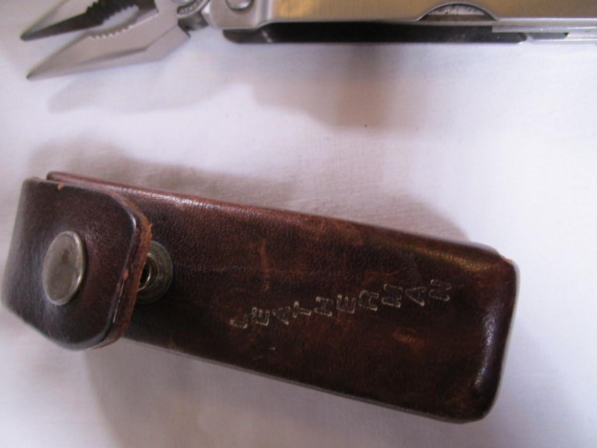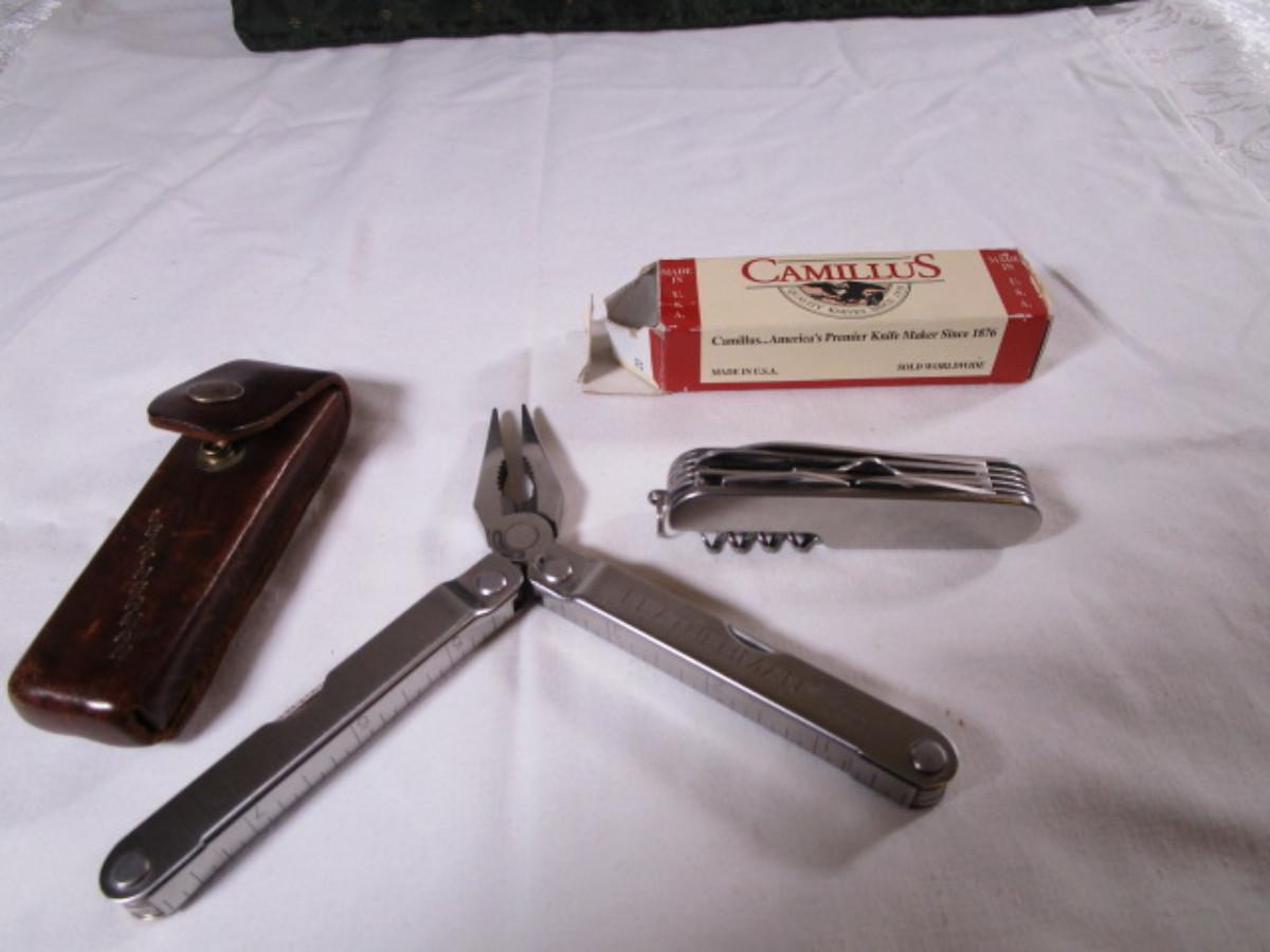 Real Leatherman with hard leather case; Geico multi-tool knife by Camillus