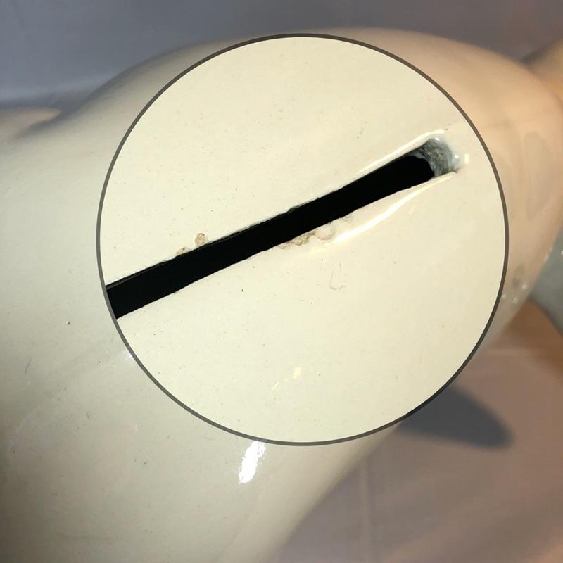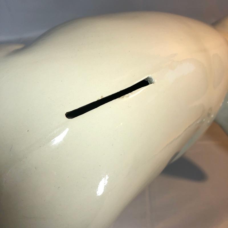 Large, oversized. Some flea bites on coin slot and needs new plug (easily purchased or wax DIY).