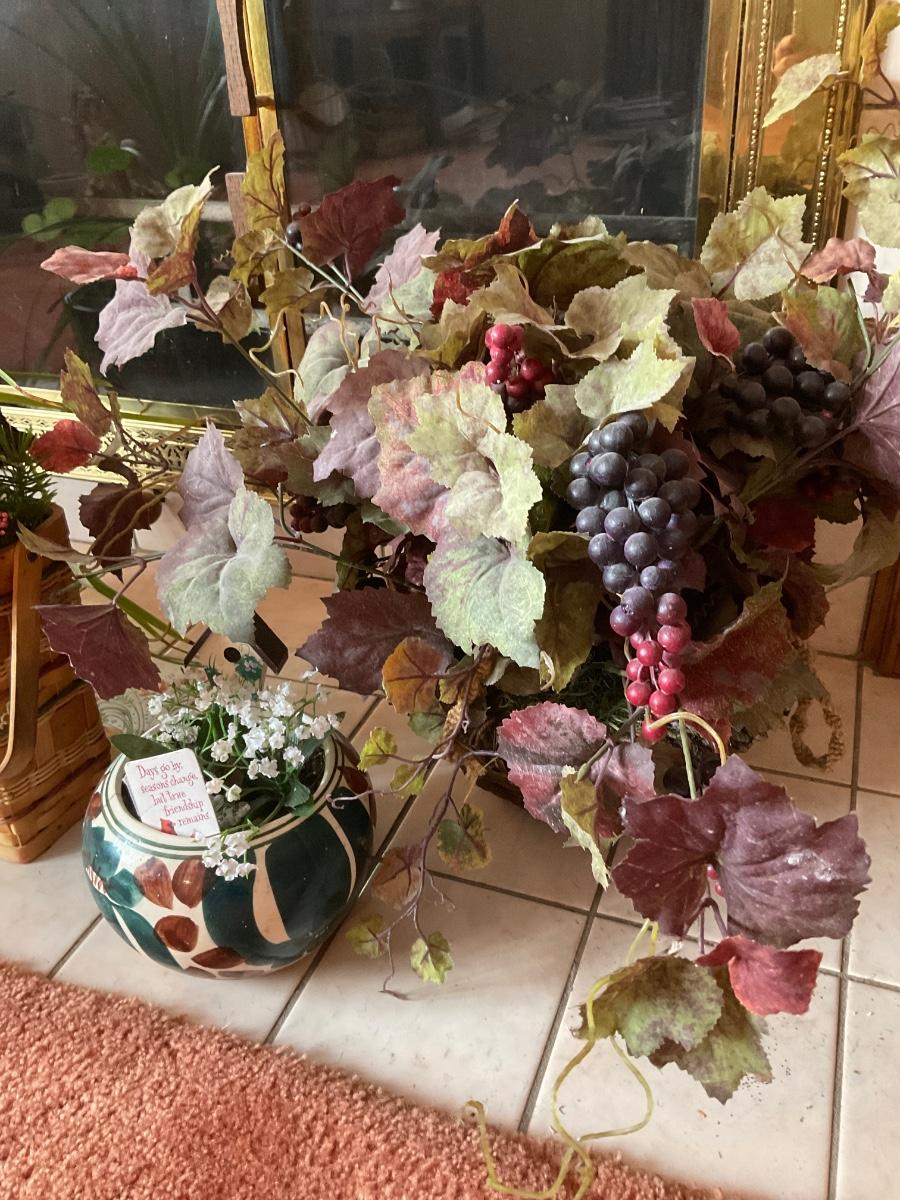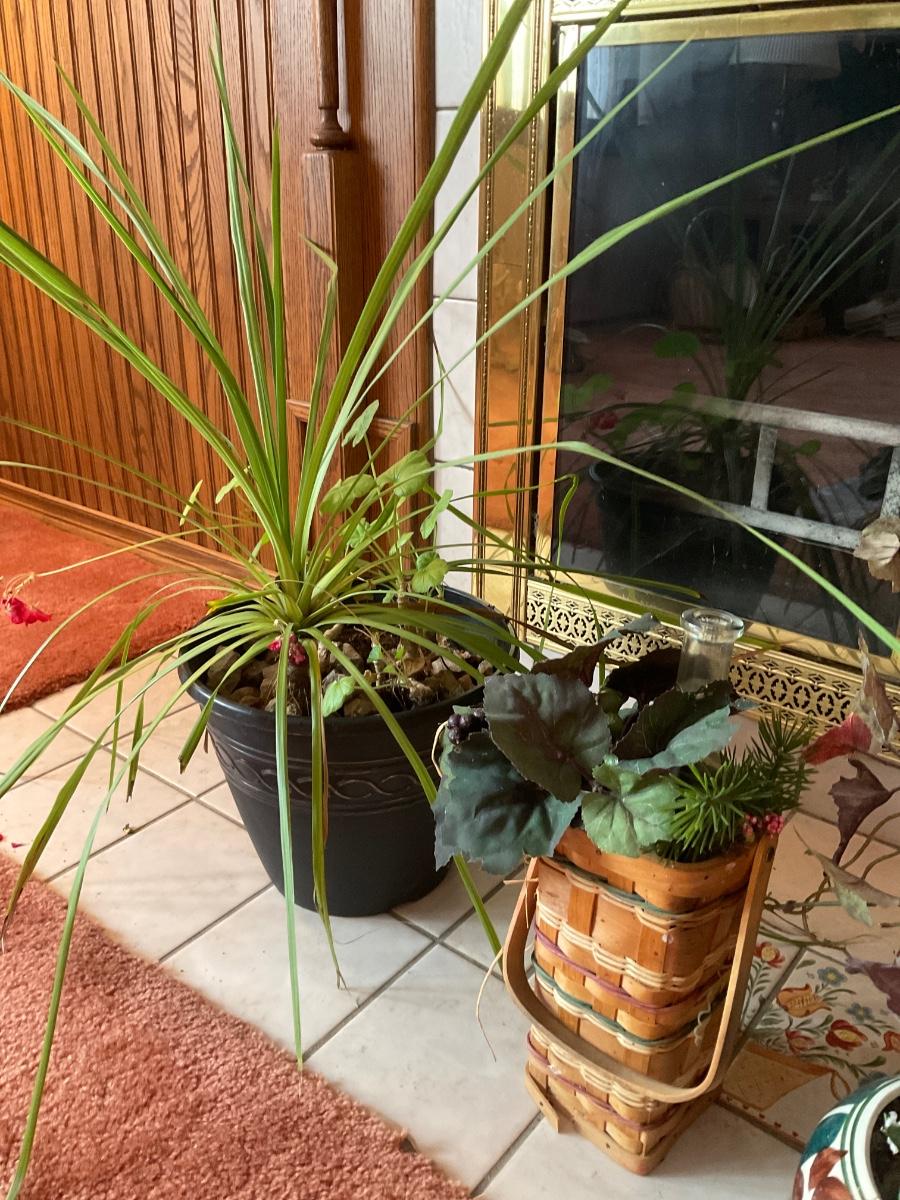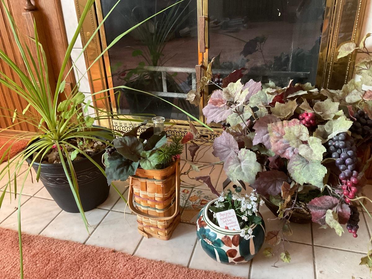 Real plant & 2 faux plants & wicker wine bottle