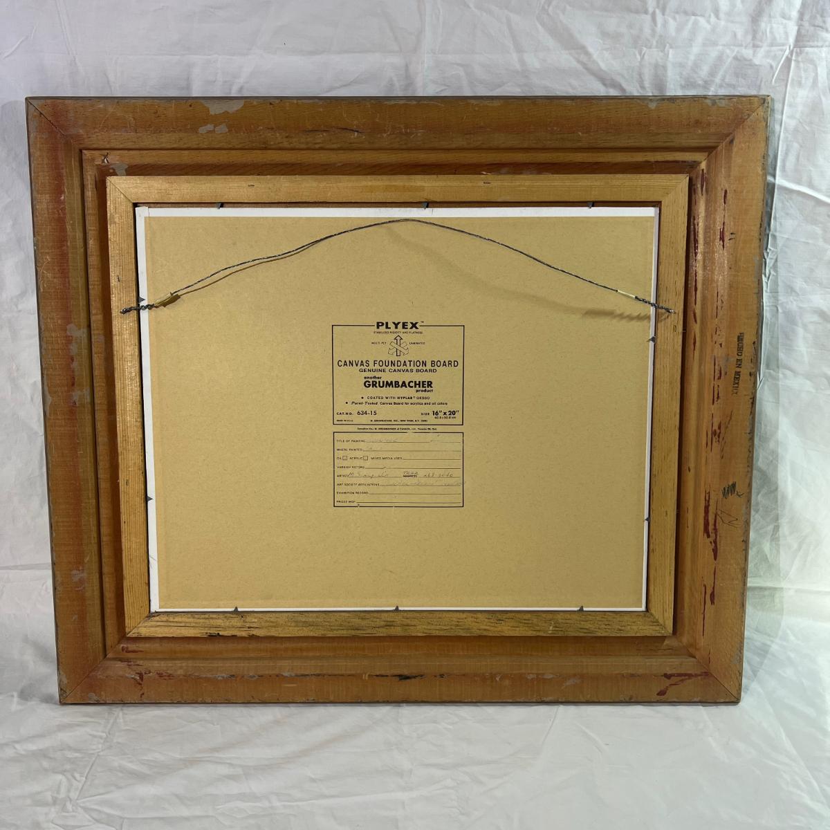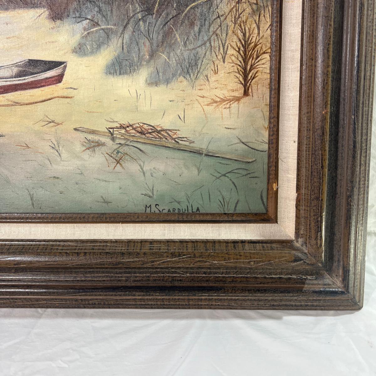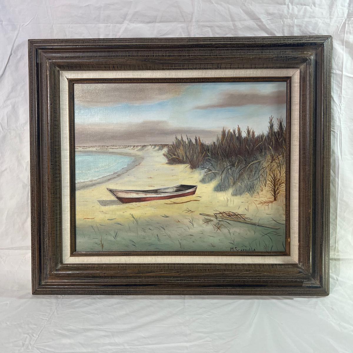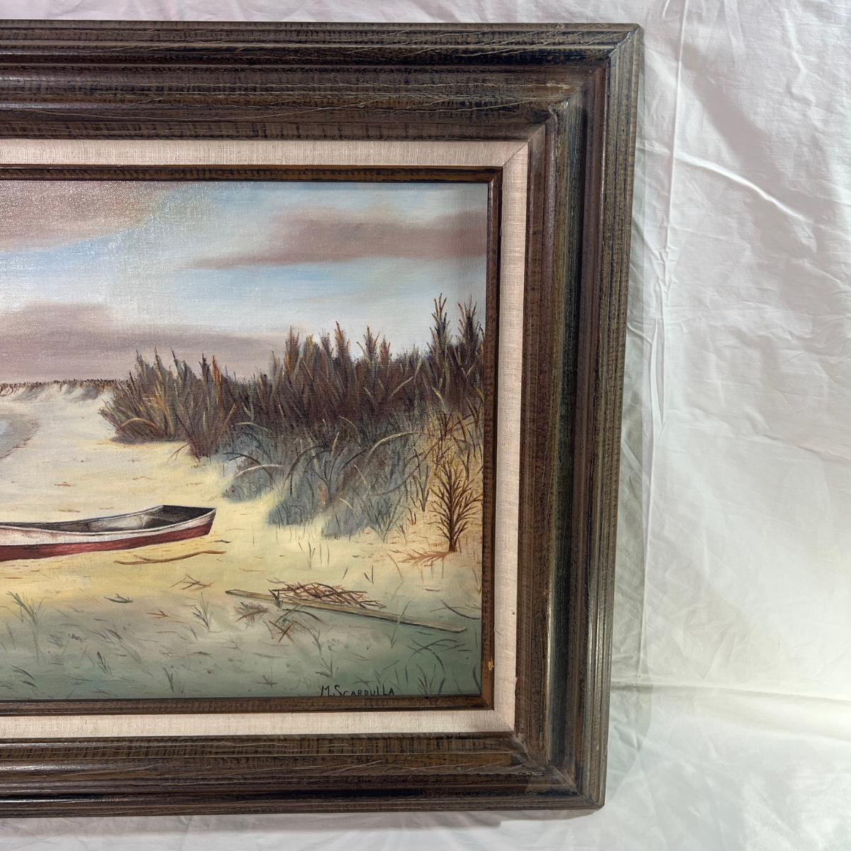 Real Wood Framed Art of Beach Front Landscape with Boat. Artist signed M. Scarpulla believed to be an oil painting with dimensions being 28" x 23 3/4" some scratches/ Dings on wood frame.