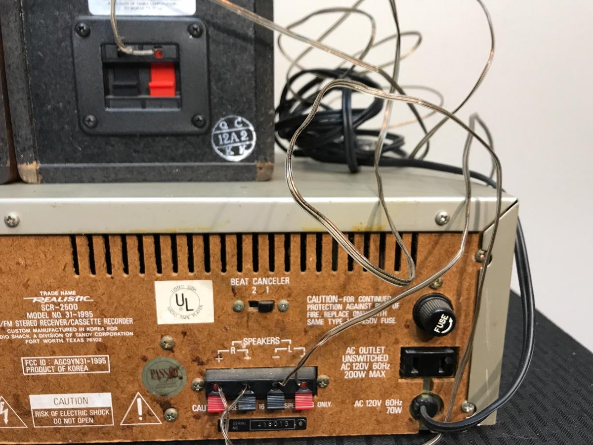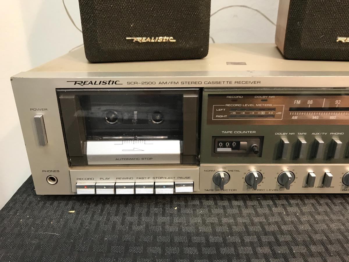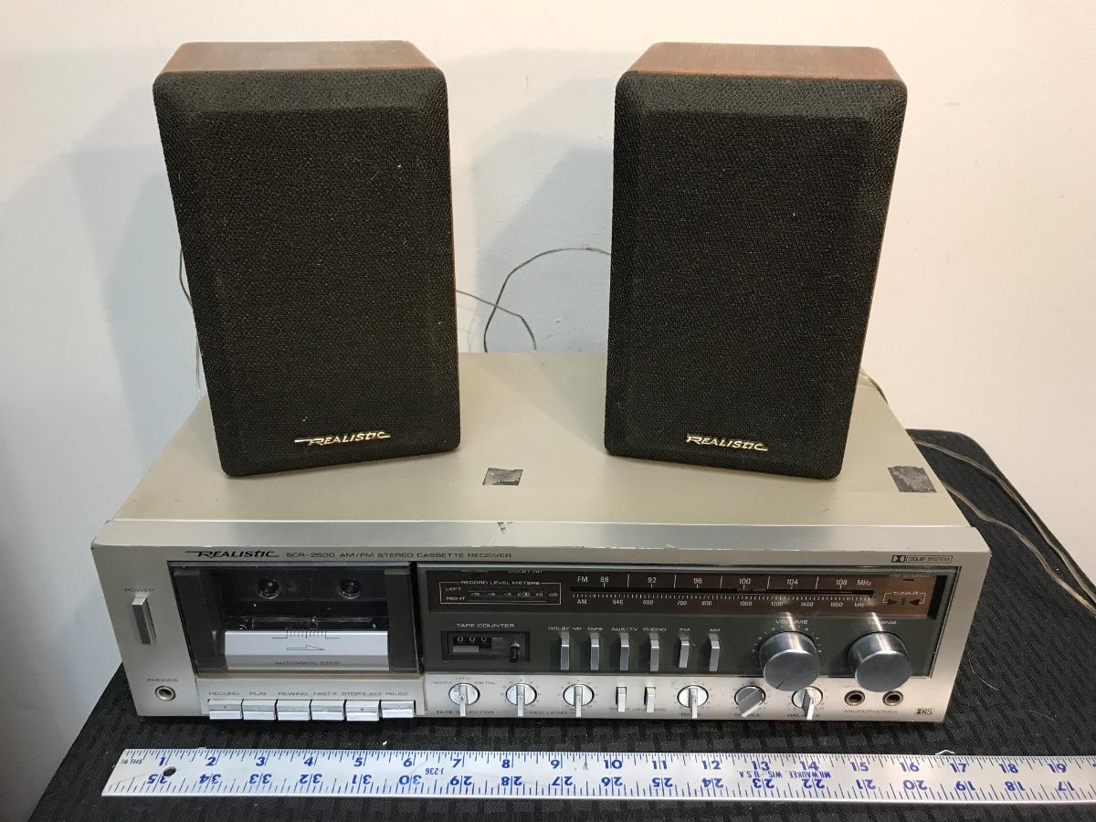 Vintage Realistic AM/FM Stereo Cassette Receiver SCR-2500, there is no significant wear to the cassette player and is in good vintage condition. Has been plugged in and tested, works perfectly. Check pictures for more details and for sizing.
