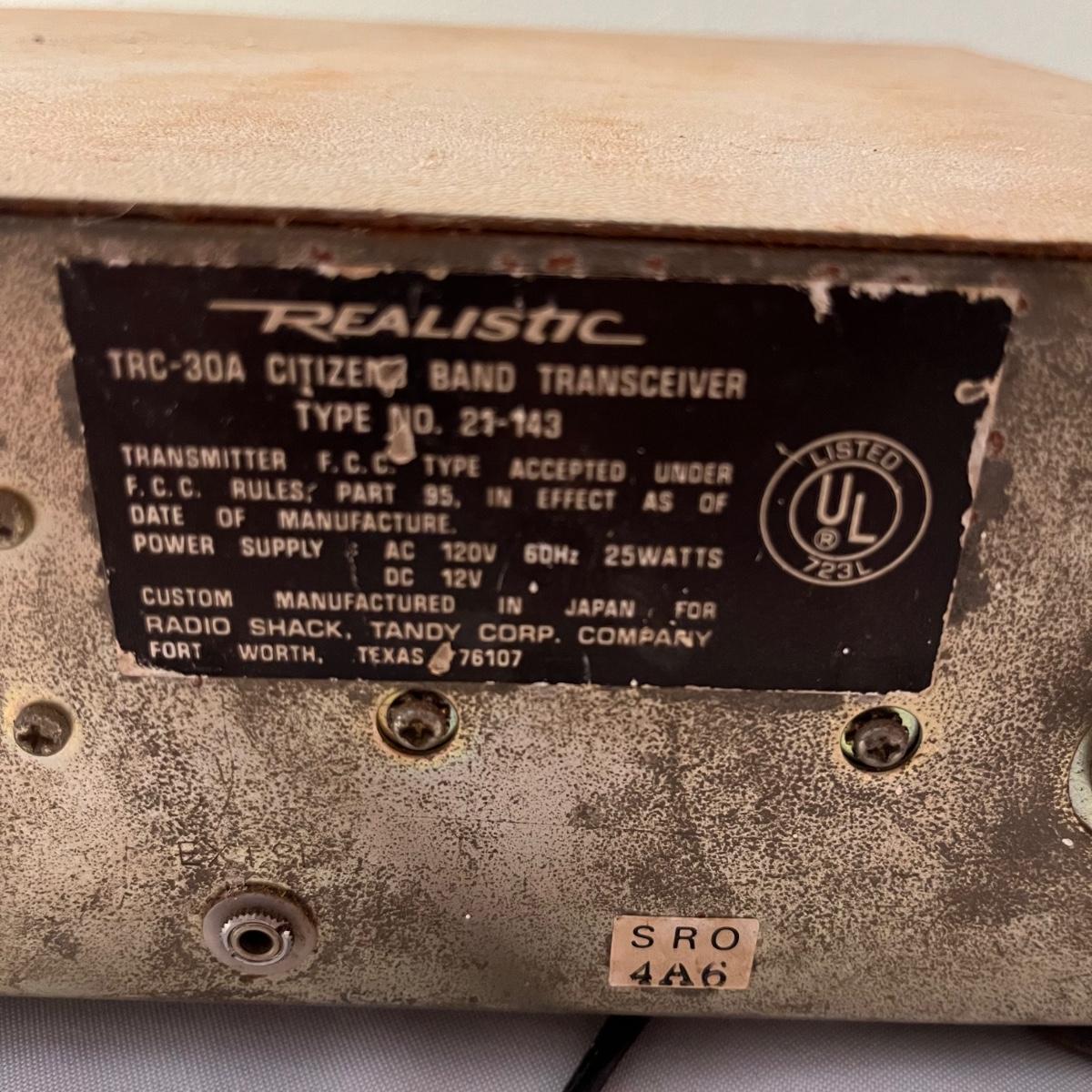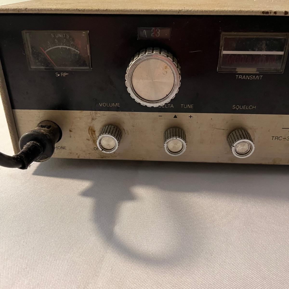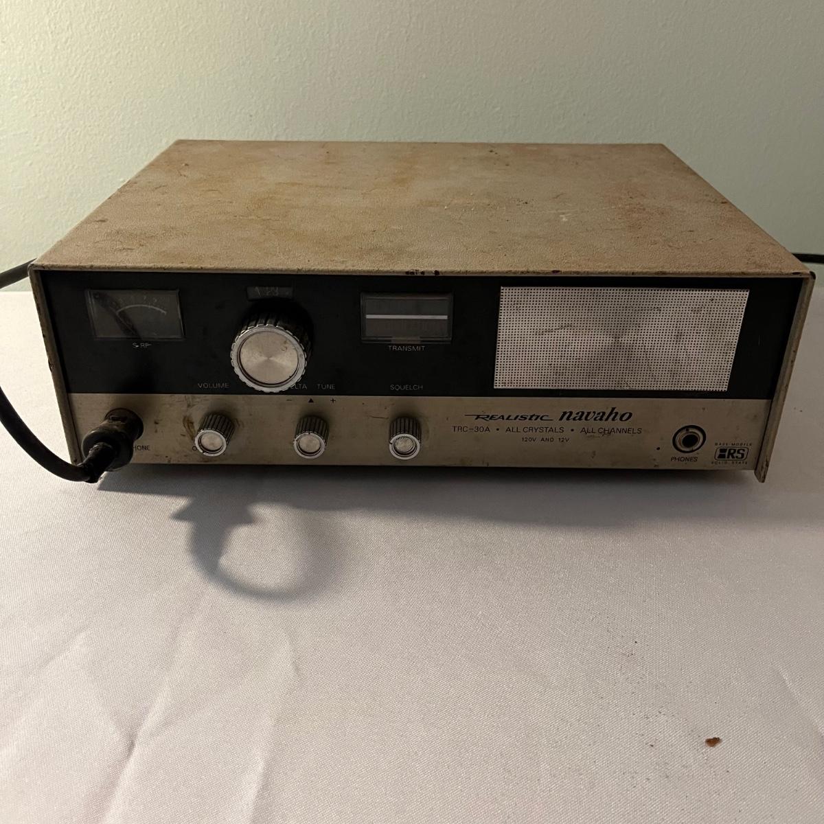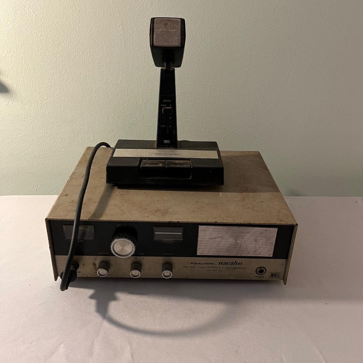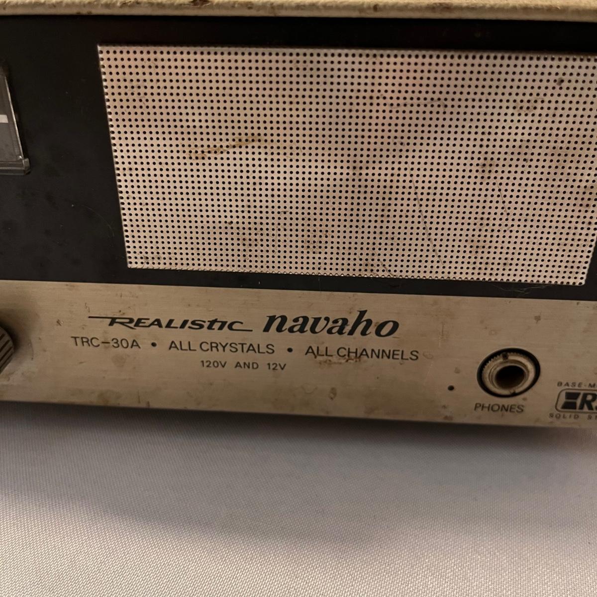 Lot includes Realistic Navaho 23 channel Citizen Band Transceiver radio model # TRC-30A and a Realistic amplified dynamic microphone. CB powered on when tested and microphone appears to need batteries and has some rust on the bottom. CB measures 9” x 11.5” x 4”.