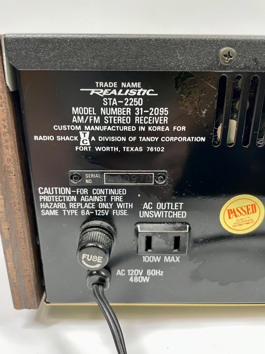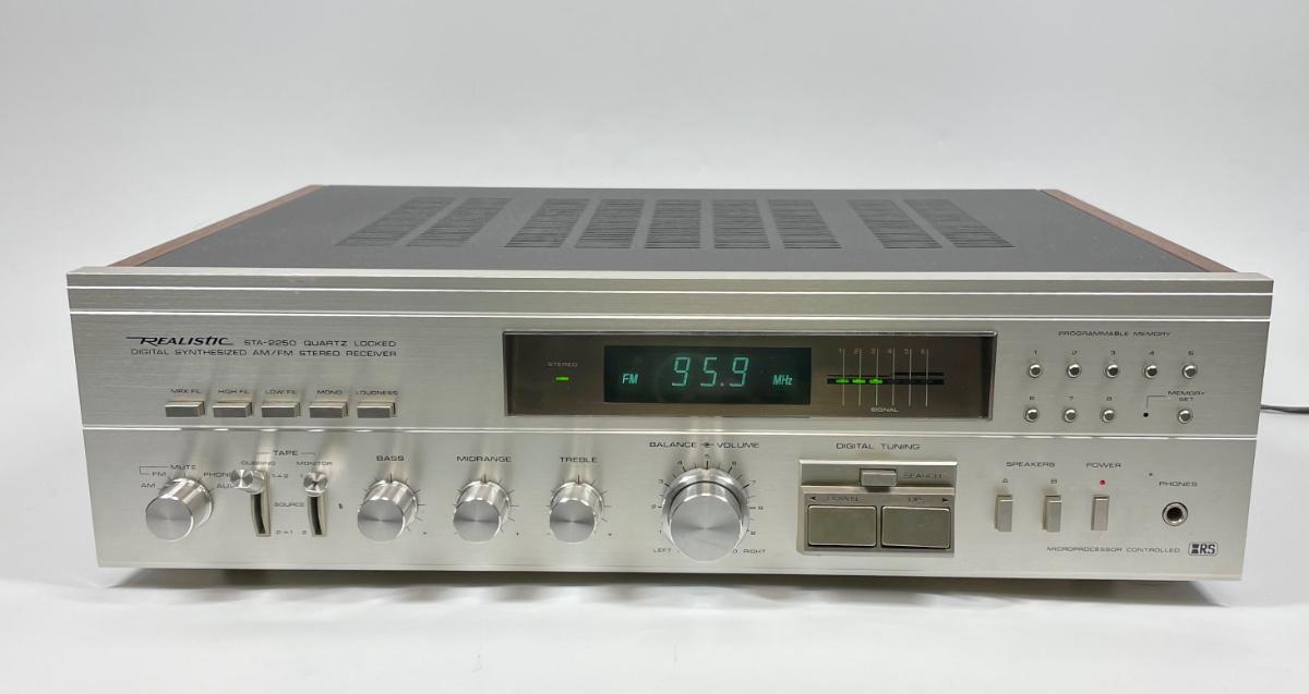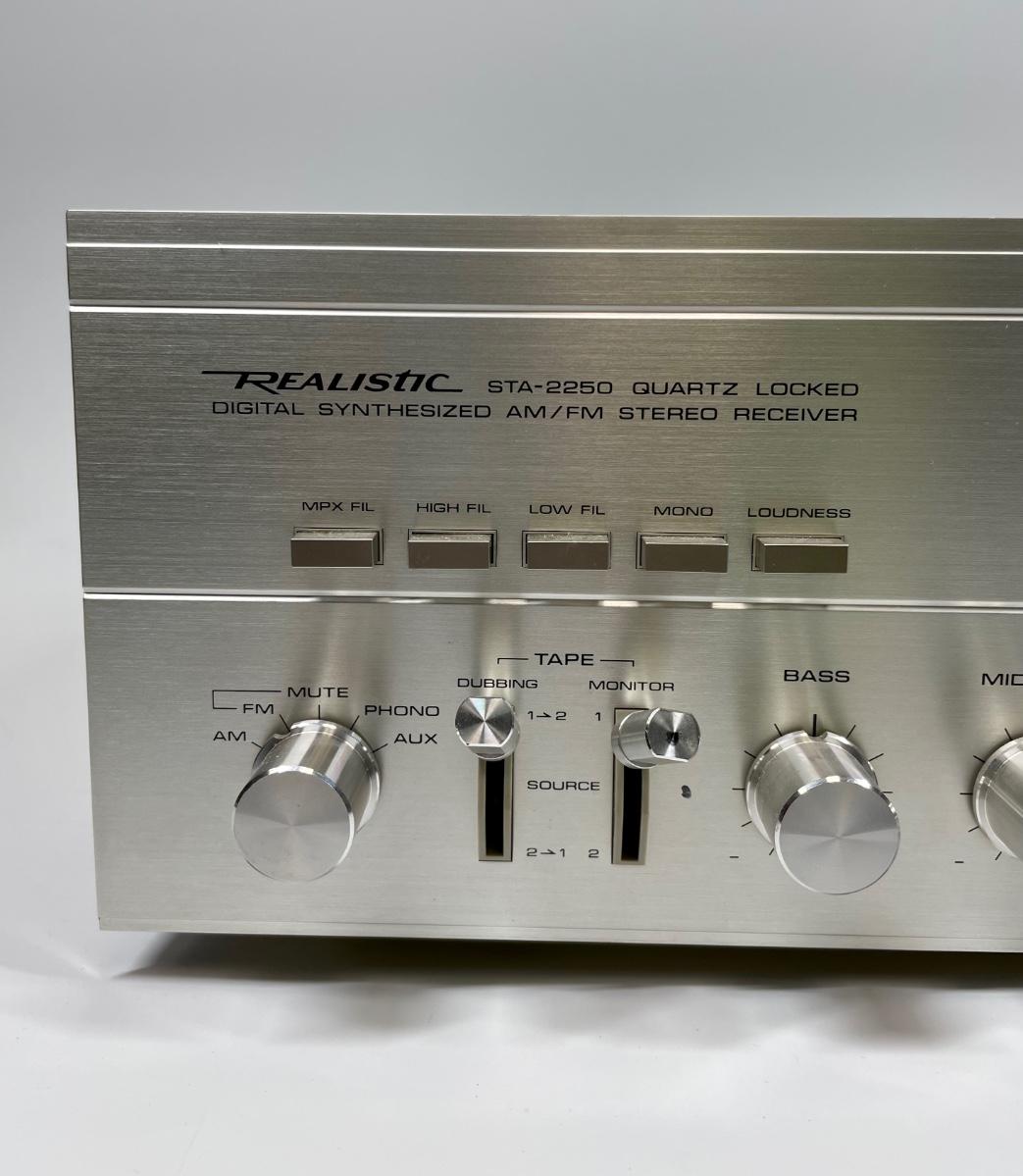 Realistic STA-2250 Quartz Locked Digital Synthesized AM-FM Stereo Receiver. Digital tuner with 1-button search. Model 31-2095. Made in Korea. 50 Watts per channel, A and B Speaker outputs, inputs for Tape 1, Tape 2, Phono and Aux. Powers up and switches between functions as expected. No speakers were available to test further.