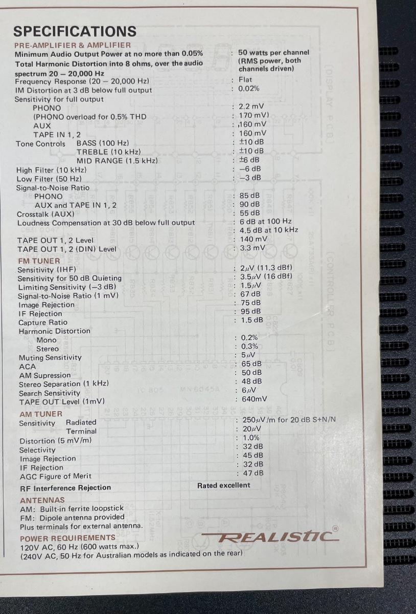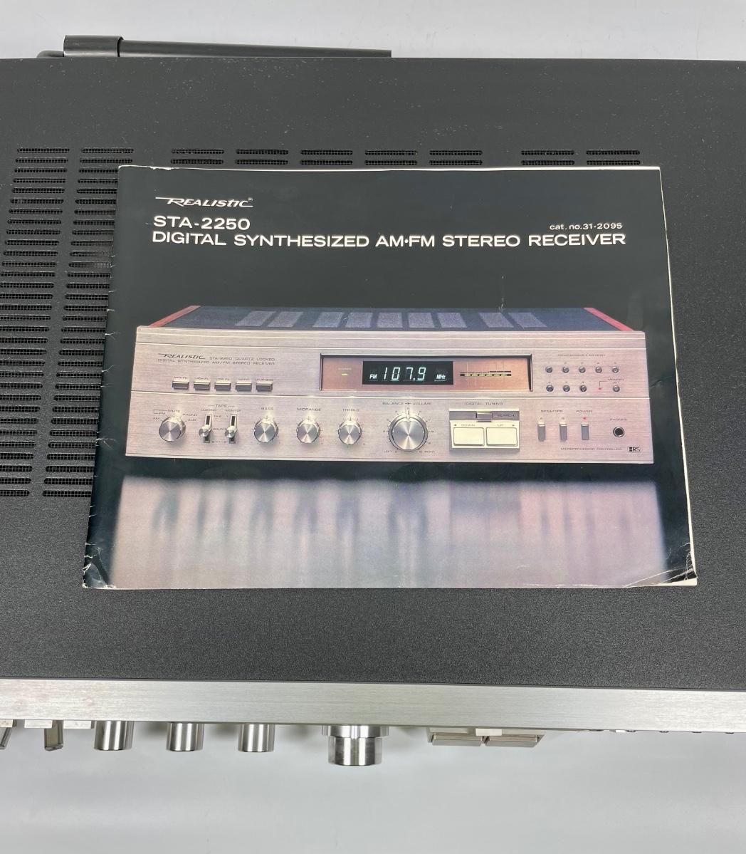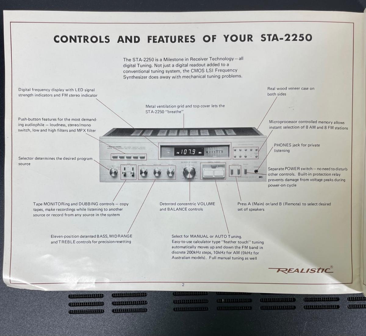 Realistic STA-2250 Quartz Locked Digital Synthesized AM-FM Stereo Receiver. Digital tuner with 1-button search. Model 31-2095. Made in Korea. 50 Watts per channel, A and B Speaker outputs, inputs for Tape 1, Tape 2, Phono and Aux. Powers up and switches between functions as expected. No speakers were available to test further.