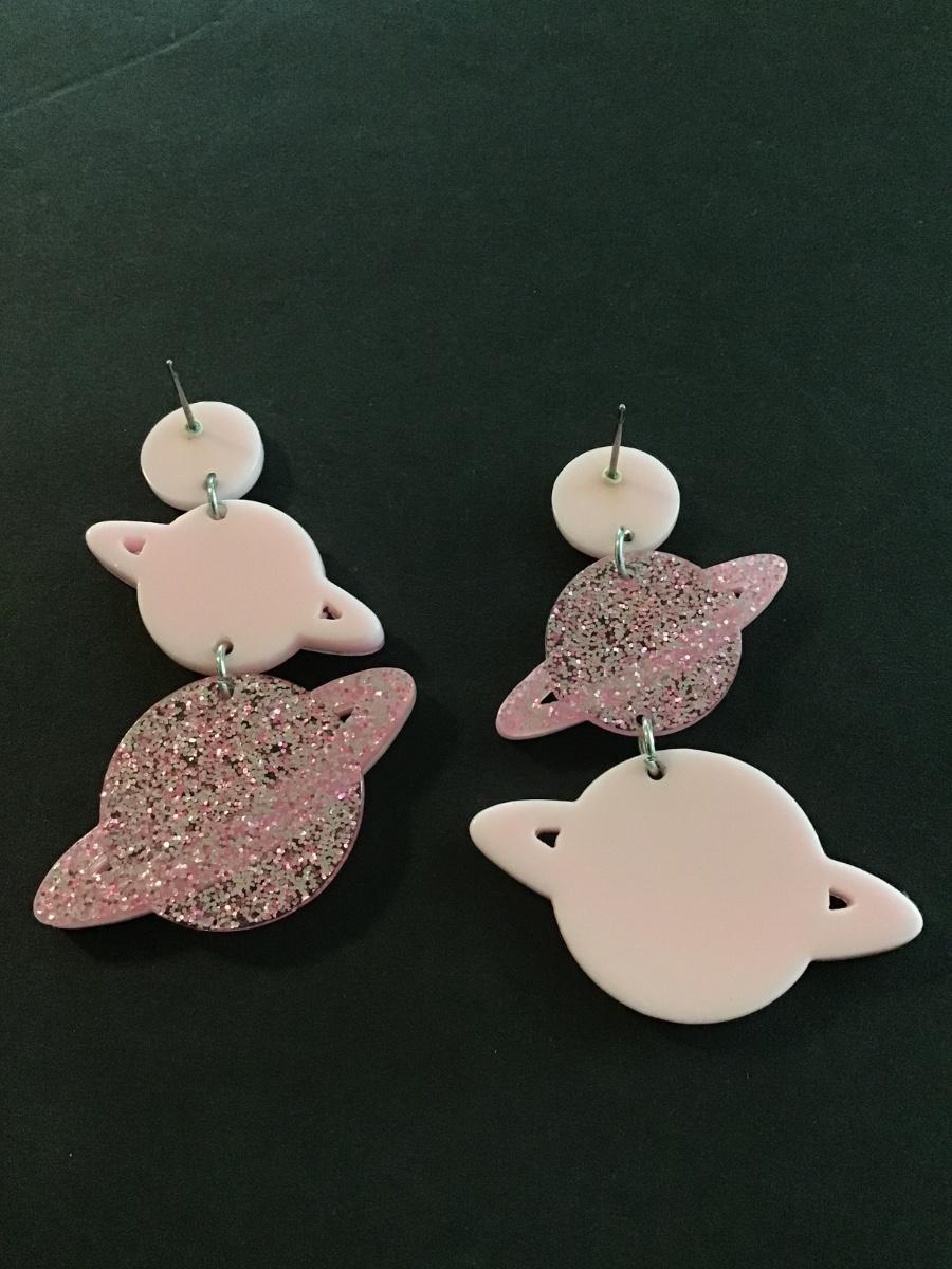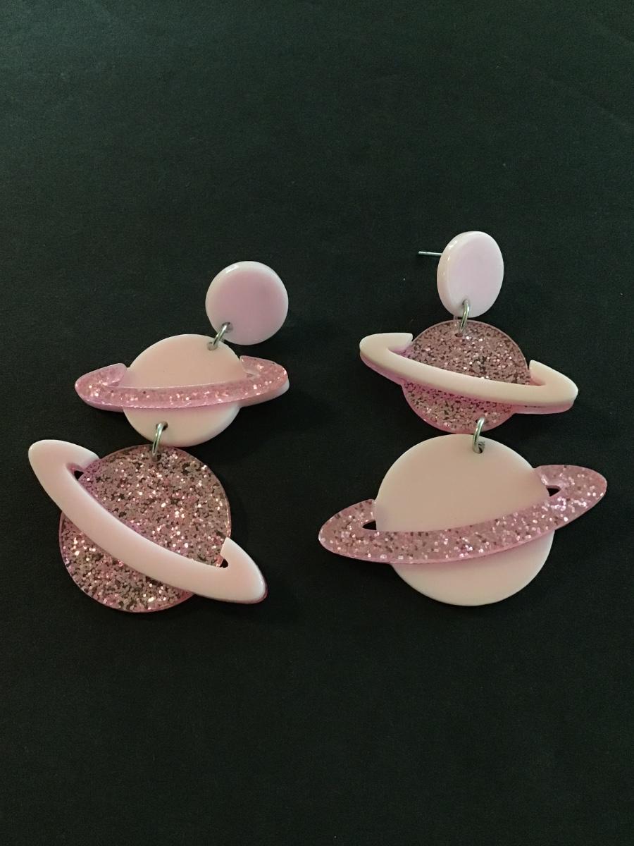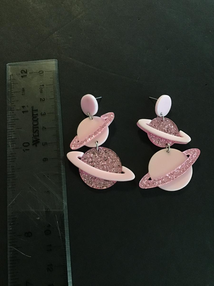 Really cute sparkly pink acrylic Saturn dangle earrings