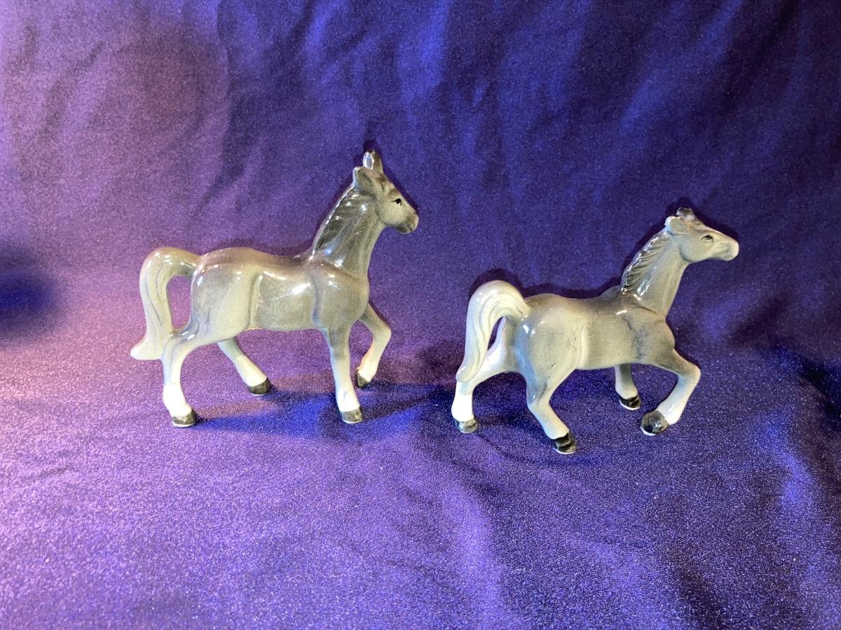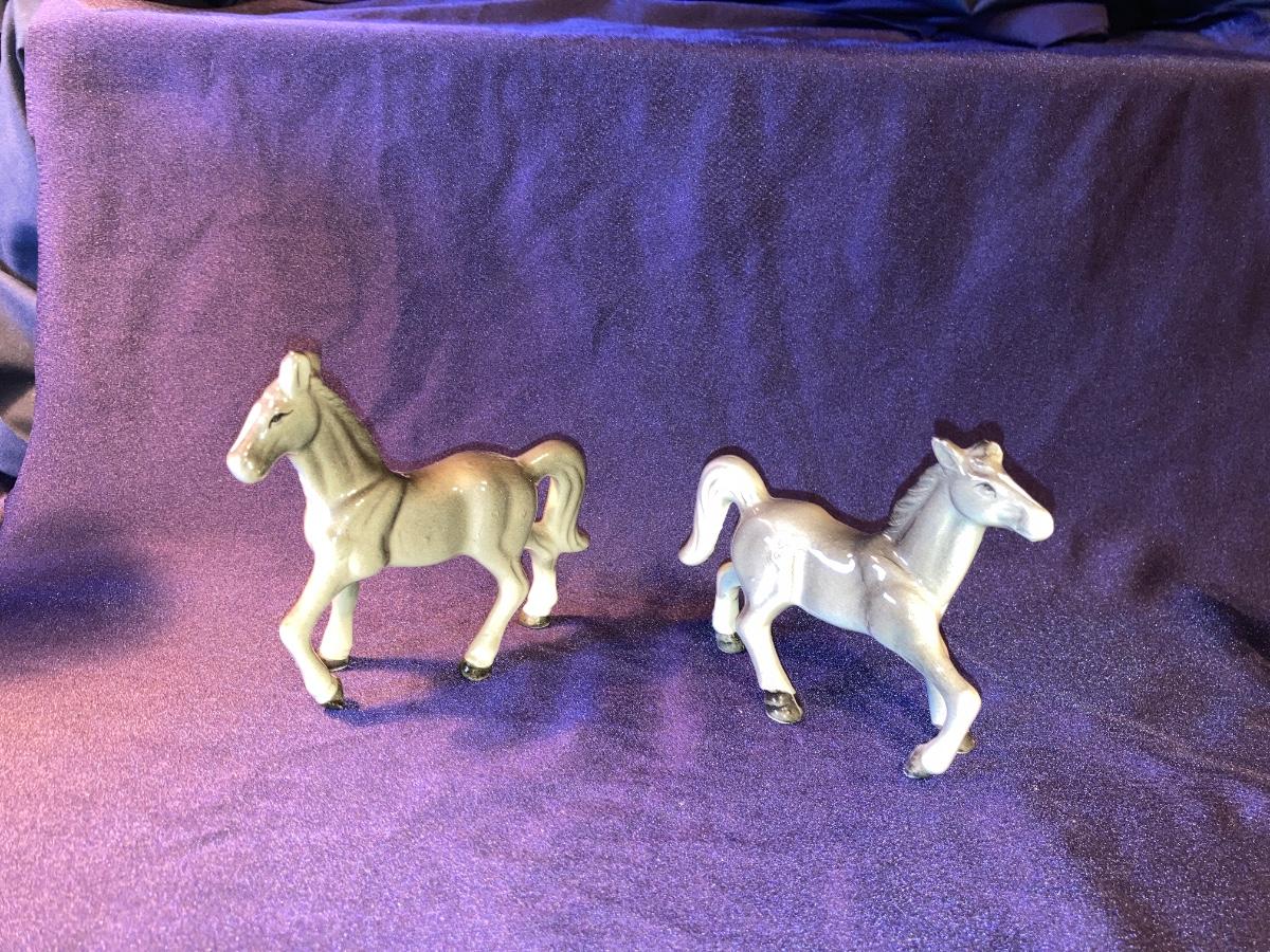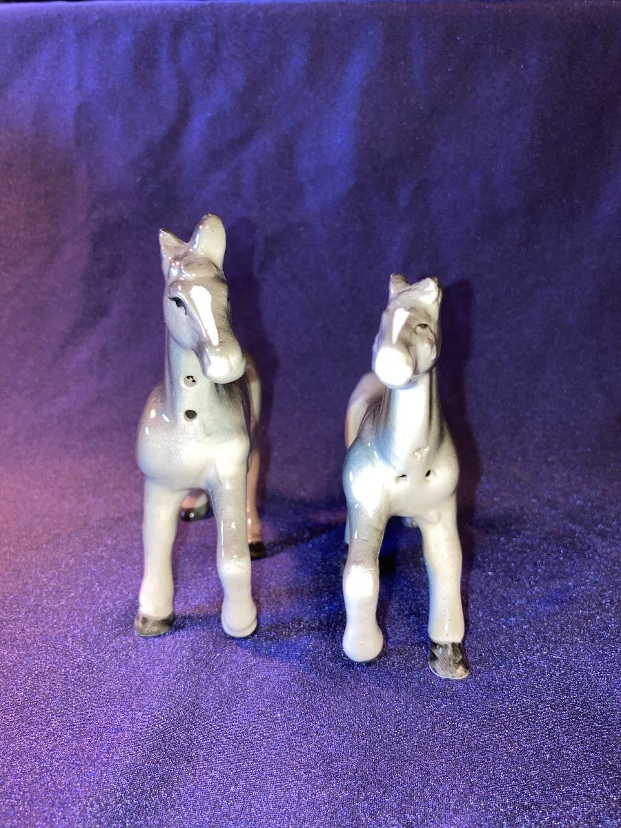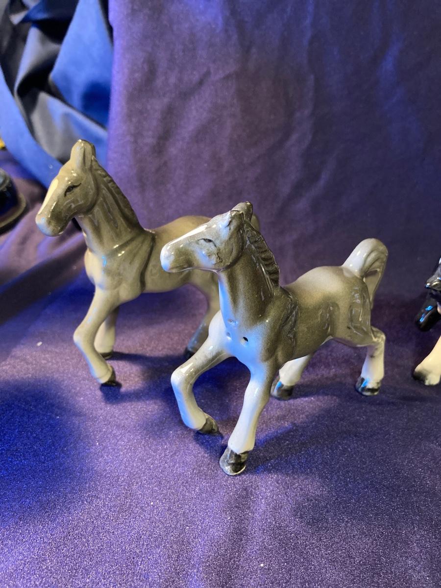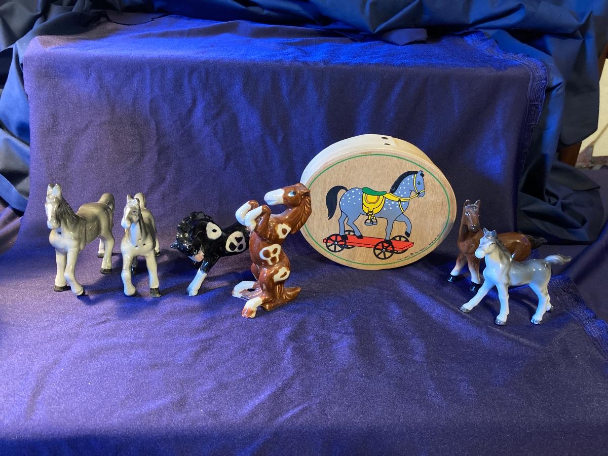 REALLY NEAT OLD SALT AND PEPPER SHAKER HORSES AND ALSO HORSE FIGURINES AND WOODEN BOX