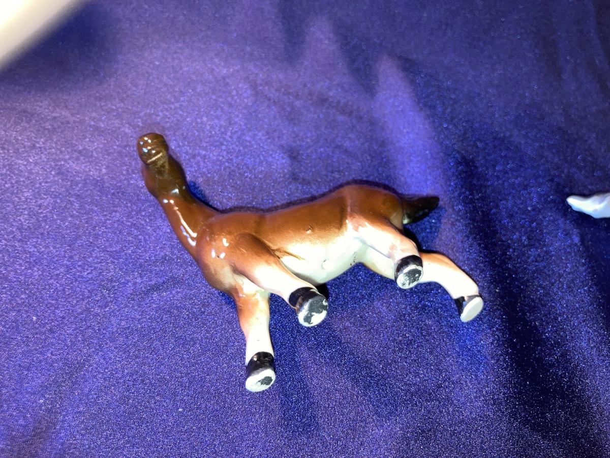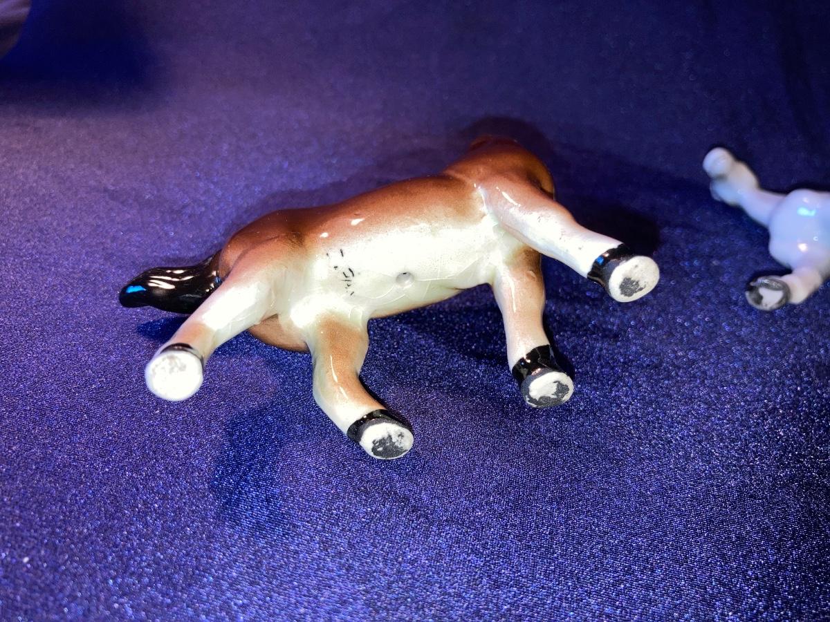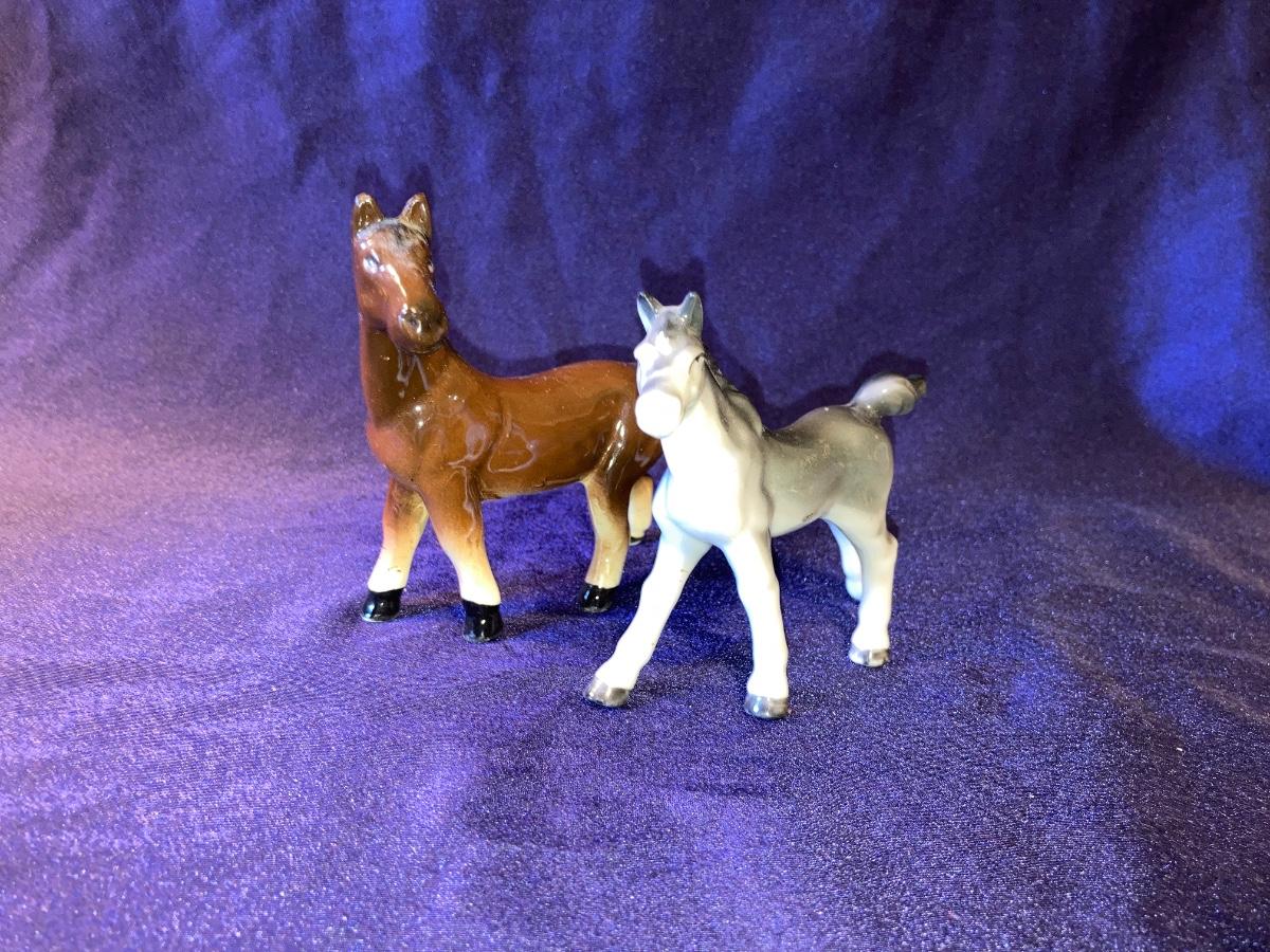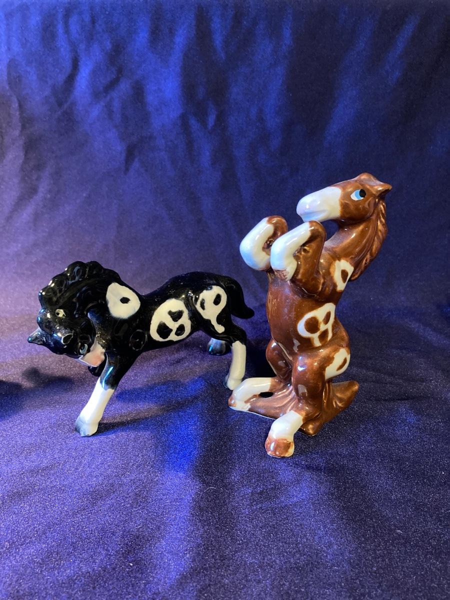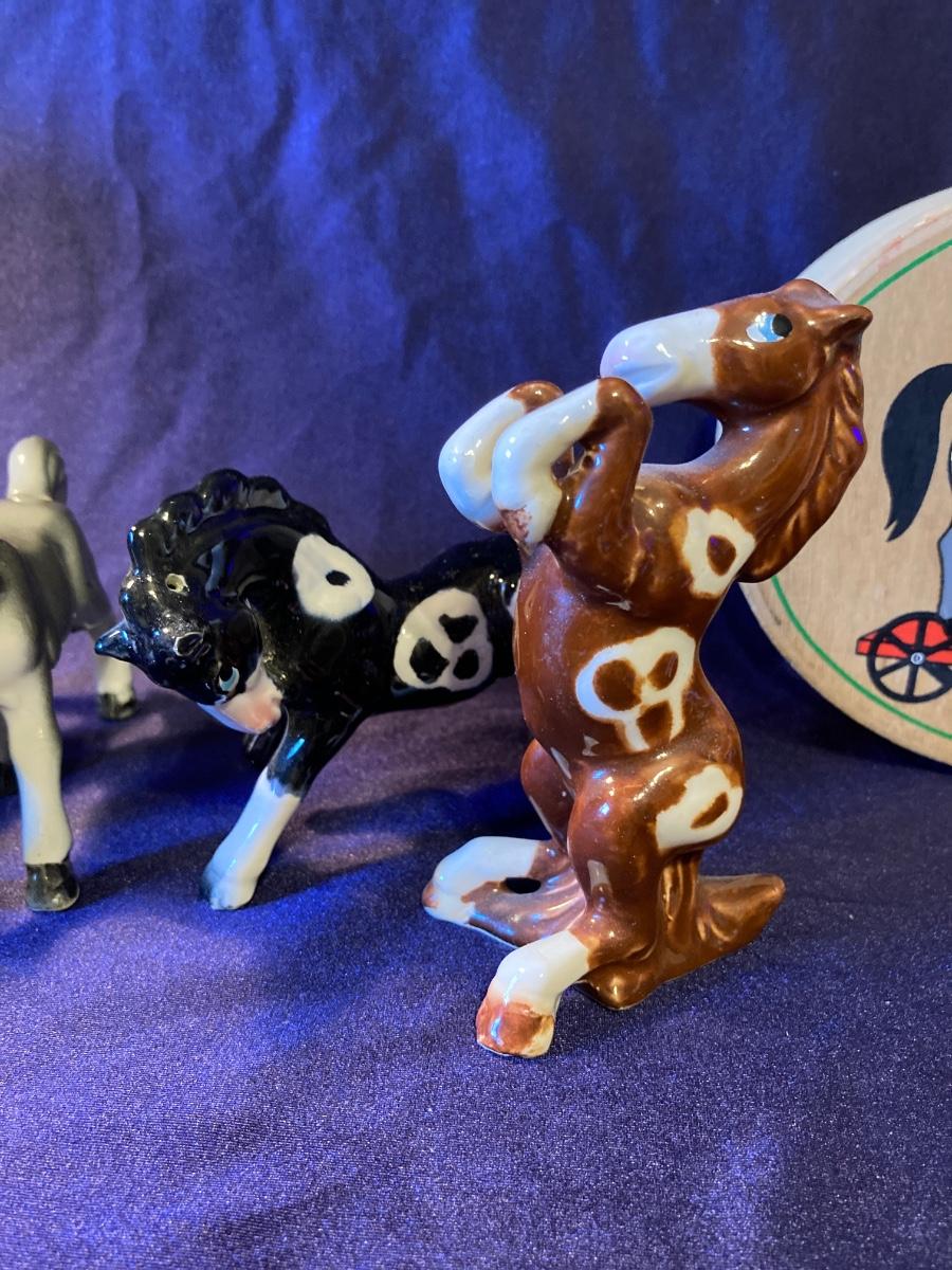 REALLY NEAT OLD SALT AND PEPPER SHAKER HORSES AND ALSO HORSE FIGURINES AND WOODEN BOX