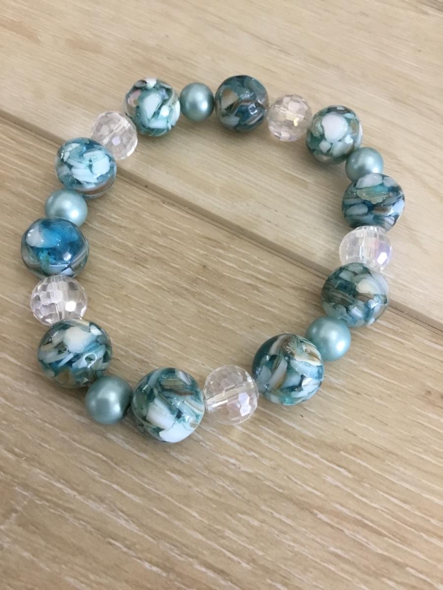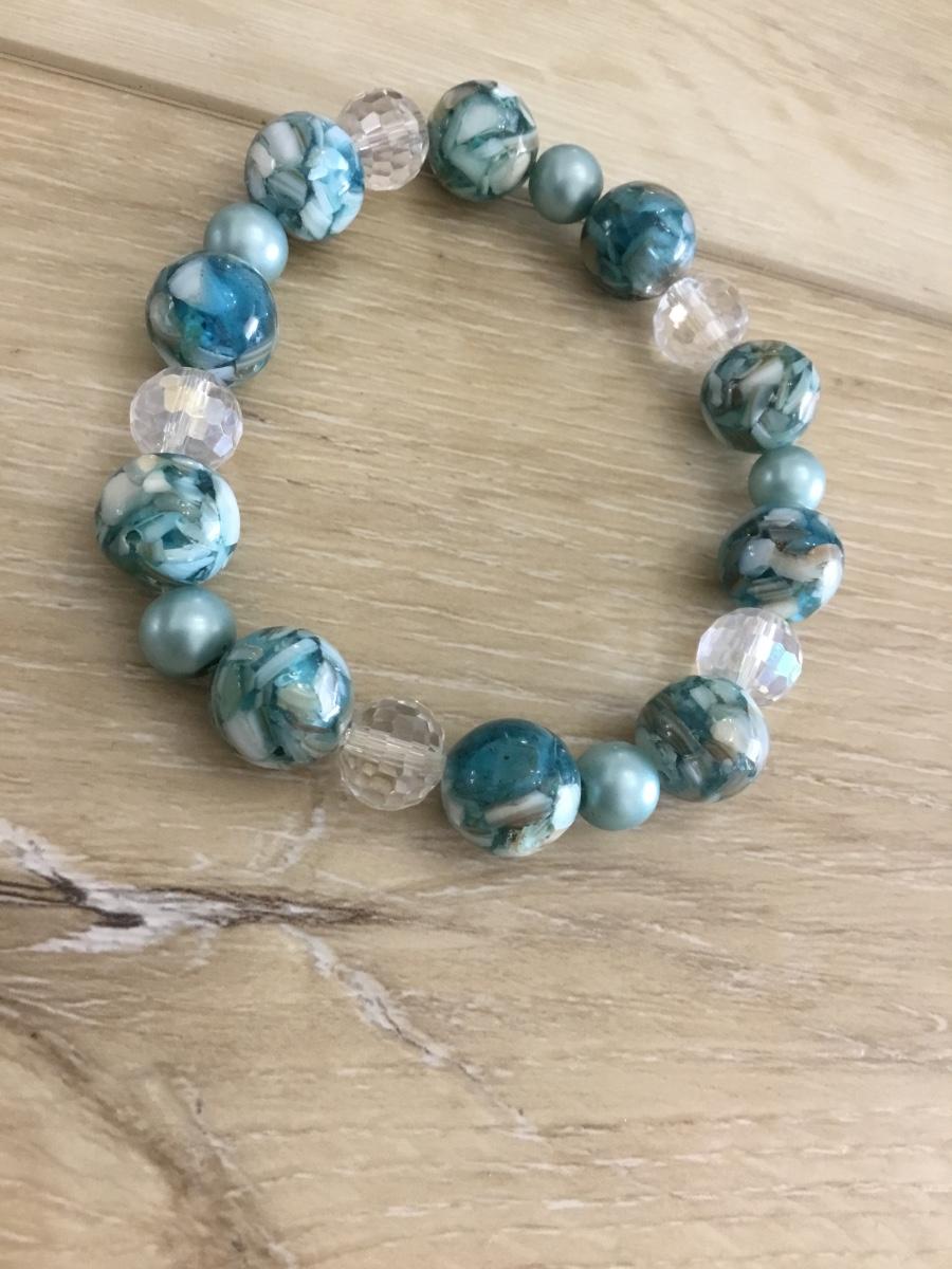 Really pretty Blue swirl glass bead, and Crystal bead stretchy bracelet