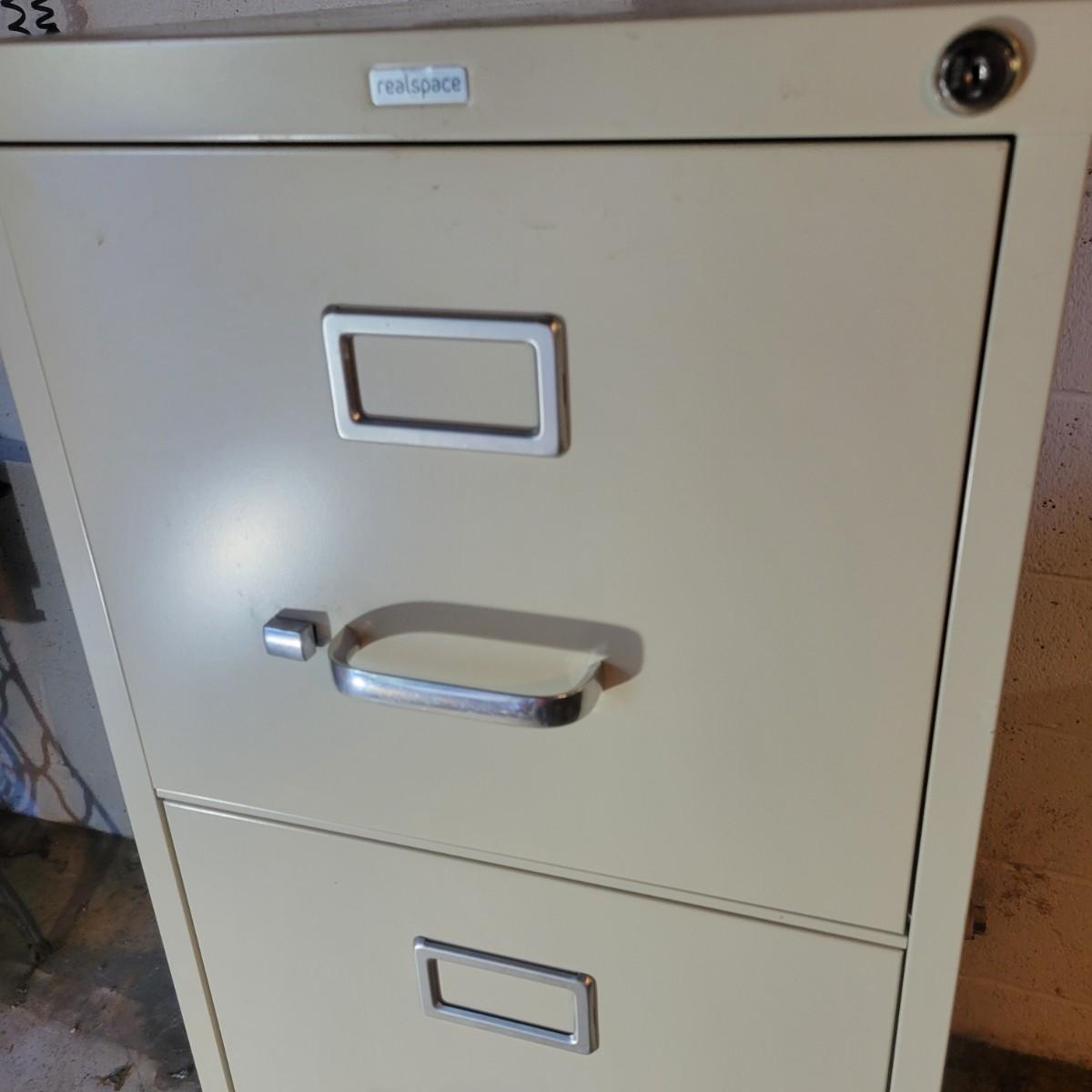 A Realspace four drawer filing cabinet with a lock in good condition with no notable damage. There is not a key for this cabinet, but could likely be easily replaced by contacting the manufacturer. Measures approximately 15" x 27" x 52" Local pickup only