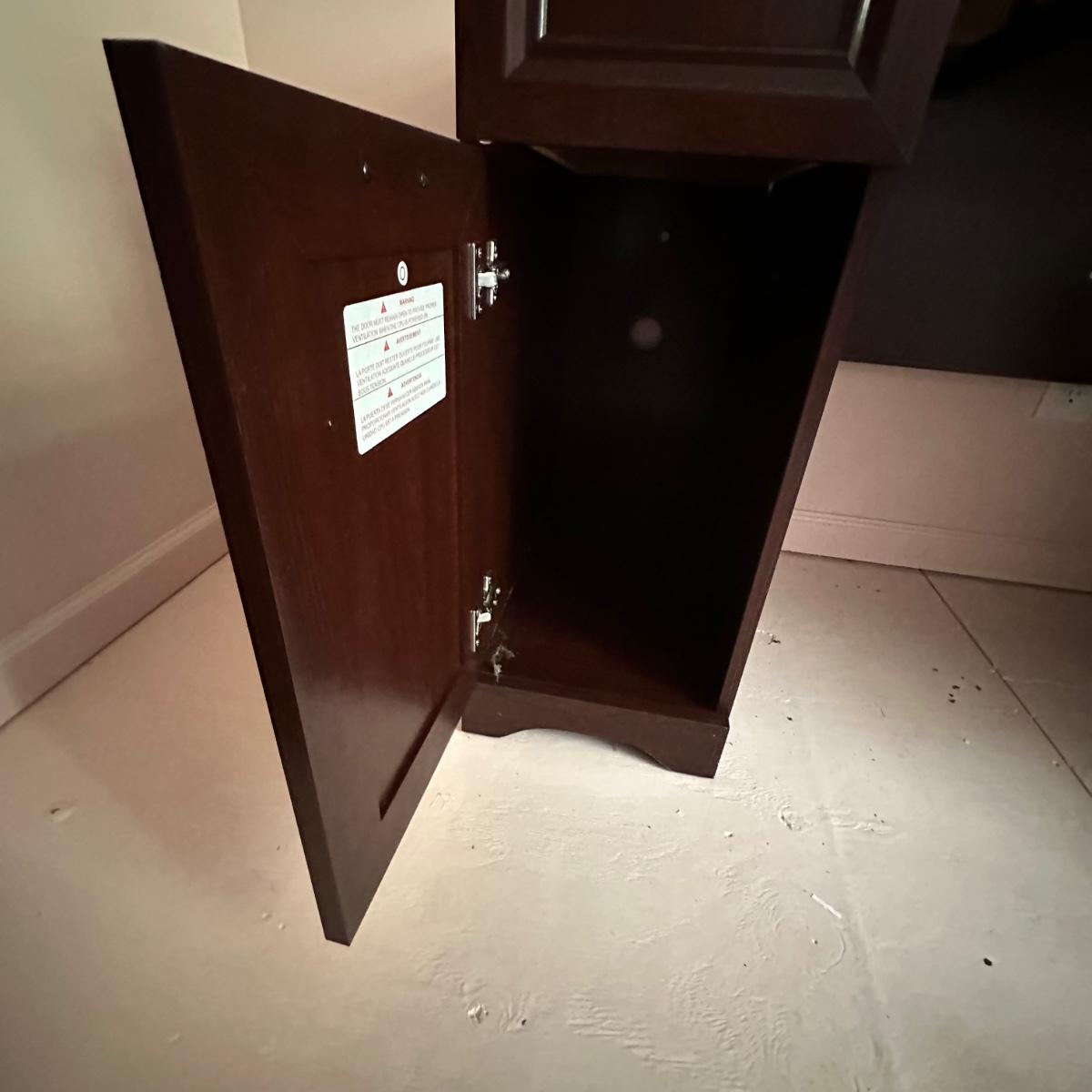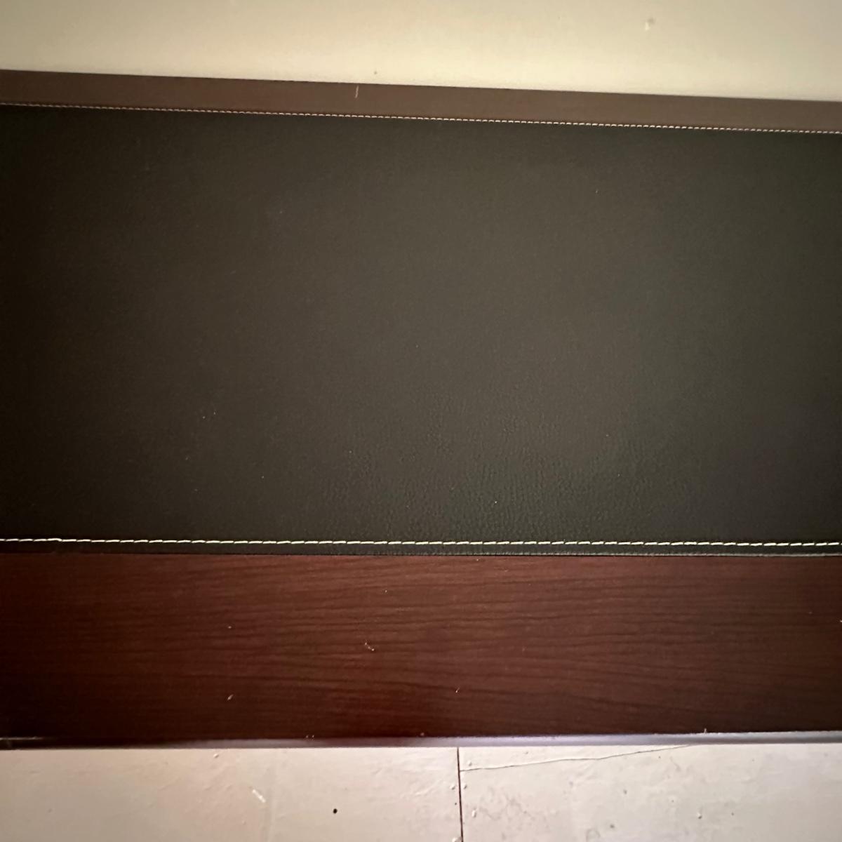 Office desk with three standard drawers, one file drawer, keyboard drawer and tower cabinet. Appears to be faux leather desktop with white stitching and mahogany colored veneer. Veneer is chipped in two places on front edge of desk and is covered in clear tape. See photos. Measures 59” X 23” X 30”H. Assembly instructions included. Local pickup only. Winning bidder must bring assistance to help move and load this item due to its weight and/or size.