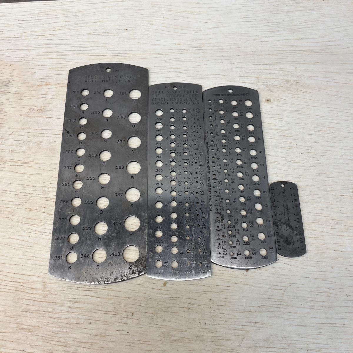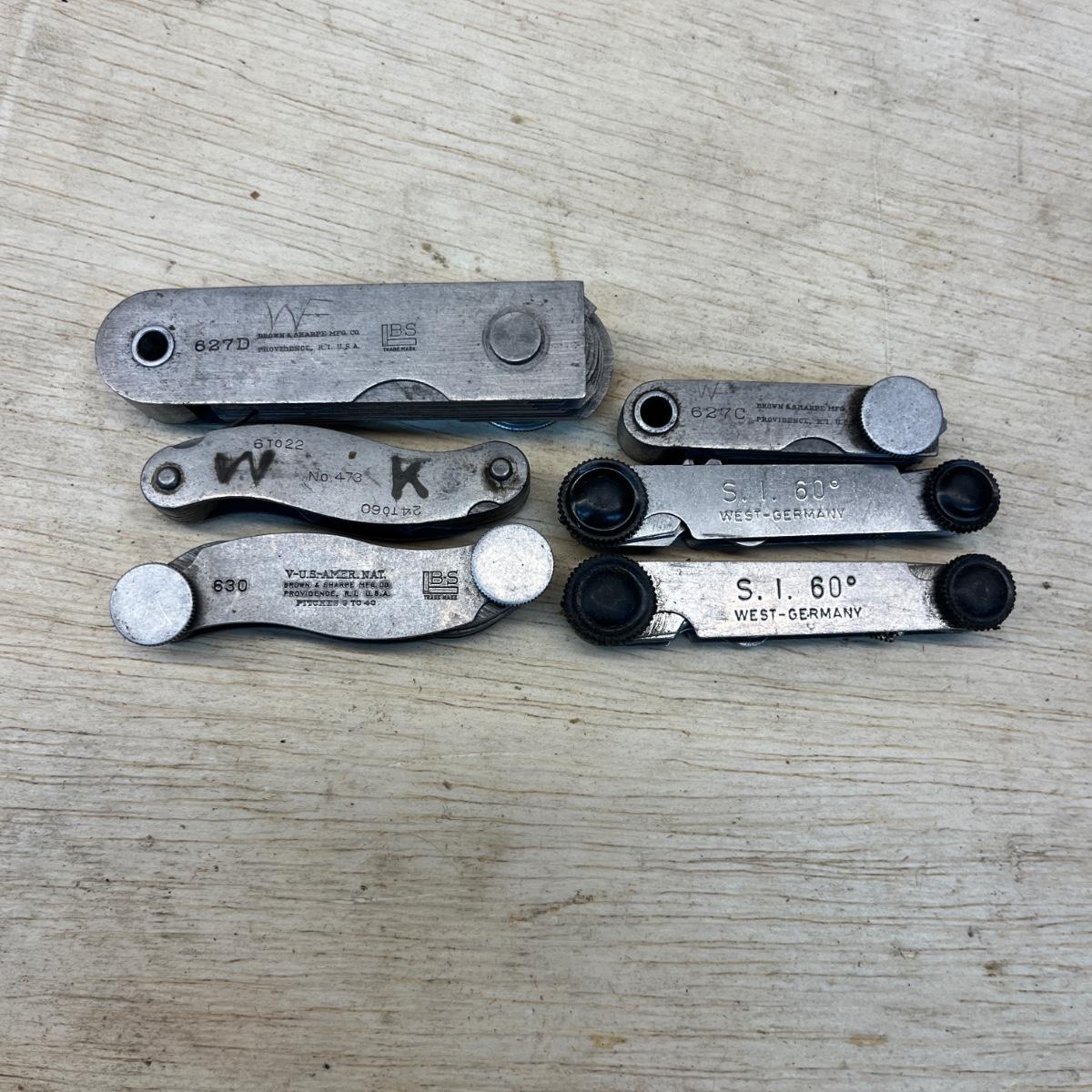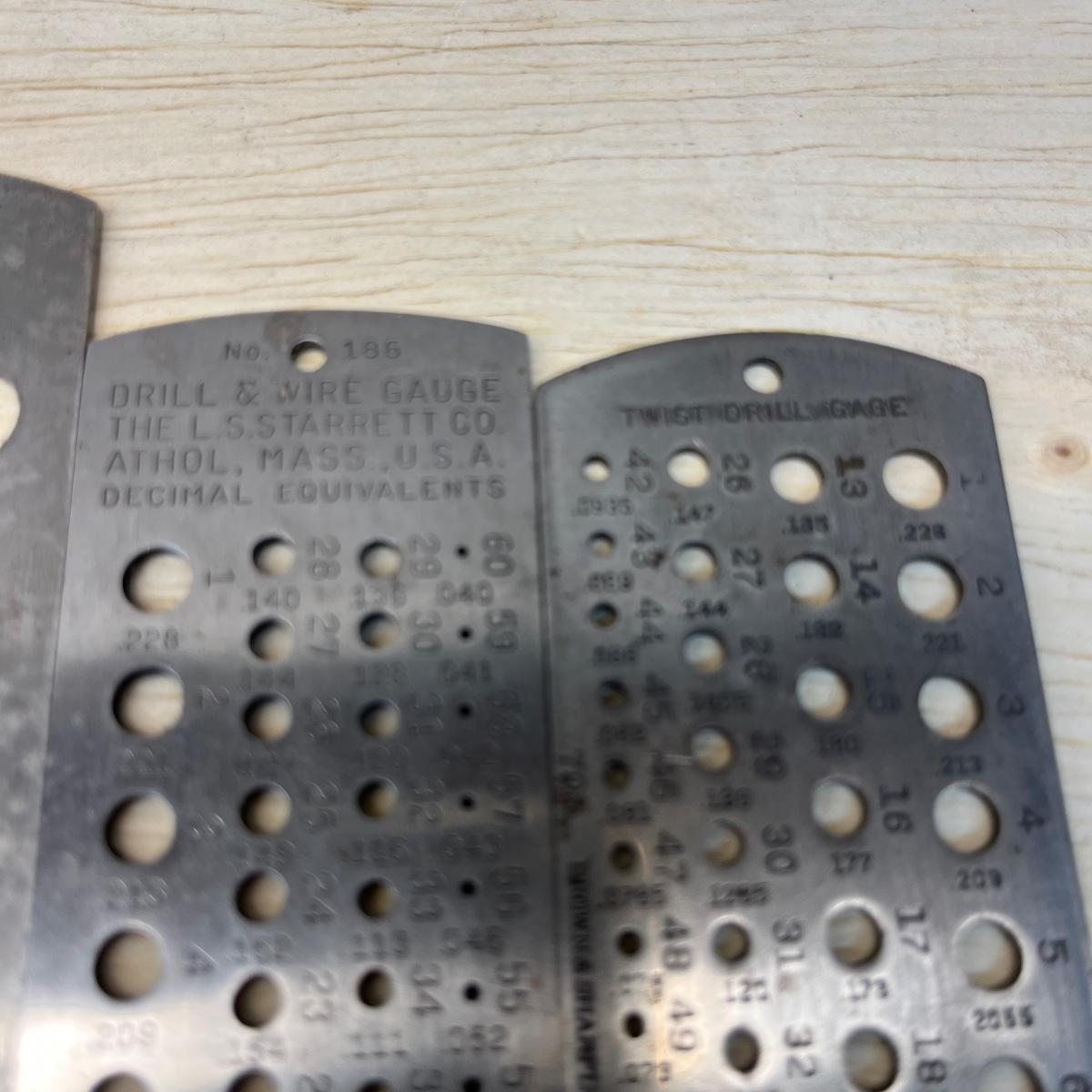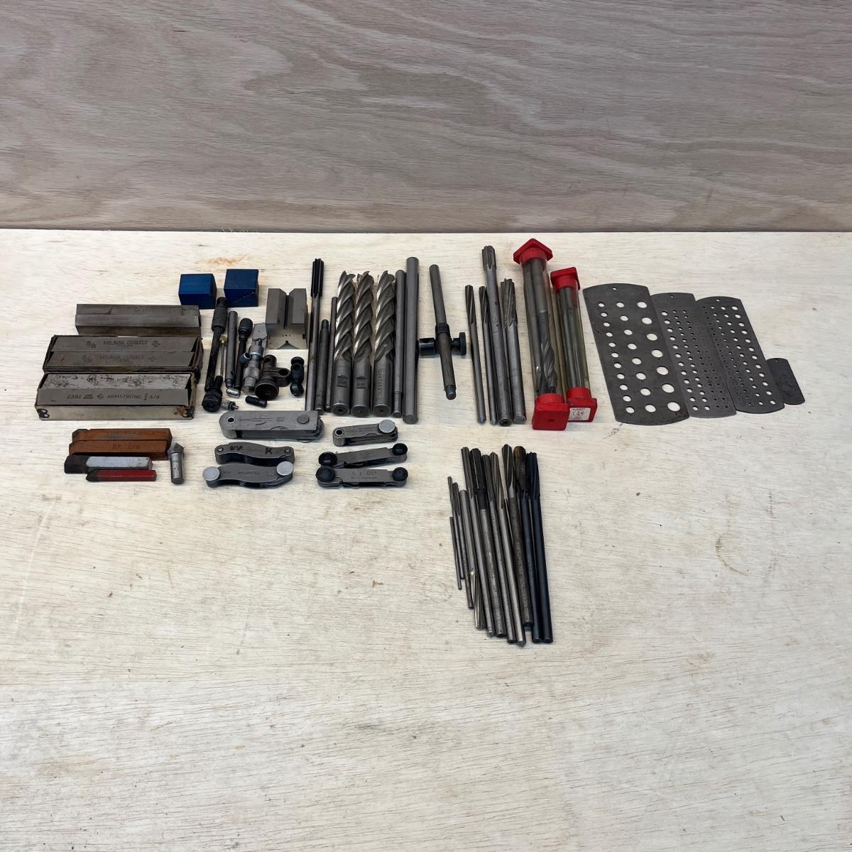 Lot includes Brown & Sharpe thread pitch gauge, Starrett thread pitch gauge, reamers, lathe cutting bits, drill bit gauges and more. Largest drill bit gauge measures 2.5” x 6.5”H.