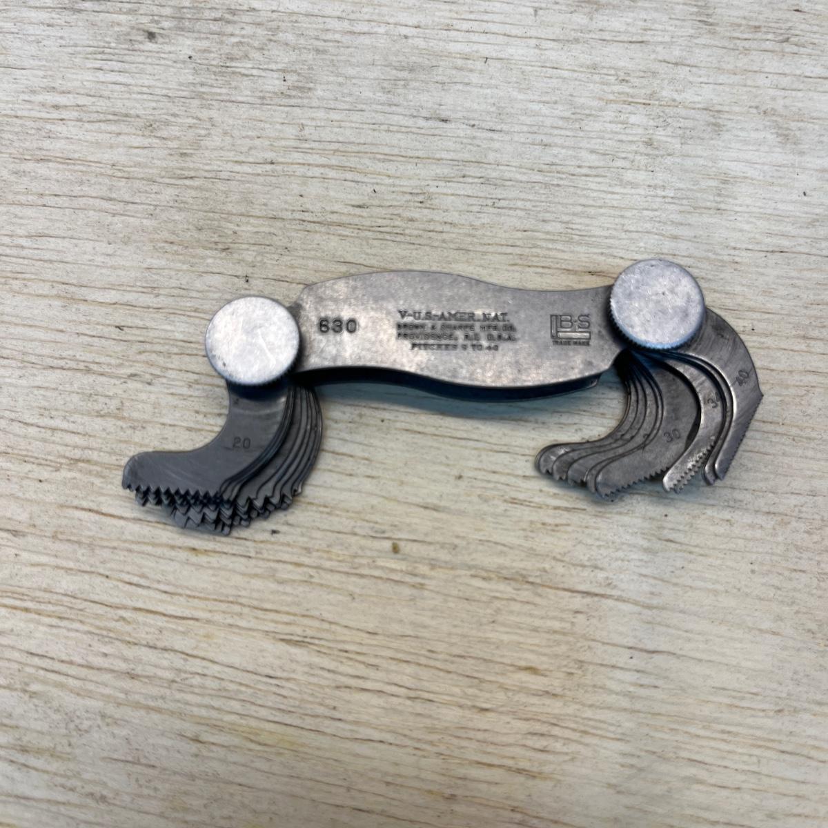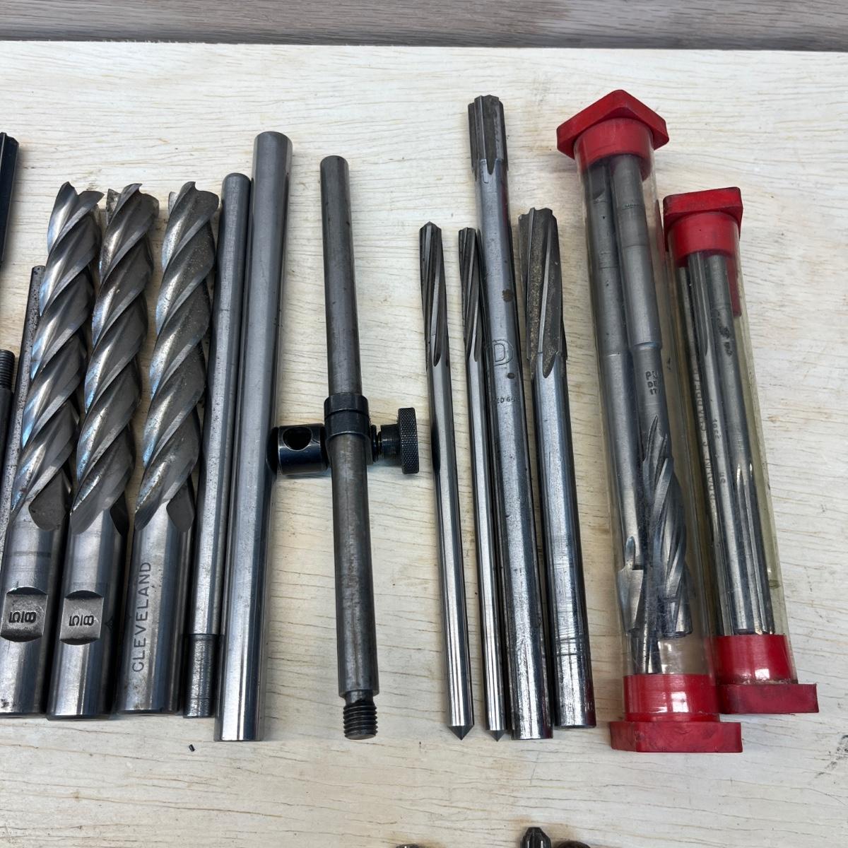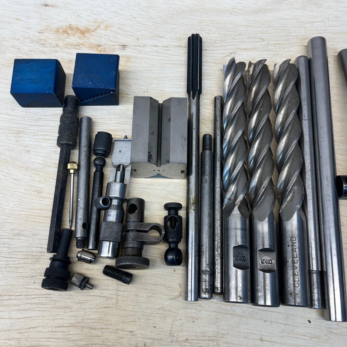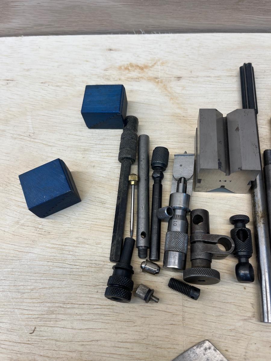 Lot includes Brown & Sharpe thread pitch gauge, Starrett thread pitch gauge, reamers, lathe cutting bits, drill bit gauges and more. Largest drill bit gauge measures 2.5” x 6.5”H.