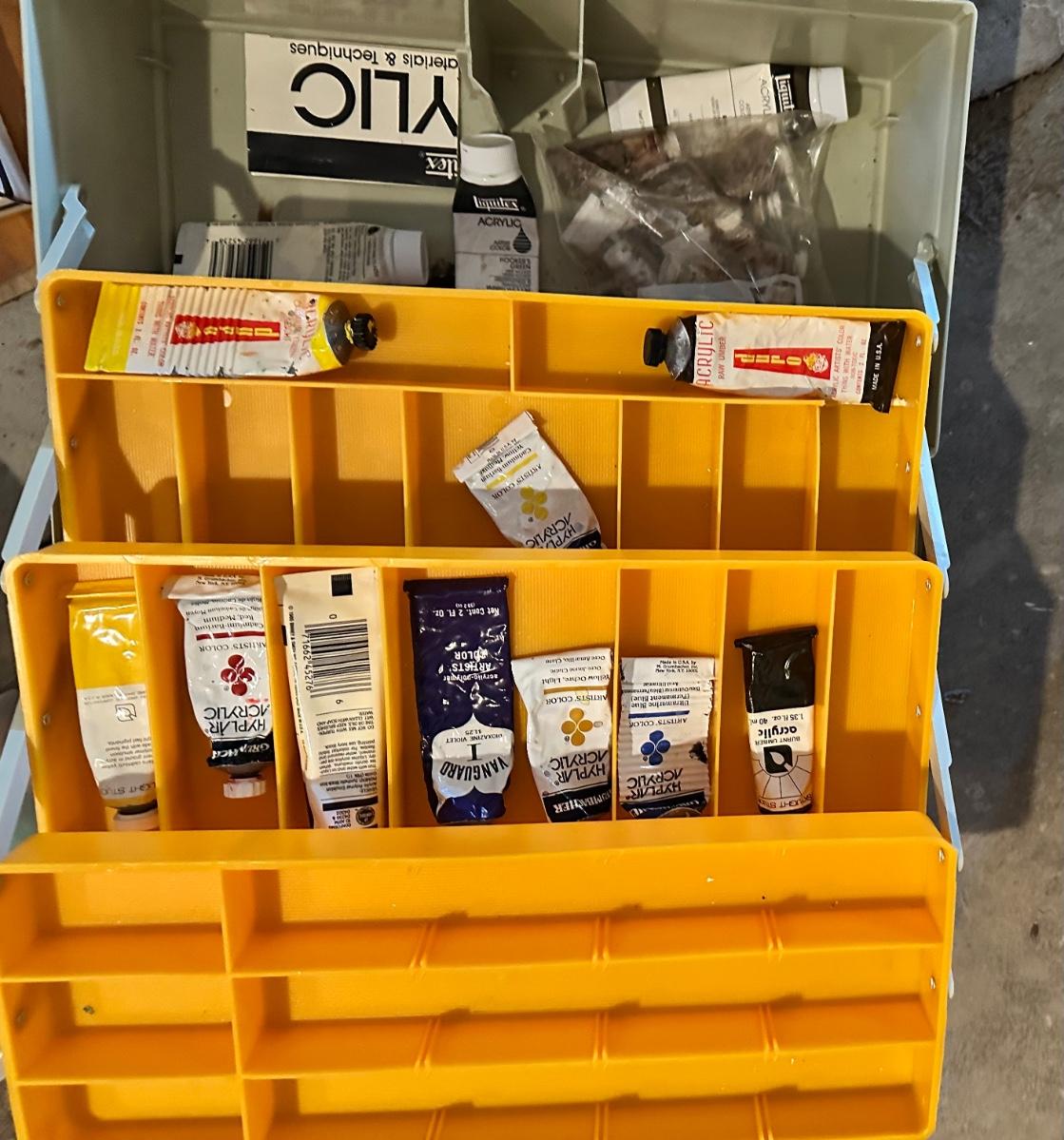Rebel tackle box with paints inside. Most are watercolors. Tackle box will have paints inside the box when you pick it up.