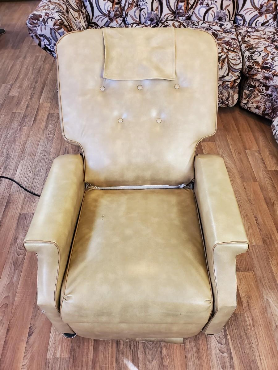 Electric reclining mechanism works well, Synthetic cover is torn. Chair back does not sit upright as it should, so it hyperextends backward.