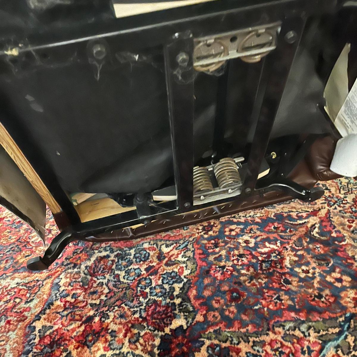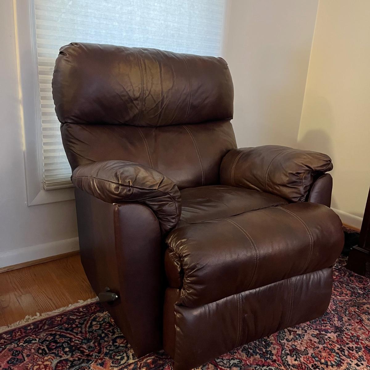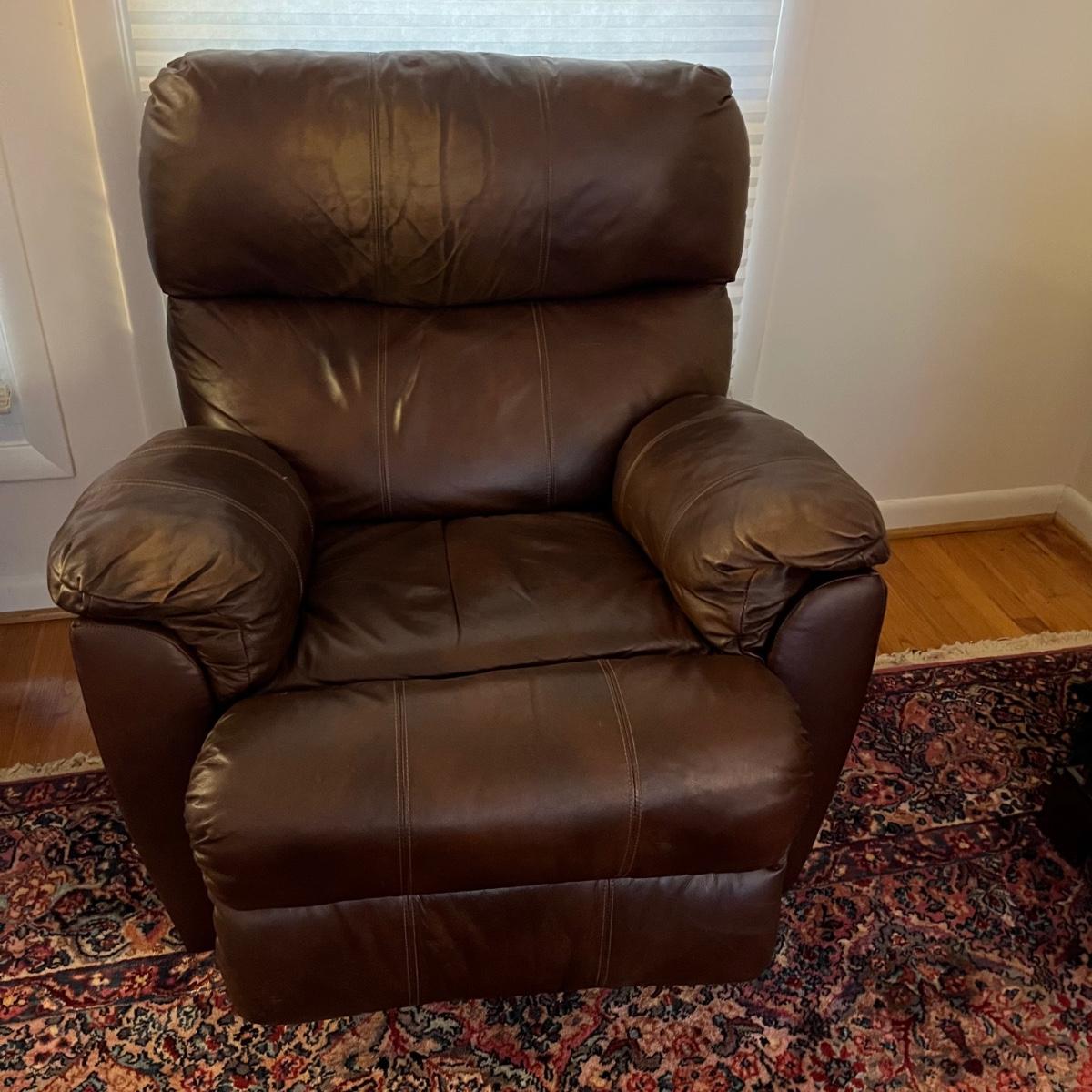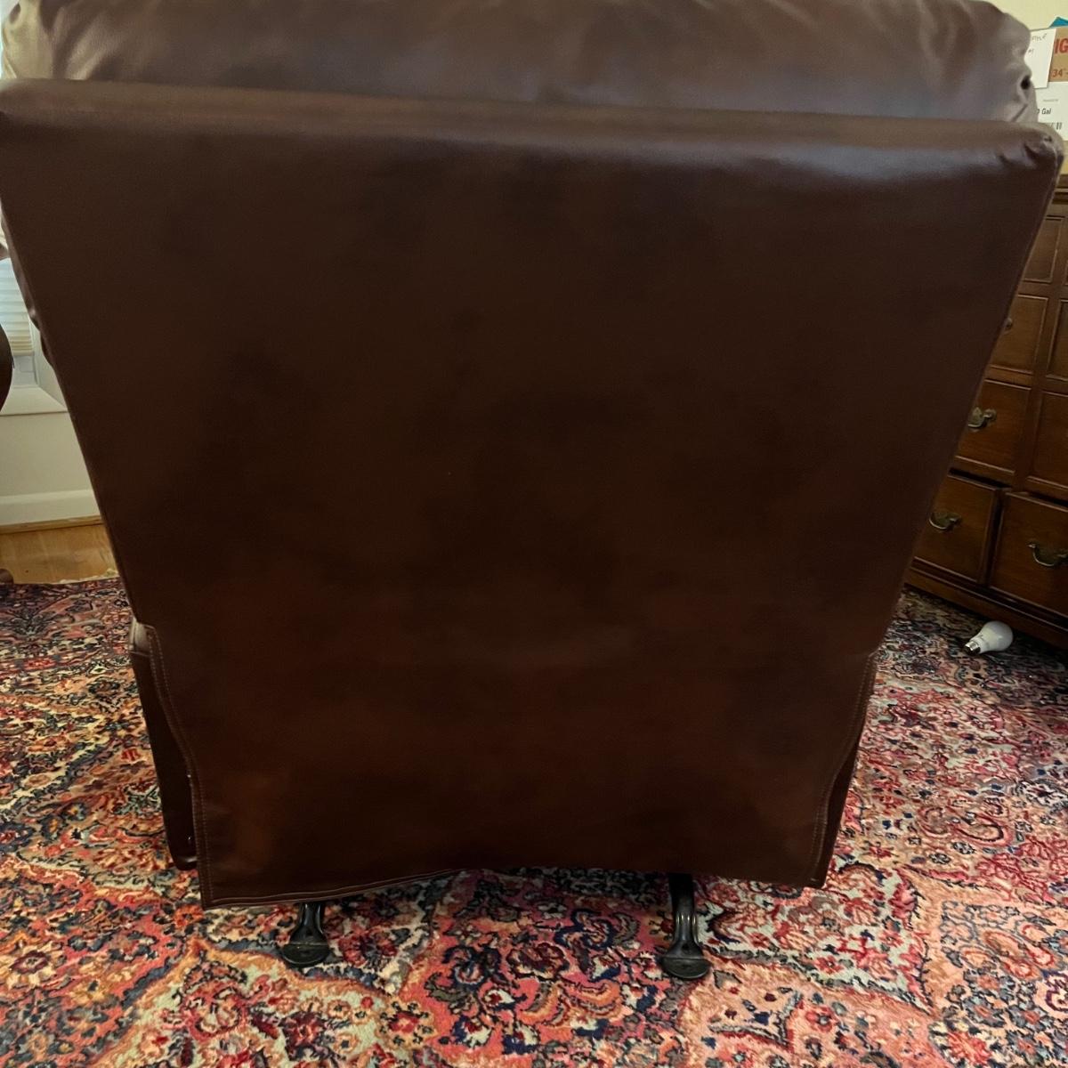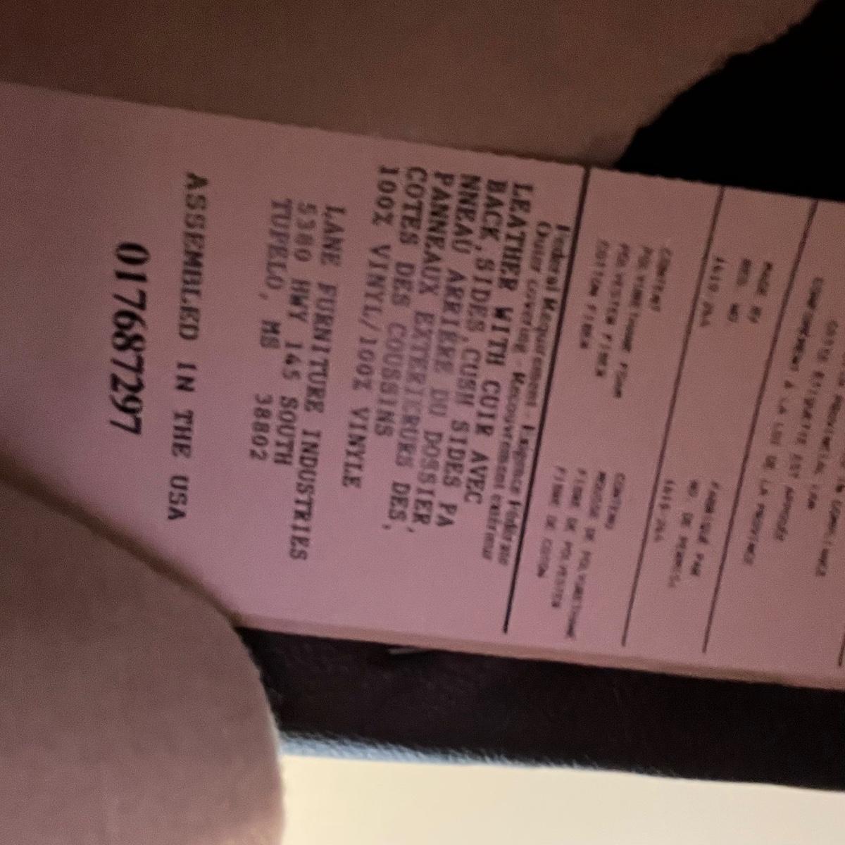 Lot includes a recliner by Lane industries that is leather and vinyl. Recliner measures 37” x 39” x 39” with a seat height of 18”. Recliner measures 66” long when open. Bring help item is substantial. Recliner has wear by the top where your head rest and handle has chew marks, see pictures.